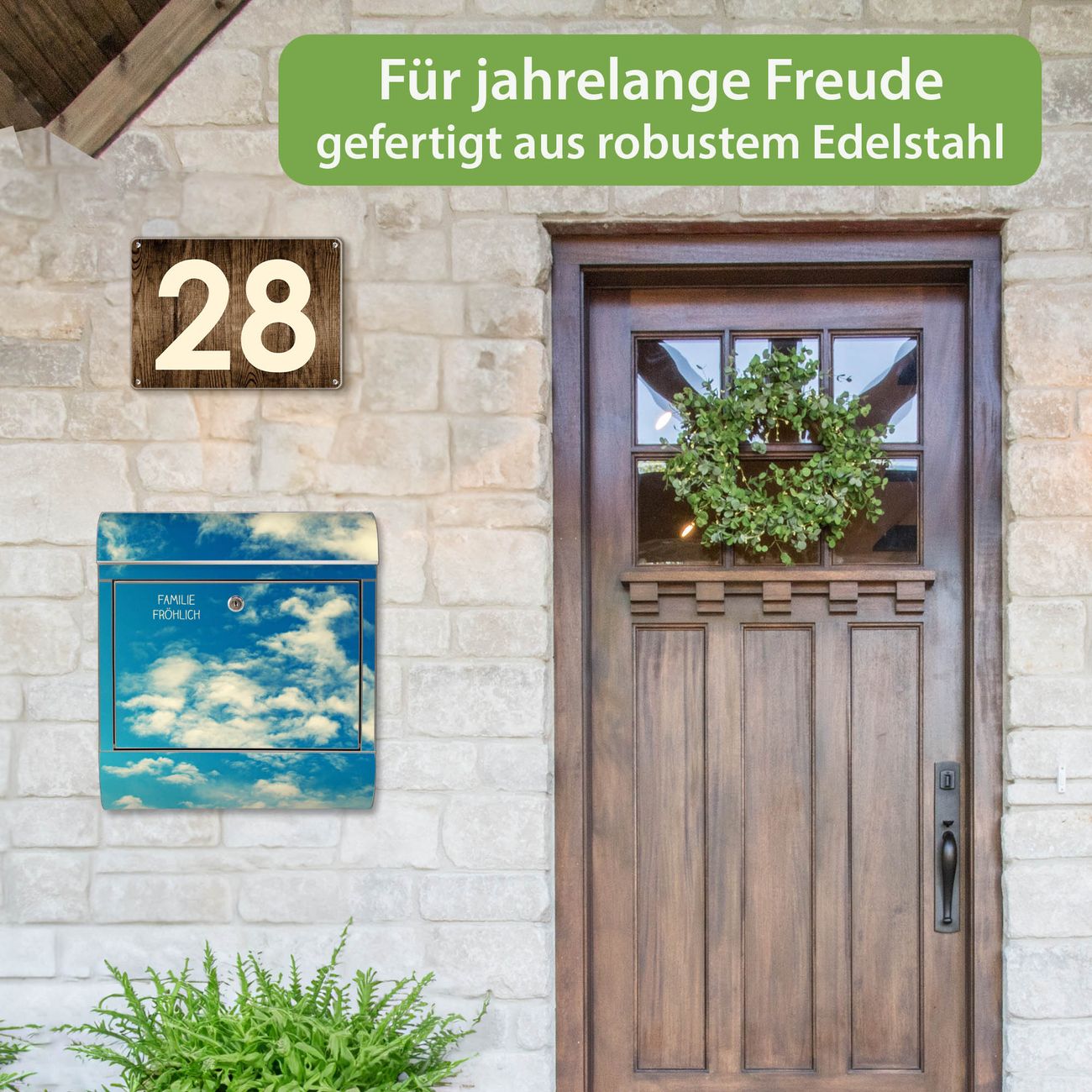 Der Vorschau-Text Familie Fröhlich wird durch Ihren persönlichen Wunschtext ersetzt. Die Schriftart und Farbe bleiben gleich wie in der Vorschau.