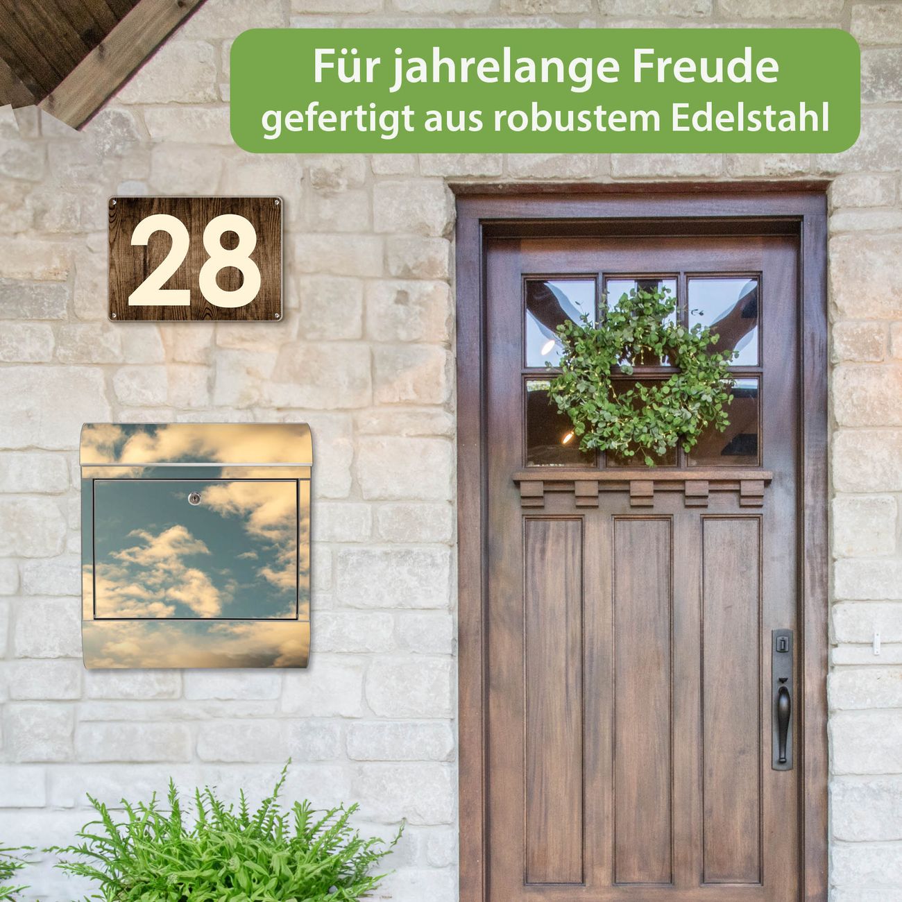 FUNKTION: Der banjado Edelstahl Briefkasten mit Motiv Motiv Wolken 6 bietet Ihnen mit seinem Fassungsvermögen genügend Platz auch für große A4 Sendungen. Das integrierte Zeitungsfach eignet sich hervorragend um unkompliziert die Tageszeitung zu fassen. Auf Wunsch können Sie bei uns den passenden Ständer kaufen und so aus dem Wandbriefkasten einen Standbriefkasten machen. DESIGN: Der Motivbriefkasten hat ein sehr ansprechendes und ausgefallenes Design, damit entlocken Sie Ihren Nachbarn und dem Postboten ein Lächeln. Heben Sie Sich ab von der tristen grauen Masse ohne auf Funktionalität zu verzichten. DETAILS: Der Design Briefkasten mit Motiv Motiv Wolken 6 besteht aus hochwertigem 18/0 Edelstahl. Das Motiv besteht aus einer wetter- und UV-resistenten Folie, die mit einem Schutzlaminat überzogen ist. Der Briefkasten wird mit Montagematerial und zwei Schlüsseln geliefert. NUTZEN: Sie können diesen Briefkasten sowohl als Wandbriefkasten montieren oder einen passenden Ständer auswählen und als Standbriefkasten einbetonieren. Die Größe bietet genügend Platz für Sendungen aller Art, das hochwertige Edelstahl ist rostfrei und die Motivfolie absolut wetterfest. SCHUTZ: Um Ihre Post optimal vor Witterungseinflüssen wie Starkregen zu schützen, empfehlen wir, den Briefkasten geschützt anzubringen. BANJADO: Ihr Briefkasten wird in Sachsen in einer kleinen Manufaktur von Hand veredelt. Die Motivfolie ist lösungsmittelfrei und schutzlaminiert, dies sorgt für einen langen Halt. Wir legen großen Wert auf die Verbindung von Funktionalität und Design. Sie erhalten Handarbeit aus Sachsen.