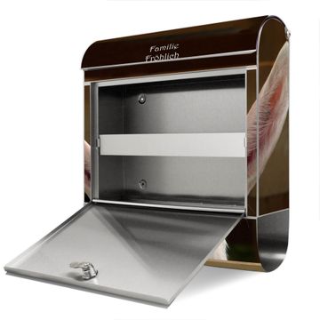FUNKTION: Der banjado Edelstahl Briefkasten mit Motiv Motiv Ziege bietet Ihnen mit seinem Fassungsvermögen genügend Platz auch für große A4 Sendungen. Das integrierte Zeitungsfach eignet sich hervorragend um unkompliziert die Tageszeitung zu fassen. Auf Wunsch können Sie bei uns den passenden Ständer kaufen und so aus dem Wandbriefkasten einen Standbriefkasten machen. DESIGN: Der Motivbriefkasten hat ein sehr ansprechendes und ausgefallenes Design, damit entlocken Sie Ihren Nachbarn und dem Postboten ein Lächeln. Heben Sie Sich ab von der tristen grauen Masse ohne auf Funktionalität zu verzichten. DETAILS: Der Design Briefkasten mit Motiv Motiv Ziege besteht aus hochwertigem 18/0 Edelstahl. Das Motiv besteht aus einer wetter- und UV-resistenten Folie, die mit einem Schutzlaminat überzogen ist. Der Briefkasten wird mit Montagematerial und zwei Schlüsseln geliefert. NUTZEN: Sie können diesen Briefkasten sowohl als Wandbriefkasten montieren oder einen passenden Ständer auswählen und als Standbriefkasten einbetonieren. Die Größe bietet genügend Platz für Sendungen aller Art, das hochwertige Edelstahl ist rostfrei und die Motivfolie absolut wetterfest. SCHUTZ: Um Ihre Post optimal vor Witterungseinflüssen wie Starkregen zu schützen, empfehlen wir, den Briefkasten geschützt anzubringen. BANJADO: Ihr Briefkasten wird in Sachsen in einer kleinen Manufaktur von Hand veredelt. Die Motivfolie ist lösungsmittelfrei und schutzlaminiert, dies sorgt für einen langen Halt. Wir legen großen Wert auf die Verbindung von Funktionalität und Design. Sie erhalten Handarbeit aus Sachsen.