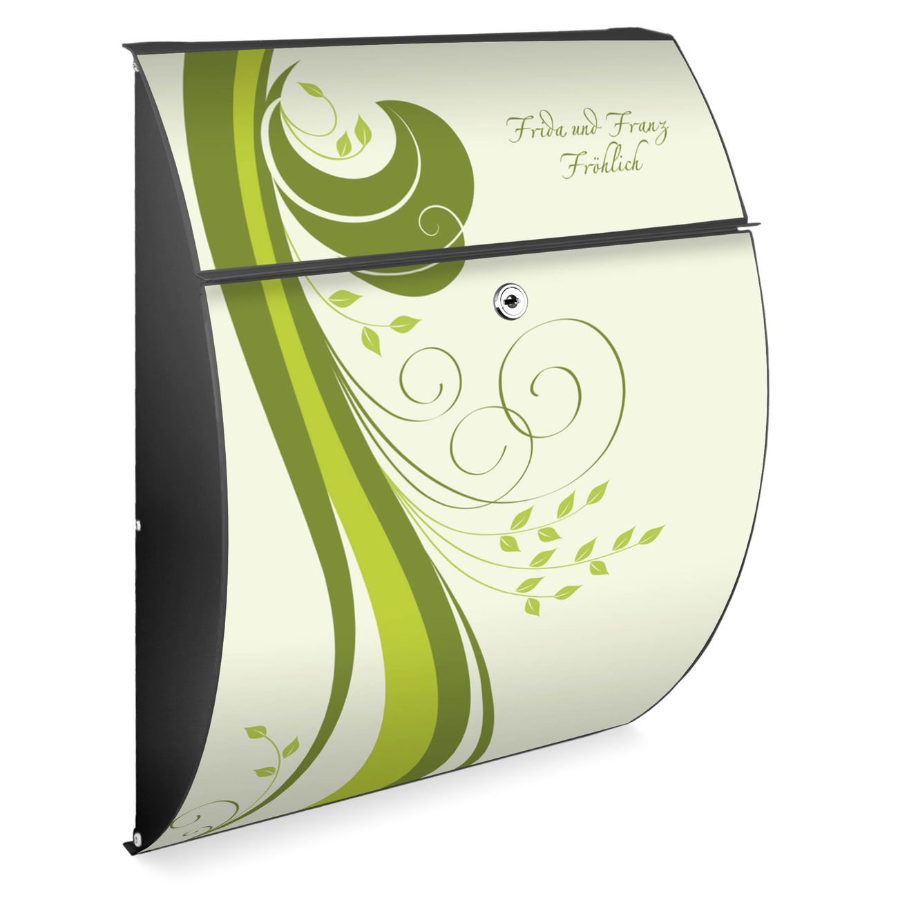 FUNKTION: DESIGN: Das Modell Riviera mit Motiv WT Green Swirl hat ein sehr ansprechendes und zeitloses Design. Heben Sie Sich von der tristen grauen Masse ab, ohne auf Funktionalität zu verzichten. Der integrierte Öffnungsstopp ermöglicht eine einfache Handhabung beim Entnehmen der Post. DETAILS: Der Postkasten besteht aus vollflächig verzinktem Stahl welcher in Anthrazit lackiert wurde. Das Motiv besteht aus einer wetter- und UV-festen Folie, die mit einem Schutzlaminat überzogen ist, durch die Ihren Briefkasten zusätzlich vor Kratzern geschützt ist. Sie erhalten 2 Schlüssel sowie das passende Montagematerial. NUTZEN: Sie können den Briefkasten sowohl als Wandbriefkasten montieren oder einen passenden Ständer kaufen und als Standbriefkasten einbetonieren. Die Größe bietet genügend Platz für Sendungen aller Art, der Einwurf fasst auch größere A4 Sendungen. BANJADO: Ihr Briefkasten wird in Sachsen in einer kleinen Manufaktur von Hand veredelt. Die Motivfolie ist lösungsmittelfrei und schutzlaminiert, dies sorgt für einen langen Halt. Wir legen großen Wert auf die Verbindung von Funktionalität und Design. Sie erhalten Handarbeit aus Sachsen.
