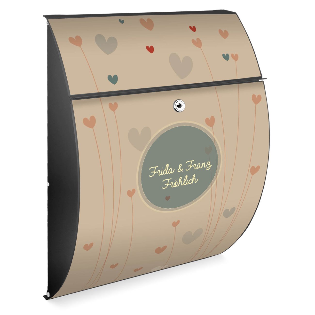 FUNKTION: DESIGN: Das Modell Riviera mit Motiv WT Große Liebe hat ein sehr ansprechendes und zeitloses Design. Heben Sie Sich von der tristen grauen Masse ab, ohne auf Funktionalität zu verzichten. Der integrierte Öffnungsstopp ermöglicht eine einfache Handhabung beim Entnehmen der Post. DETAILS: Der Postkasten besteht aus vollflächig verzinktem Stahl welcher in Anthrazit lackiert wurde. Das Motiv besteht aus einer wetter- und UV-festen Folie, die mit einem Schutzlaminat überzogen ist, durch die Ihren Briefkasten zusätzlich vor Kratzern geschützt ist. Sie erhalten 2 Schlüssel sowie das passende Montagematerial. NUTZEN: Sie können den Briefkasten sowohl als Wandbriefkasten montieren oder einen passenden Ständer kaufen und als Standbriefkasten einbetonieren. Die Größe bietet genügend Platz für Sendungen aller Art, der Einwurf fasst auch größere A4 Sendungen. BANJADO: Ihr Briefkasten wird in Sachsen in einer kleinen Manufaktur von Hand veredelt. Die Motivfolie ist lösungsmittelfrei und schutzlaminiert, dies sorgt für einen langen Halt. Wir legen großen Wert auf die Verbindung von Funktionalität und Design. Sie erhalten Handarbeit aus Sachsen.