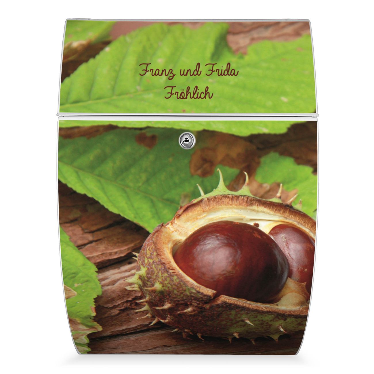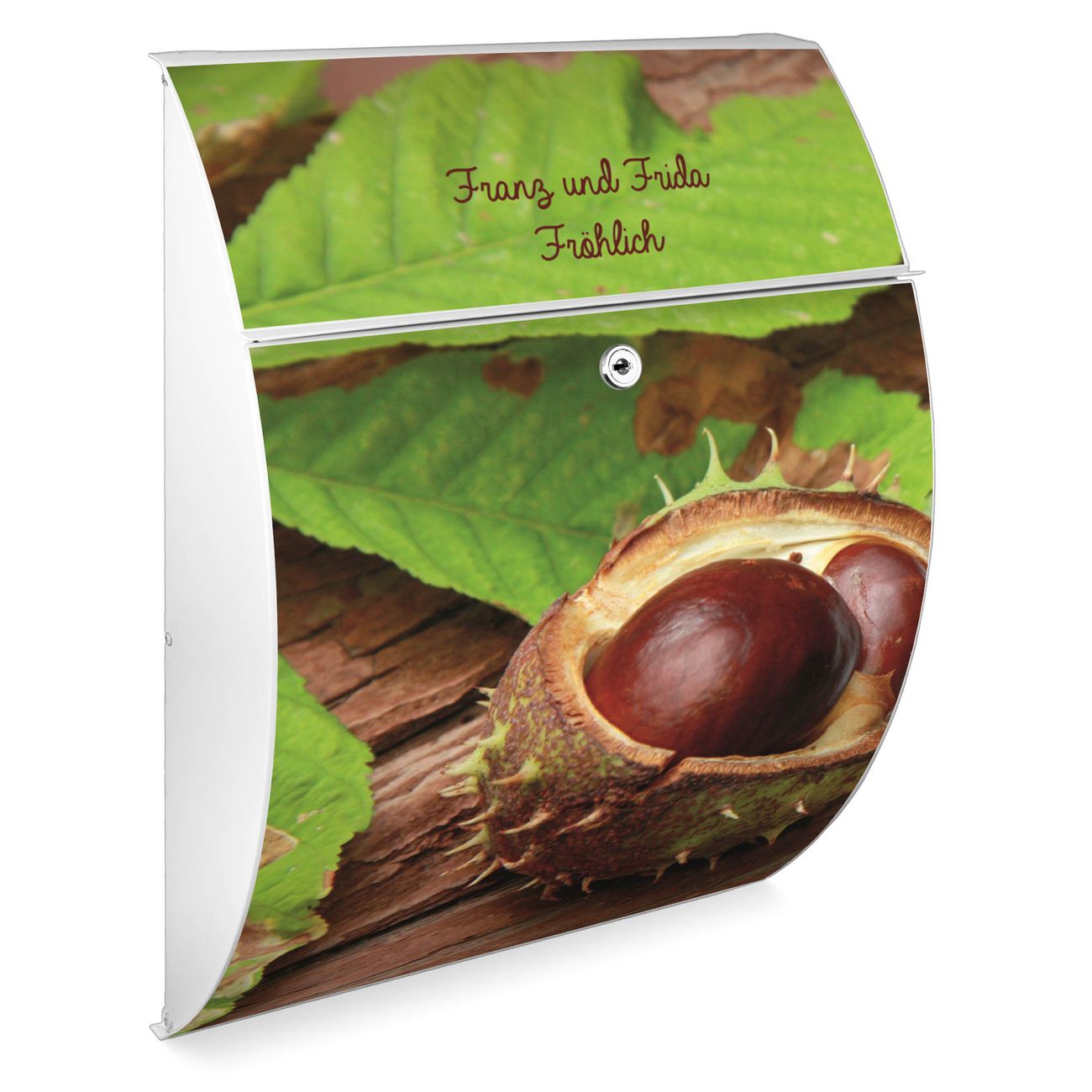 Der weiße Burg Wächter Design Briefkasten mit Motiv WT Kastanie bietet Ihnen mit seinem Fassungsvermögen genügend Platz auch für große A4 Sendungen. Auf Wunsch können Sie bei uns auch den passenden Ständer kaufen und so aus dem Wandbriefkasten einen Standbriefkasten machen.