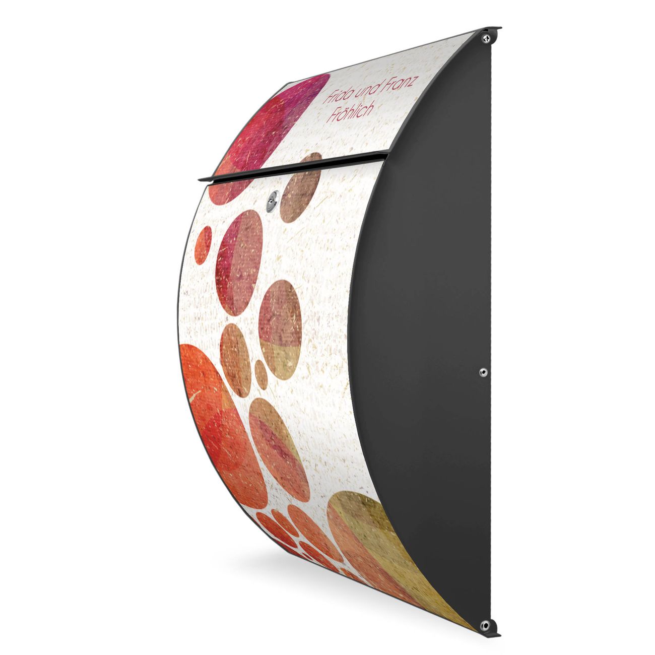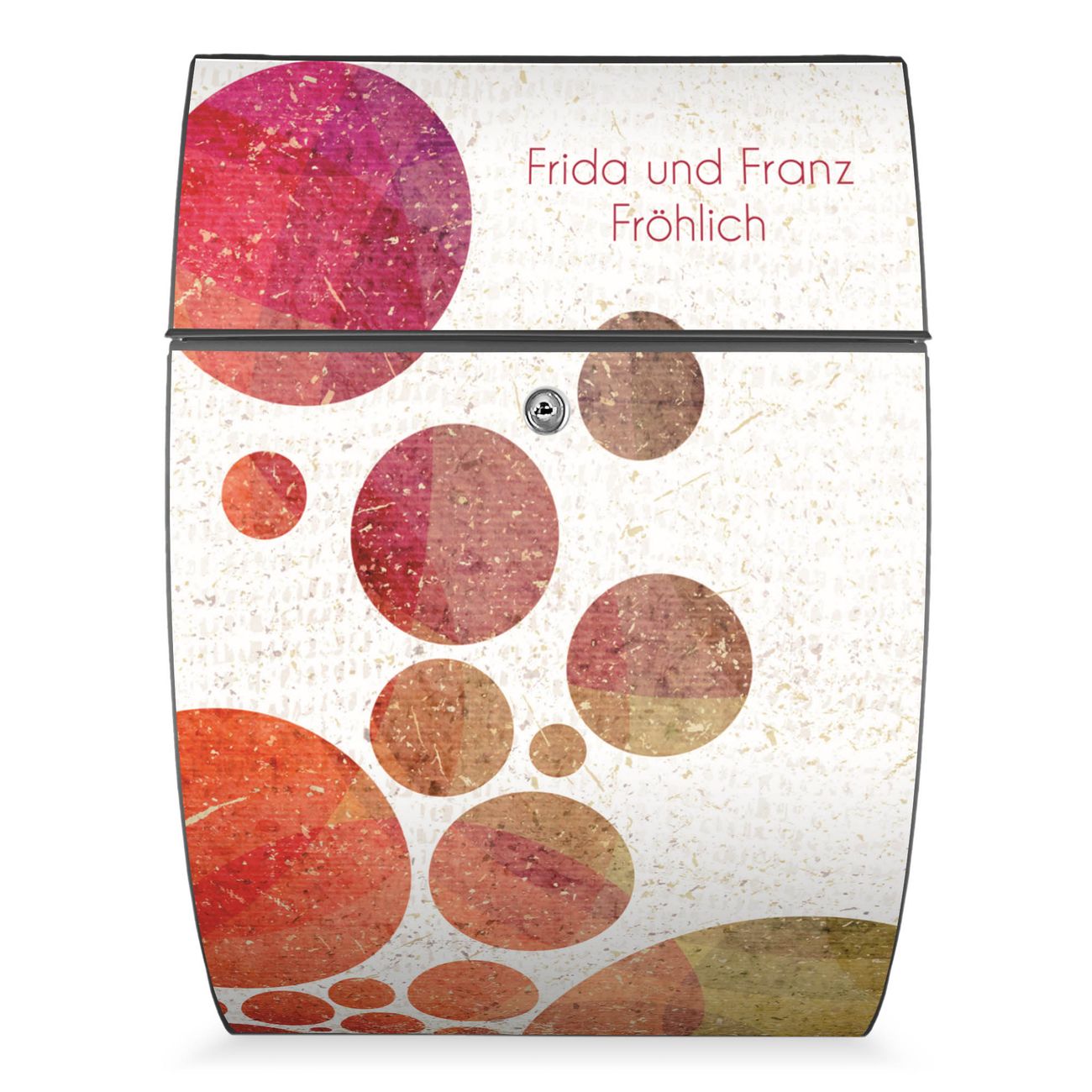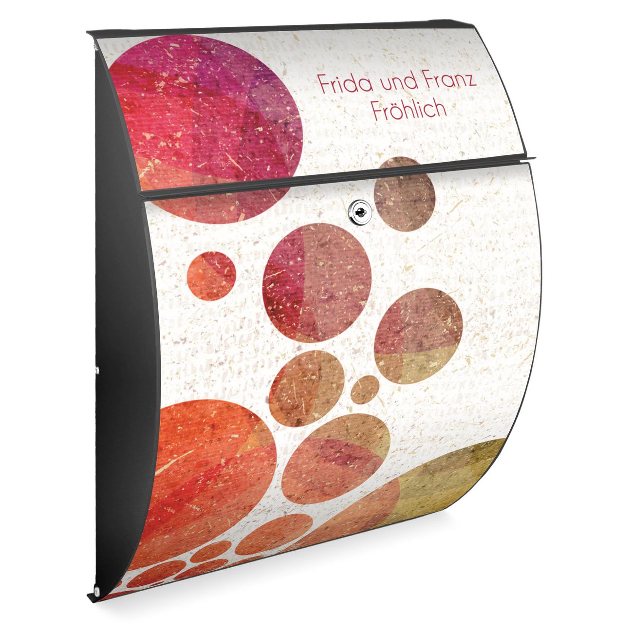FUNKTION: DESIGN: Das Modell Riviera mit Motiv WT Kreise hat ein sehr ansprechendes und zeitloses Design. Heben Sie Sich von der tristen grauen Masse ab, ohne auf Funktionalität zu verzichten. Der integrierte Öffnungsstopp ermöglicht eine einfache Handhabung beim Entnehmen der Post. DETAILS: Der Postkasten besteht aus vollflächig verzinktem Stahl welcher in Anthrazit lackiert wurde. Das Motiv besteht aus einer wetter- und UV-festen Folie, die mit einem Schutzlaminat überzogen ist, durch die Ihren Briefkasten zusätzlich vor Kratzern geschützt ist. Sie erhalten 2 Schlüssel sowie das passende Montagematerial. NUTZEN: Sie können den Briefkasten sowohl als Wandbriefkasten montieren oder einen passenden Ständer kaufen und als Standbriefkasten einbetonieren. Die Größe bietet genügend Platz für Sendungen aller Art, der Einwurf fasst auch größere A4 Sendungen. BANJADO: Ihr Briefkasten wird in Sachsen in einer kleinen Manufaktur von Hand veredelt. Die Motivfolie ist lösungsmittelfrei und schutzlaminiert, dies sorgt für einen langen Halt. Wir legen großen Wert auf die Verbindung von Funktionalität und Design. Sie erhalten Handarbeit aus Sachsen.