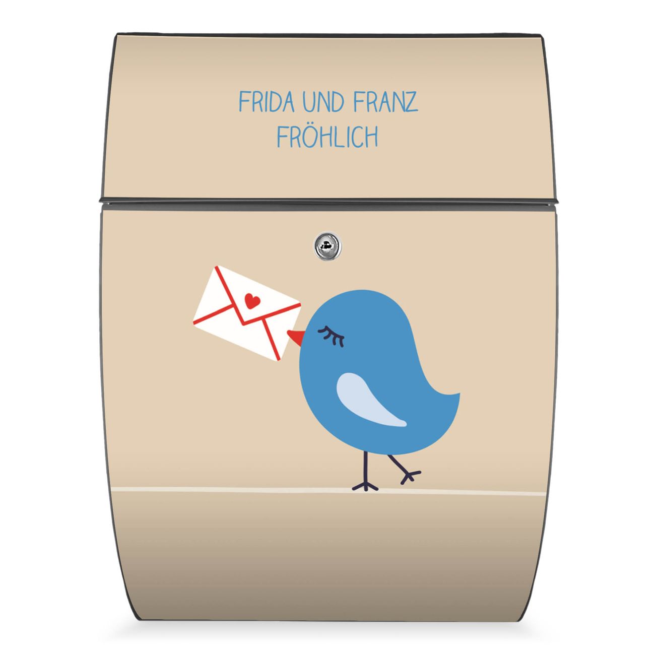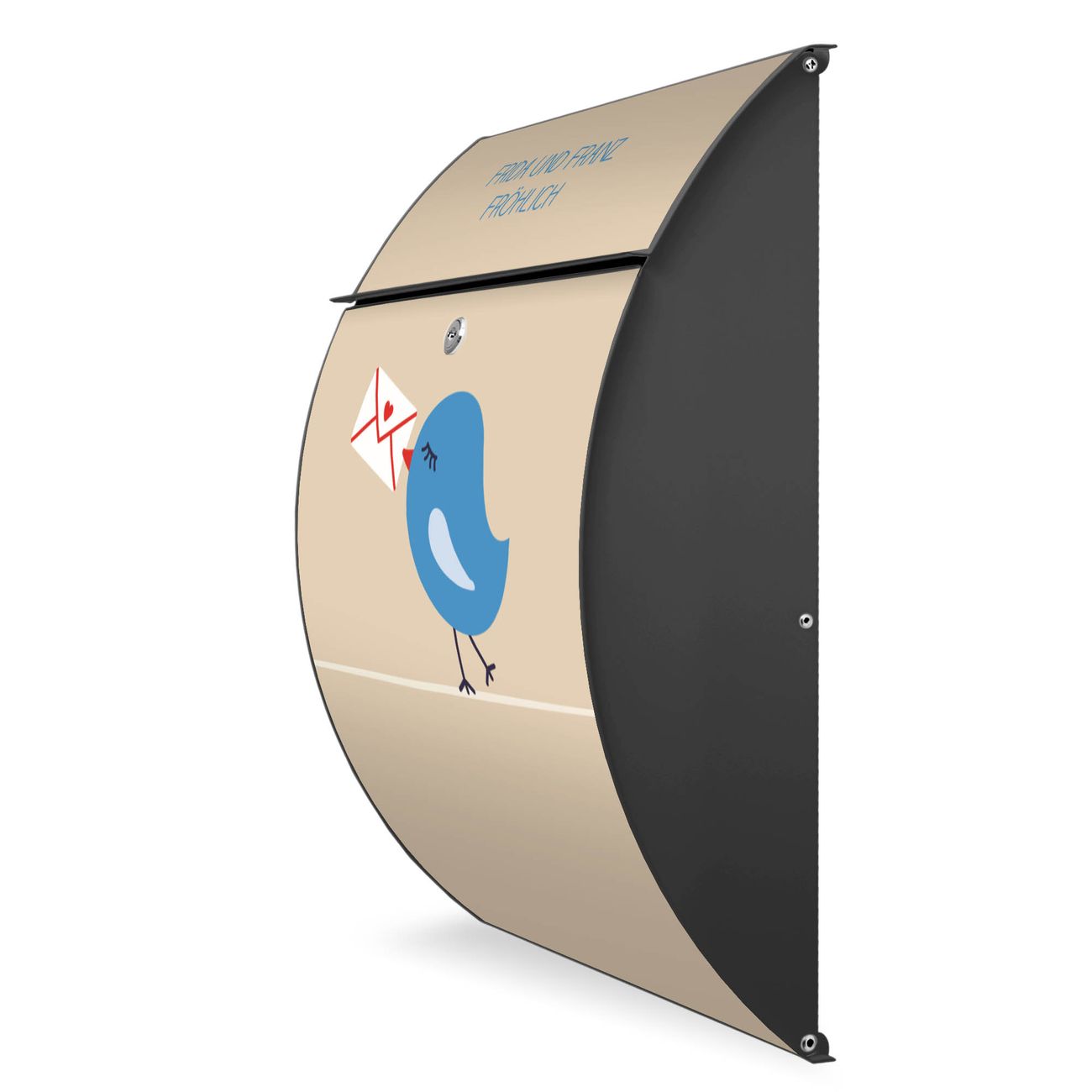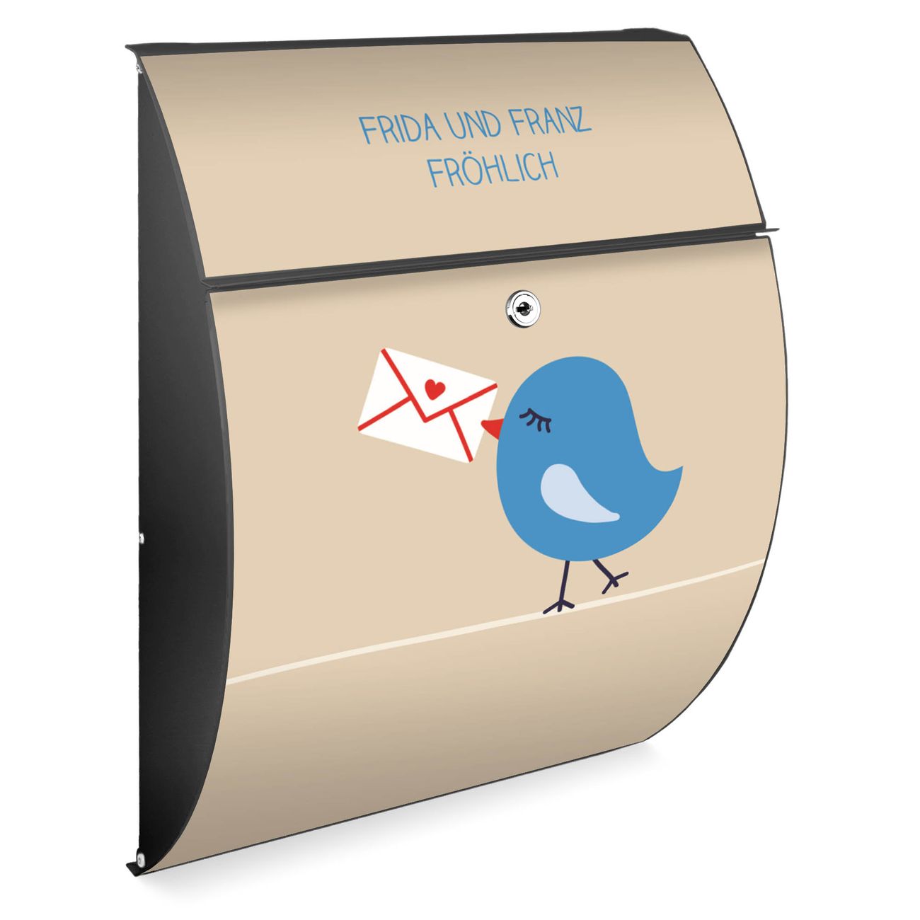 FUNKTION: DESIGN: Das Modell Riviera mit Motiv WT Liebesbrief hat ein sehr ansprechendes und zeitloses Design. Heben Sie Sich von der tristen grauen Masse ab, ohne auf Funktionalität zu verzichten. Der integrierte Öffnungsstopp ermöglicht eine einfache Handhabung beim Entnehmen der Post. DETAILS: Der Postkasten besteht aus vollflächig verzinktem Stahl welcher in Anthrazit lackiert wurde. Das Motiv besteht aus einer wetter- und UV-festen Folie, die mit einem Schutzlaminat überzogen ist, durch die Ihren Briefkasten zusätzlich vor Kratzern geschützt ist. Sie erhalten 2 Schlüssel sowie das passende Montagematerial. NUTZEN: Sie können den Briefkasten sowohl als Wandbriefkasten montieren oder einen passenden Ständer kaufen und als Standbriefkasten einbetonieren. Die Größe bietet genügend Platz für Sendungen aller Art, der Einwurf fasst auch größere A4 Sendungen. BANJADO: Ihr Briefkasten wird in Sachsen in einer kleinen Manufaktur von Hand veredelt. Die Motivfolie ist lösungsmittelfrei und schutzlaminiert, dies sorgt für einen langen Halt. Wir legen großen Wert auf die Verbindung von Funktionalität und Design. Sie erhalten Handarbeit aus Sachsen.