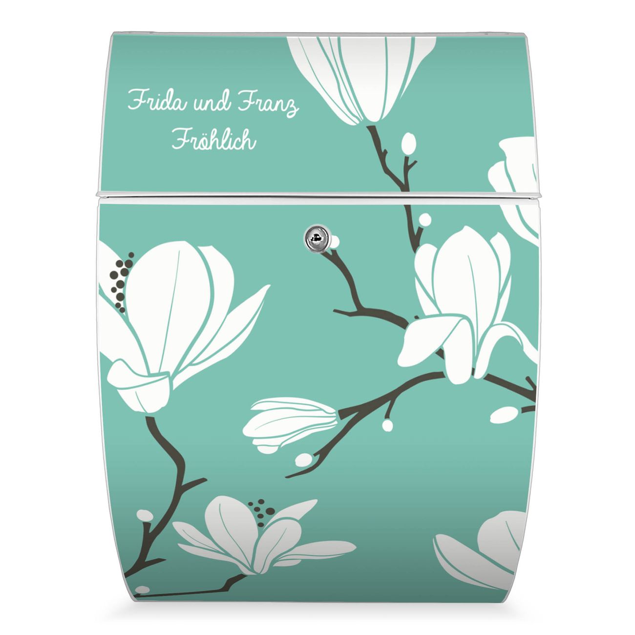 FUNKTION: DESIGN: Das Modell Riviera mit Motiv WT Magnolien hat ein sehr ansprechendes und zeitloses Design. Heben Sie Sich von der tristen grauen Masse ab, ohne auf Funktionalität zu verzichten. Der integrierte Öffnungsstopp ermöglicht eine einfache Handhabung beim Entnehmen der Post. DETAILS: Der Postkasten besteht aus vollflächig verzinktem Stahl welcher in weiß lackiert wurde. Das Motiv besteht aus einer wetter- und UV-festen Folie, die mit einem Schutzlaminat überzogen ist, durch die Ihren Briefkasten zusätzlich vor Kratzern geschützt ist. Sie erhalten 2 Schlüssel sowie das passende Montagematerial. NUTZEN: Sie können den Briefkasten sowohl als Wandbriefkasten montieren oder einen passenden Ständer kaufen und als Standbriefkasten einbetonieren. Die Größe bietet genügend Platz für Sendungen aller Art, der Einwurf fasst auch größere A4 Sendungen. BANJADO: Ihr Briefkasten wird in Sachsen in einer kleinen Manufaktur von Hand veredelt. Die Motivfolie ist lösungsmittelfrei und schutzlaminiert, dies sorgt für einen langen Halt. Wir legen großen Wert auf die Verbindung von Funktionalität und Design. Sie erhalten Handarbeit aus Sachsen.
