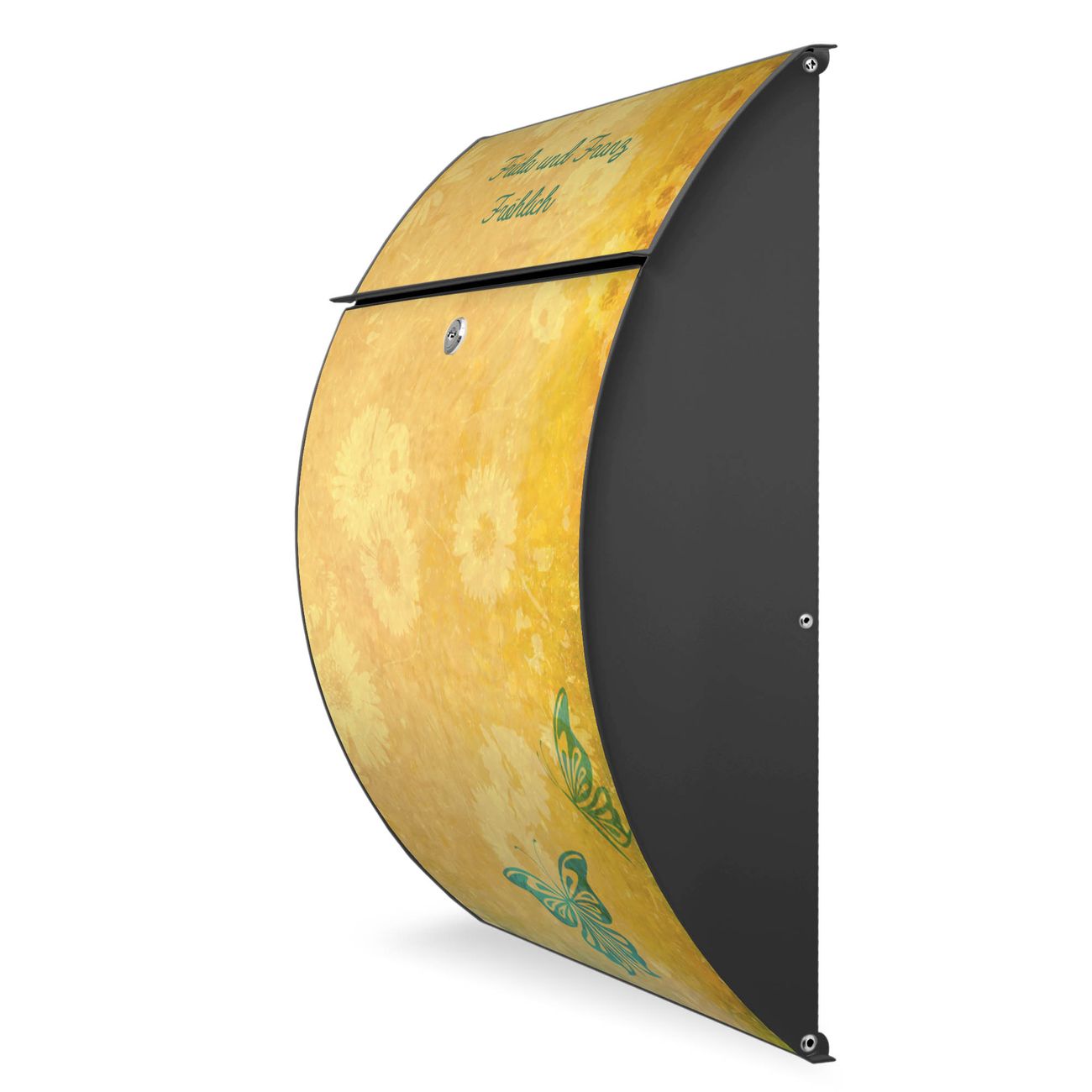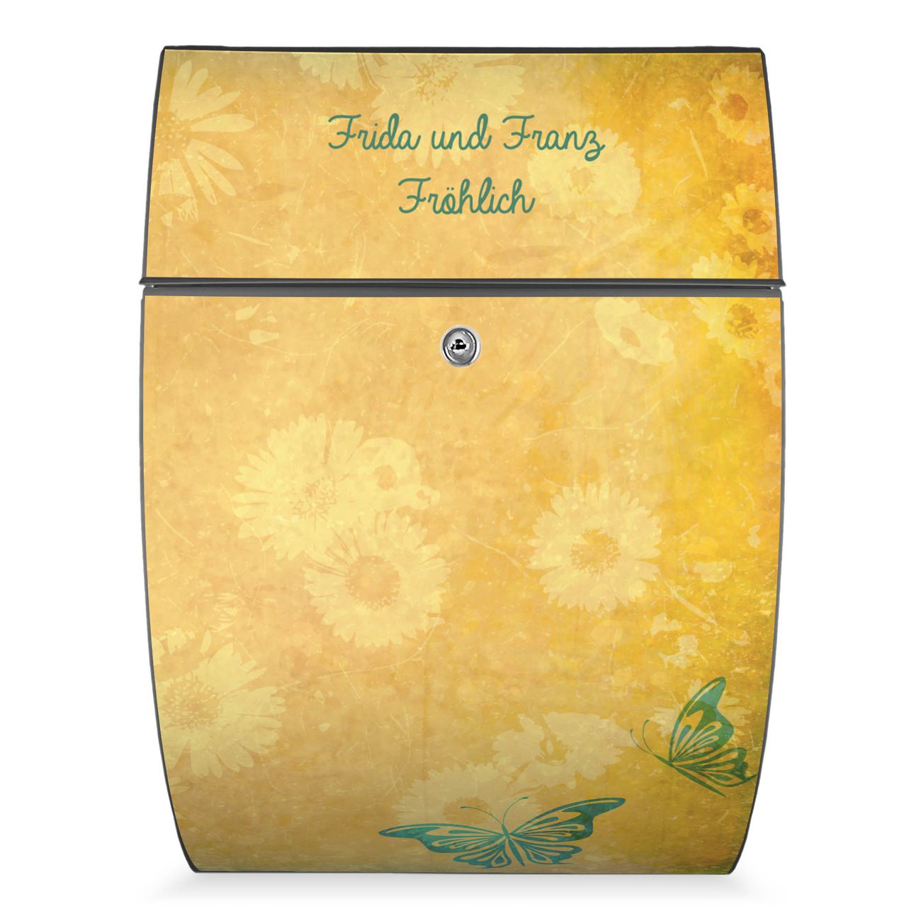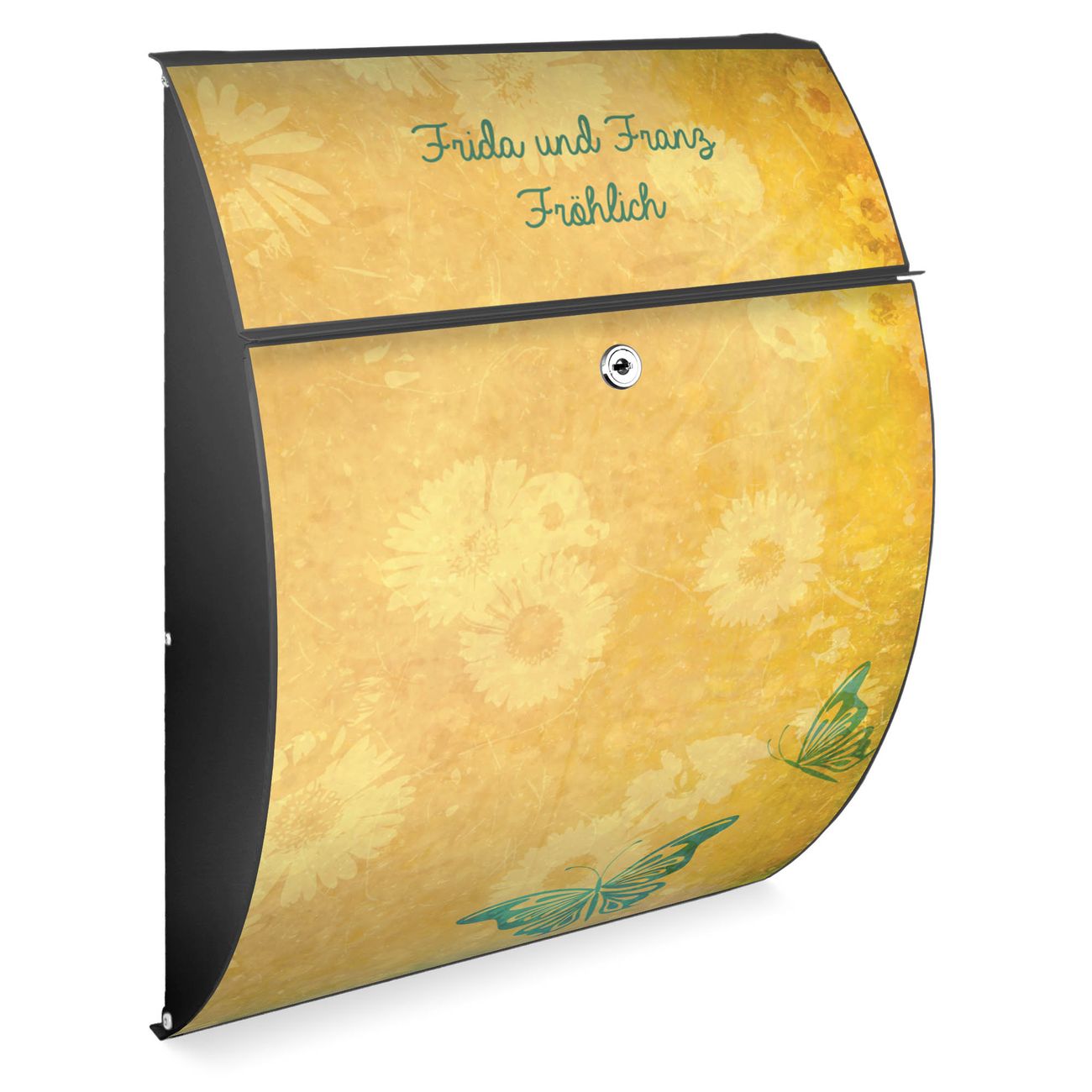 FUNKTION: DESIGN: Das Modell Riviera mit Motiv WT Muster Sommer hat ein sehr ansprechendes und zeitloses Design. Heben Sie Sich von der tristen grauen Masse ab, ohne auf Funktionalität zu verzichten. Der integrierte Öffnungsstopp ermöglicht eine einfache Handhabung beim Entnehmen der Post. DETAILS: Der Postkasten besteht aus vollflächig verzinktem Stahl welcher in Anthrazit lackiert wurde. Das Motiv besteht aus einer wetter- und UV-festen Folie, die mit einem Schutzlaminat überzogen ist, durch die Ihren Briefkasten zusätzlich vor Kratzern geschützt ist. Sie erhalten 2 Schlüssel sowie das passende Montagematerial. NUTZEN: Sie können den Briefkasten sowohl als Wandbriefkasten montieren oder einen passenden Ständer kaufen und als Standbriefkasten einbetonieren. Die Größe bietet genügend Platz für Sendungen aller Art, der Einwurf fasst auch größere A4 Sendungen. BANJADO: Ihr Briefkasten wird in Sachsen in einer kleinen Manufaktur von Hand veredelt. Die Motivfolie ist lösungsmittelfrei und schutzlaminiert, dies sorgt für einen langen Halt. Wir legen großen Wert auf die Verbindung von Funktionalität und Design. Sie erhalten Handarbeit aus Sachsen.