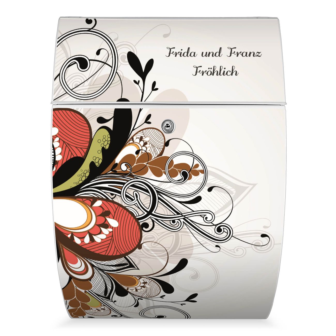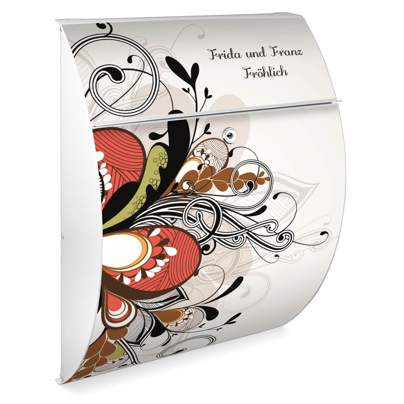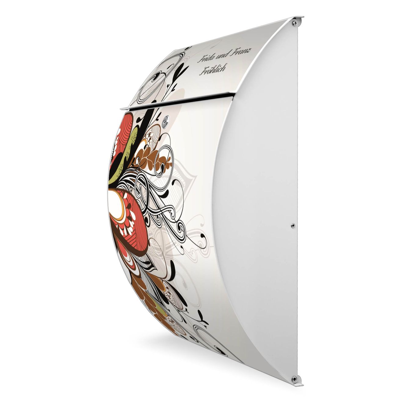 Der weiße Burg Wächter Design Briefkasten mit Motiv WT Ornament 2 bietet Ihnen mit seinem Fassungsvermögen genügend Platz auch für große A4 Sendungen. Auf Wunsch können Sie bei uns auch den passenden Ständer kaufen und so aus dem Wandbriefkasten einen Standbriefkasten machen.