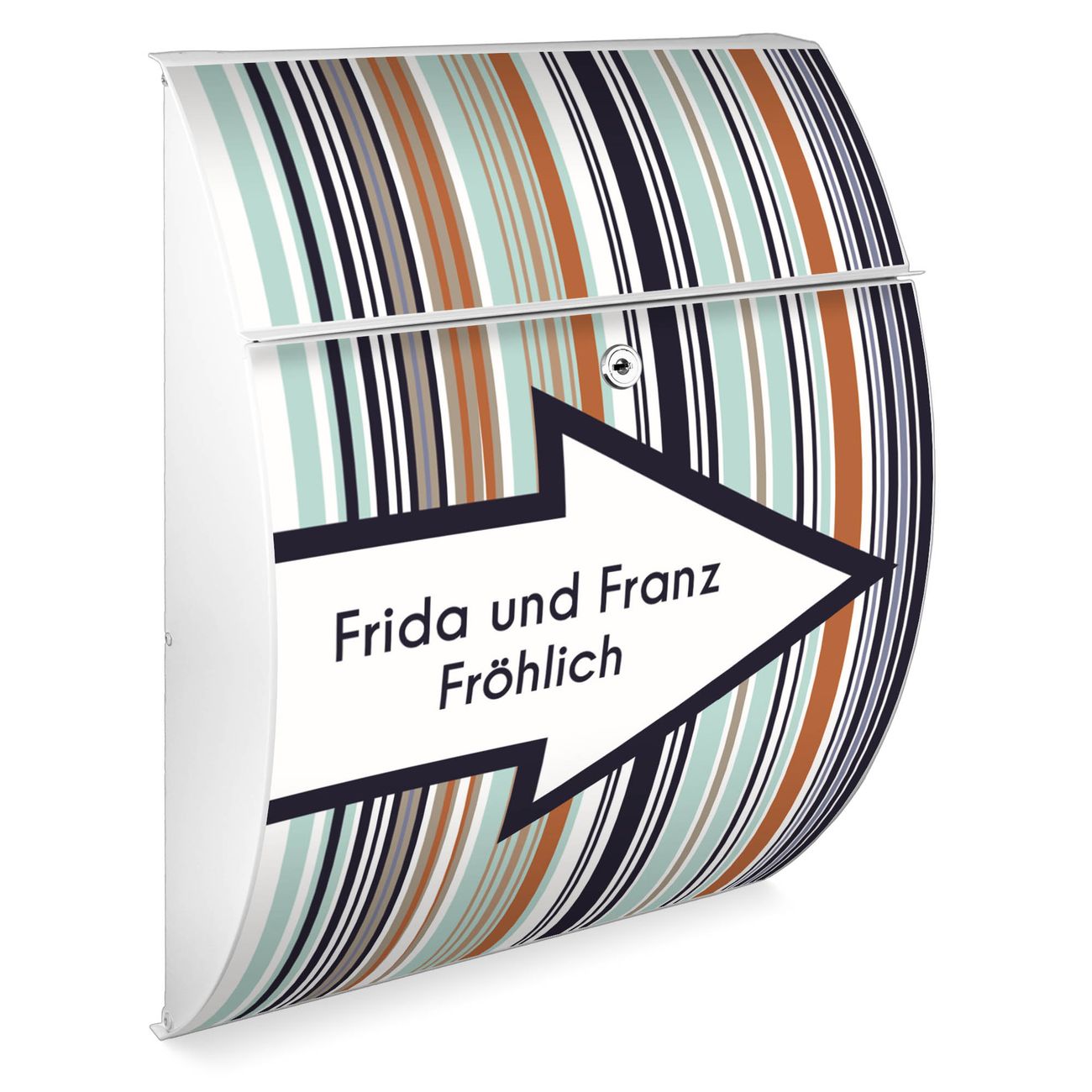 FUNKTION: DESIGN: Das Modell Riviera mit Motiv WT Pfeil Und Streifen hat ein sehr ansprechendes und zeitloses Design. Heben Sie Sich von der tristen grauen Masse ab, ohne auf Funktionalität zu verzichten. Der integrierte Öffnungsstopp ermöglicht eine einfache Handhabung beim Entnehmen der Post. DETAILS: Der Postkasten besteht aus vollflächig verzinktem Stahl welcher in weiß lackiert wurde. Das Motiv besteht aus einer wetter- und UV-festen Folie, die mit einem Schutzlaminat überzogen ist, durch die Ihren Briefkasten zusätzlich vor Kratzern geschützt ist. Sie erhalten 2 Schlüssel sowie das passende Montagematerial. NUTZEN: Sie können den Briefkasten sowohl als Wandbriefkasten montieren oder einen passenden Ständer kaufen und als Standbriefkasten einbetonieren. Die Größe bietet genügend Platz für Sendungen aller Art, der Einwurf fasst auch größere A4 Sendungen. BANJADO: Ihr Briefkasten wird in Sachsen in einer kleinen Manufaktur von Hand veredelt. Die Motivfolie ist lösungsmittelfrei und schutzlaminiert, dies sorgt für einen langen Halt. Wir legen großen Wert auf die Verbindung von Funktionalität und Design. Sie erhalten Handarbeit aus Sachsen.