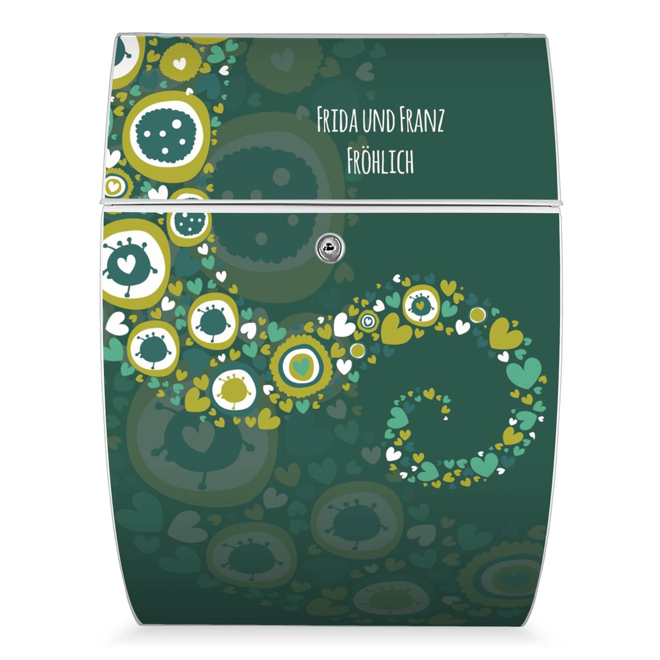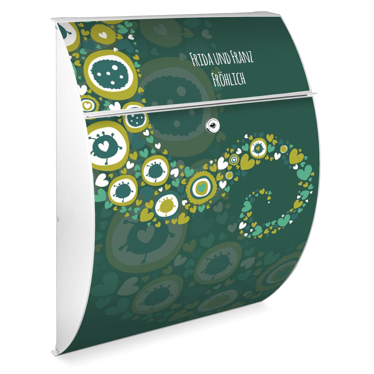 FUNKTION: DESIGN: Das Modell Riviera mit Motiv WT Strömende Herzen hat ein sehr ansprechendes und zeitloses Design. Heben Sie Sich von der tristen grauen Masse ab, ohne auf Funktionalität zu verzichten. Der integrierte Öffnungsstopp ermöglicht eine einfache Handhabung beim Entnehmen der Post. DETAILS: Der Postkasten besteht aus vollflächig verzinktem Stahl welcher in weiß lackiert wurde. Das Motiv besteht aus einer wetter- und UV-festen Folie, die mit einem Schutzlaminat überzogen ist, durch die Ihren Briefkasten zusätzlich vor Kratzern geschützt ist. Sie erhalten 2 Schlüssel sowie das passende Montagematerial. NUTZEN: Sie können den Briefkasten sowohl als Wandbriefkasten montieren oder einen passenden Ständer kaufen und als Standbriefkasten einbetonieren. Die Größe bietet genügend Platz für Sendungen aller Art, der Einwurf fasst auch größere A4 Sendungen. BANJADO: Ihr Briefkasten wird in Sachsen in einer kleinen Manufaktur von Hand veredelt. Die Motivfolie ist lösungsmittelfrei und schutzlaminiert, dies sorgt für einen langen Halt. Wir legen großen Wert auf die Verbindung von Funktionalität und Design. Sie erhalten Handarbeit aus Sachsen.