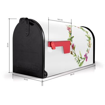 Der amerikanische Briefkasten von banjado mit Aquarell Blumenring Motiv bietet Ihnen ausreichend Fassungsvermögen, um große A4 Sendungen und Zeitschriften zu empfangen. Die typisch amerikanische rote Fahne zeigt Ihnen an, wenn Sie Post erhalten haben. Die US-Mailbox besteht aus verzinktem Stahlblech welches lackiert wurde und ist 48 x 22 x 16 CM (BxHxT) groß. Die Folie mit Motiv Aquarell Blumenring besteht aus einer wetter- und UV-resistenten Folie, die mit einem Schutzlaminat überzogen ist, sodass die US Mailbox zusätzlich vor Kratzern geschützt ist. An der Unterkante sind 4 Löcher je Seite um die Mailbox, typisch amerikanisch, an einem Holzpfahl oder einem Zaun zu befestigen. Auf Wunsch können Sie bei uns den passenden Standfuß oder die passende Wandhalterung kaufen um die US-Mailbox sicher zu befestigen. Wir bieten Ihnen ebenfalls Namensschilder, bereits beschriftet oder frei zu beschriften, und verschiedene selbst gestaltete Bitte-Keine-Werbung-Aufkleber.