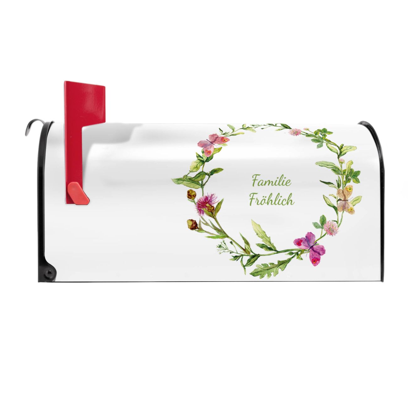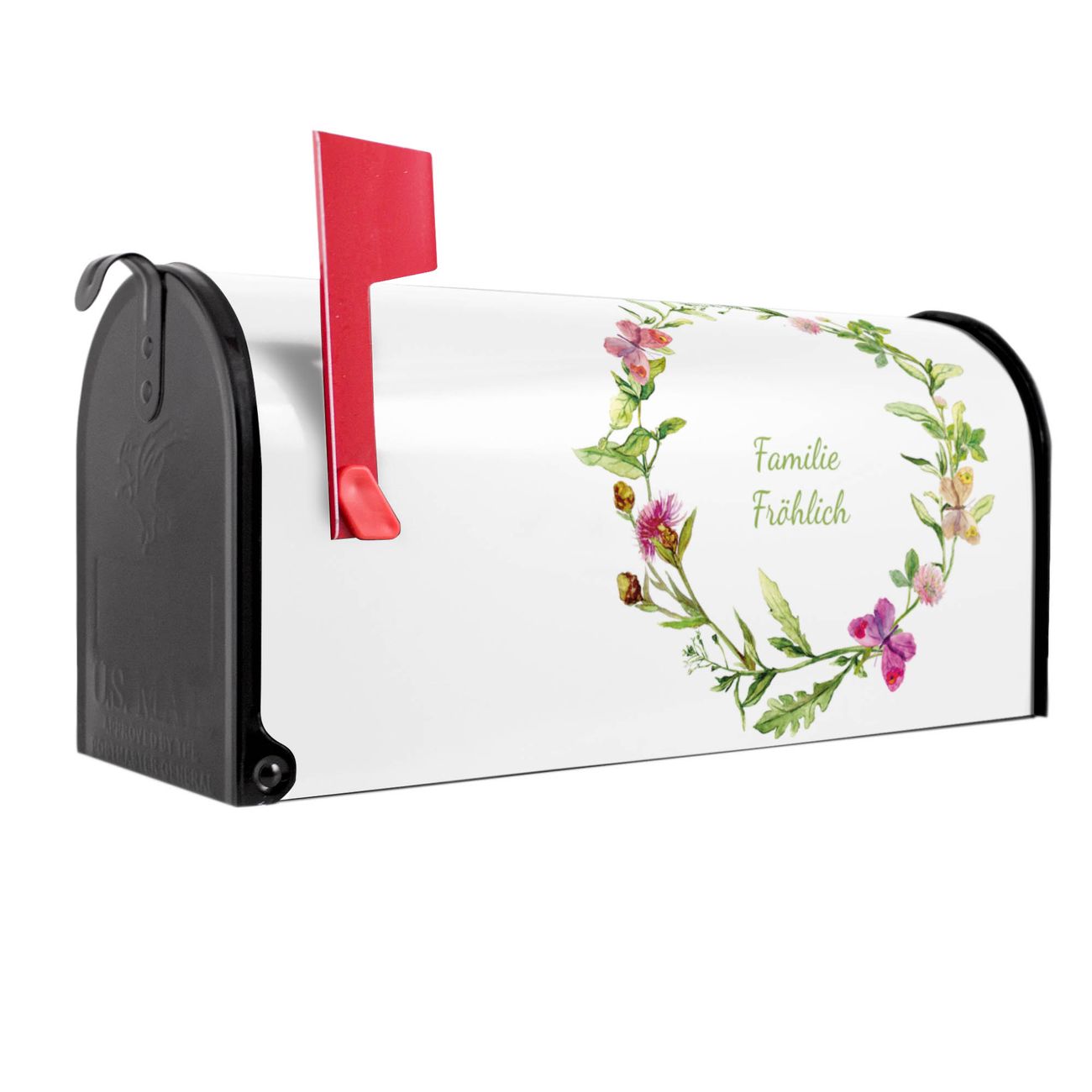 Unser amerikanischer Briefkasten mit dem Motiv Aquarell Blumenring hat ein sehr ansprechendes und ausgefallenes Design, ist in der Grundfarbe weiß, grün oder schwarz erhältlich. Damit entlocken Sie Ihren Nachbarn und dem Postboten immer wieder ein Lächeln. Die Mailbox ist ein Original Import aus Mississippi USA und wird von unserer kleinen Manufaktur in Sachsen von Hand veredelt. Die US-Mailbox bietet ausreichend Platz auch für große Sendungen, eine Fahne die Ihnen Post anzeigt, wetterfestes und äußerst stabiles Material - so macht Post empfangen Freude.