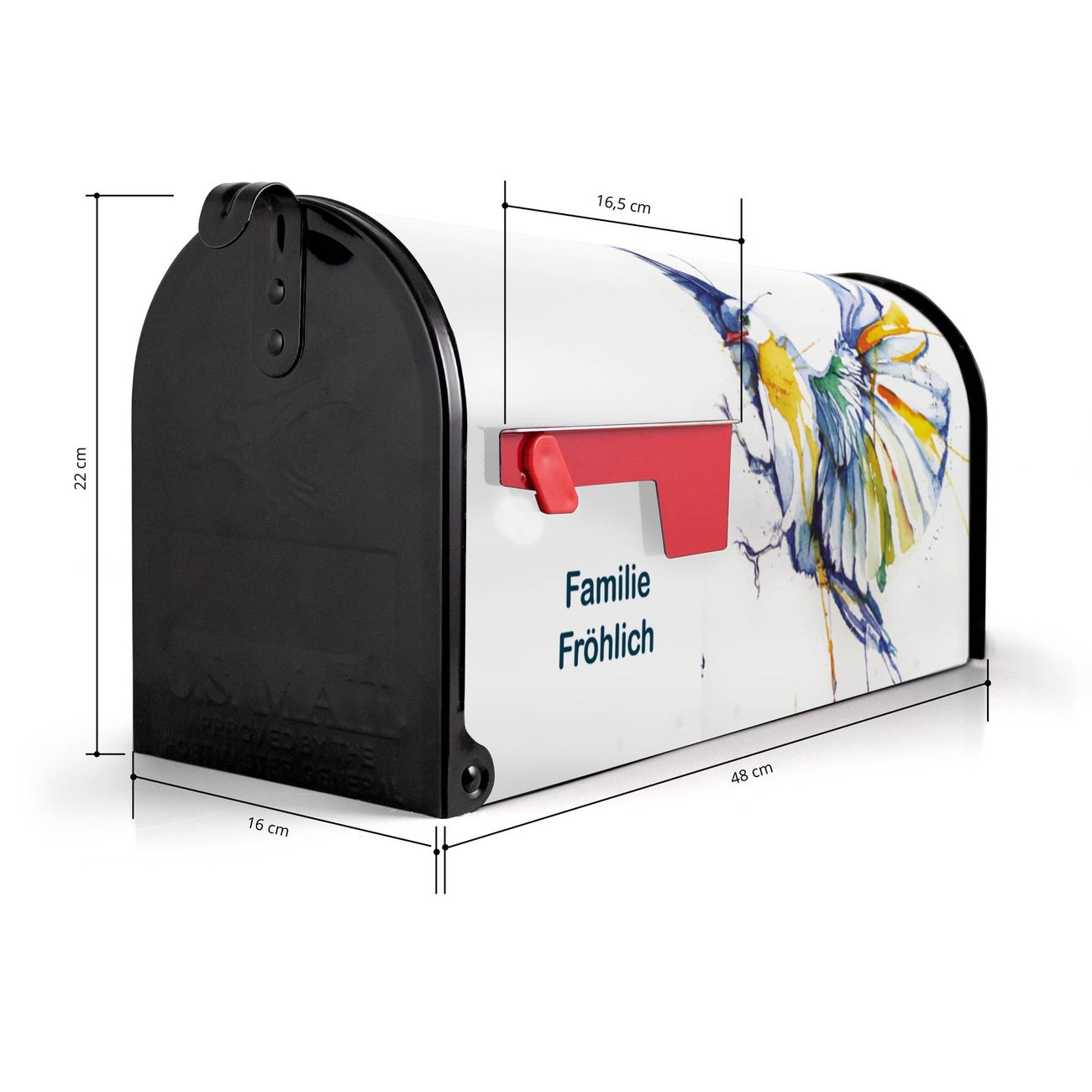 Der amerikanische Briefkasten von banjado mit Aquarell Vogel Motiv bietet Ihnen ausreichend Fassungsvermögen, um große A4 Sendungen und Zeitschriften zu empfangen. Die typisch amerikanische rote Fahne zeigt Ihnen an, wenn Sie Post erhalten haben. Die US-Mailbox besteht aus verzinktem Stahlblech welches lackiert wurde und ist 48 x 22 x 16 CM (BxHxT) groß. Die Folie mit Motiv Aquarell Vogel besteht aus einer wetter- und UV-resistenten Folie, die mit einem Schutzlaminat überzogen ist, sodass die US Mailbox zusätzlich vor Kratzern geschützt ist. An der Unterkante sind 4 Löcher je Seite um die Mailbox, typisch amerikanisch, an einem Holzpfahl oder einem Zaun zu befestigen. Auf Wunsch können Sie bei uns den passenden Standfuß oder die passende Wandhalterung kaufen um die US-Mailbox sicher zu befestigen. Wir bieten Ihnen ebenfalls Namensschilder, bereits beschriftet oder frei zu beschriften, und verschiedene selbst gestaltete Bitte-Keine-Werbung-Aufkleber.