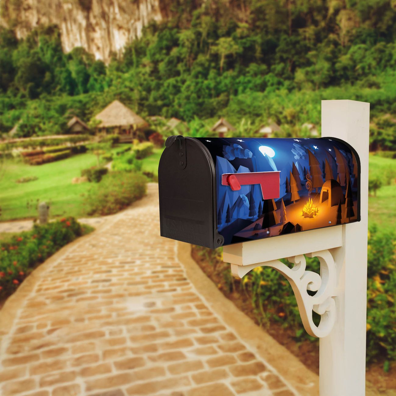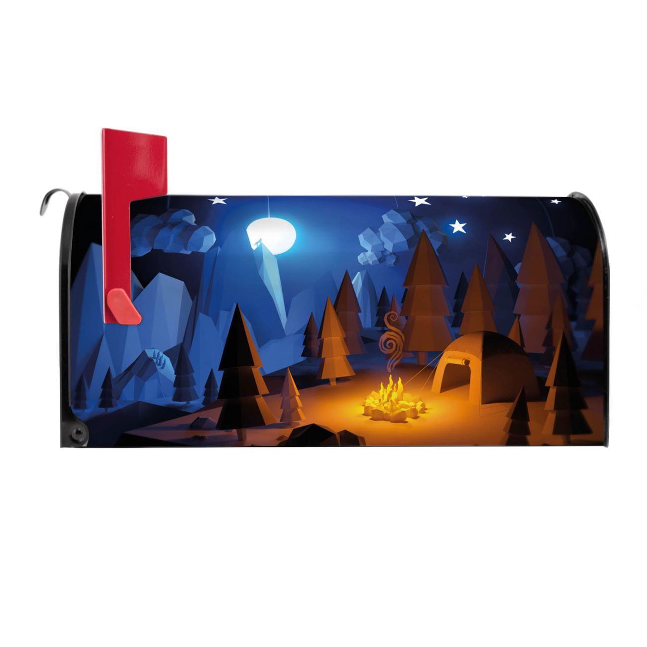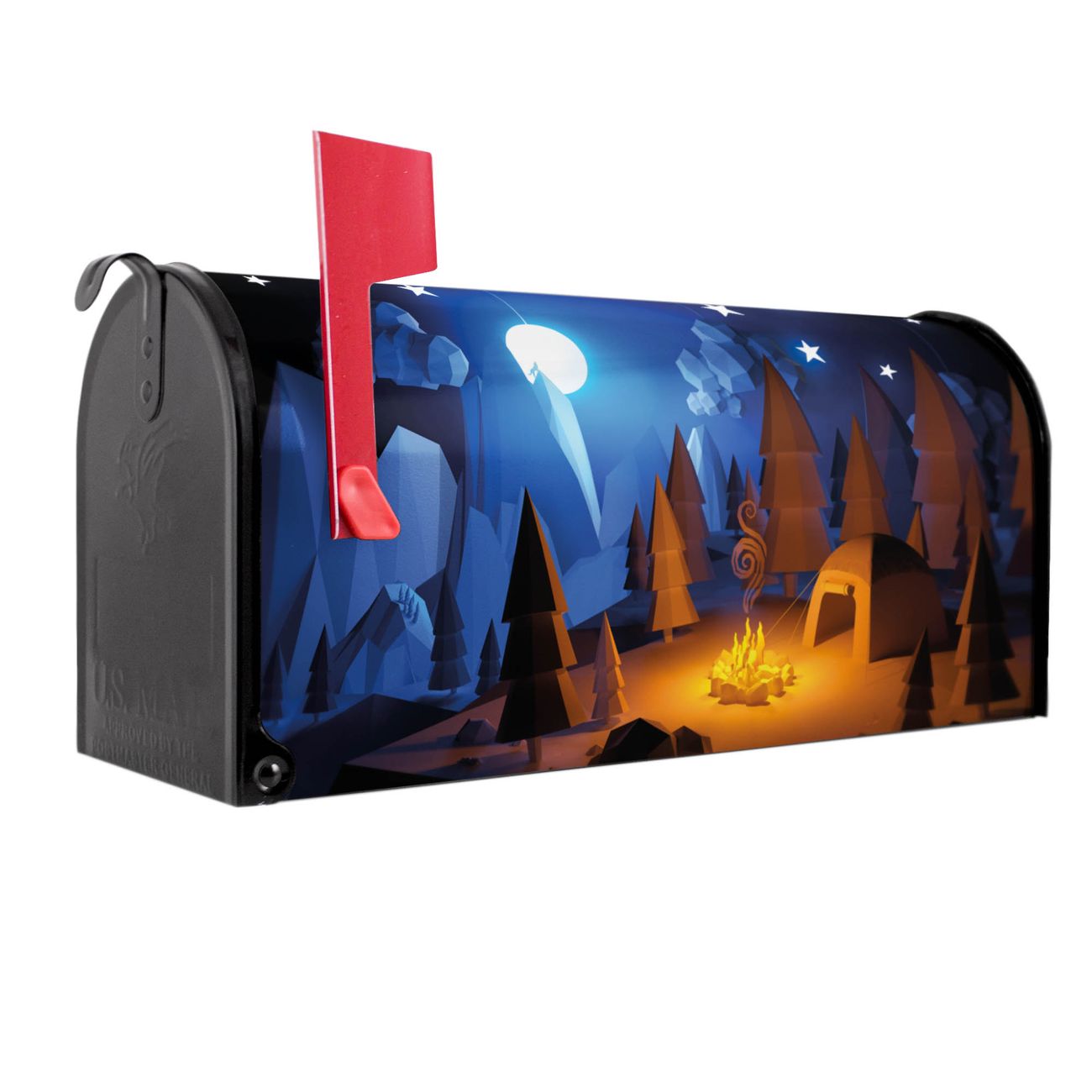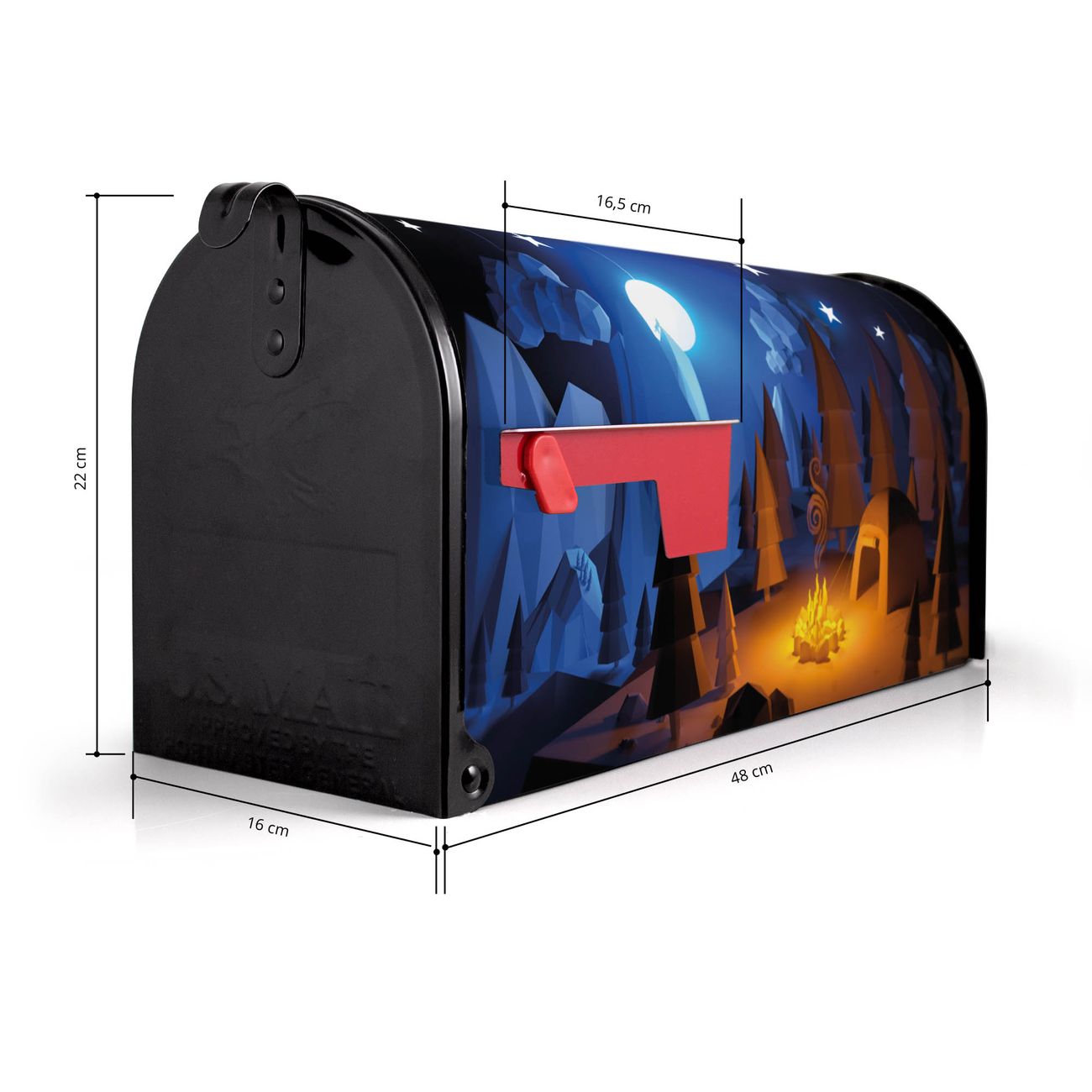 Der amerikanische Briefkasten von banjado mit Camping 2 Motiv bietet Ihnen ausreichend Fassungsvermögen, um große A4 Sendungen und Zeitschriften zu empfangen. Die typisch amerikanische rote Fahne zeigt Ihnen an, wenn Sie Post erhalten haben. Die US-Mailbox besteht aus verzinktem Stahlblech welches lackiert wurde und ist 48 x 22 x 16 CM (BxHxT) groß. Die Folie mit Motiv Camping 2 besteht aus einer wetter- und UV-resistenten Folie, die mit einem Schutzlaminat überzogen ist, sodass die US Mailbox zusätzlich vor Kratzern geschützt ist. An der Unterkante sind 4 Löcher je Seite um die Mailbox, typisch amerikanisch, an einem Holzpfahl oder einem Zaun zu befestigen. Auf Wunsch können Sie bei uns den passenden Standfuß oder die passende Wandhalterung kaufen um die US-Mailbox sicher zu befestigen. Wir bieten Ihnen ebenfalls Namensschilder, bereits beschriftet oder frei zu beschriften, und verschiedene selbst gestaltete Bitte-Keine-Werbung-Aufkleber.