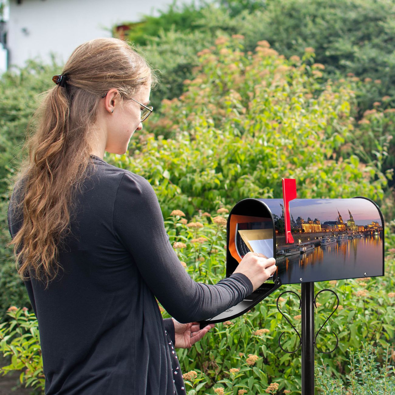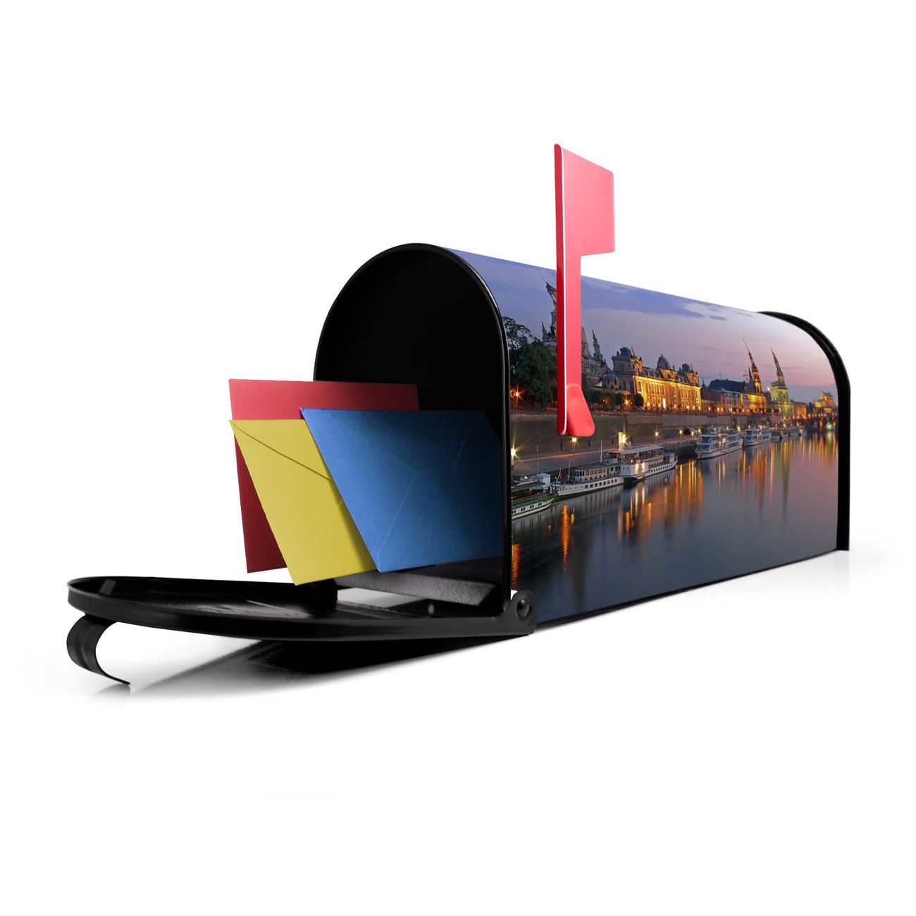 Unser amerikanischer Briefkasten mit dem Motiv Dresden hat ein sehr ansprechendes und ausgefallenes Design, ist in der Grundfarbe weiß, grün oder schwarz erhältlich. Damit entlocken Sie Ihren Nachbarn und dem Postboten immer wieder ein Lächeln. Die Mailbox ist ein Original Import aus Mississippi USA und wird von unserer kleinen Manufaktur in Sachsen von Hand veredelt. Die US-Mailbox bietet ausreichend Platz auch für große Sendungen, eine Fahne die Ihnen Post anzeigt, wetterfestes und äußerst stabiles Material - so macht Post empfangen Freude.