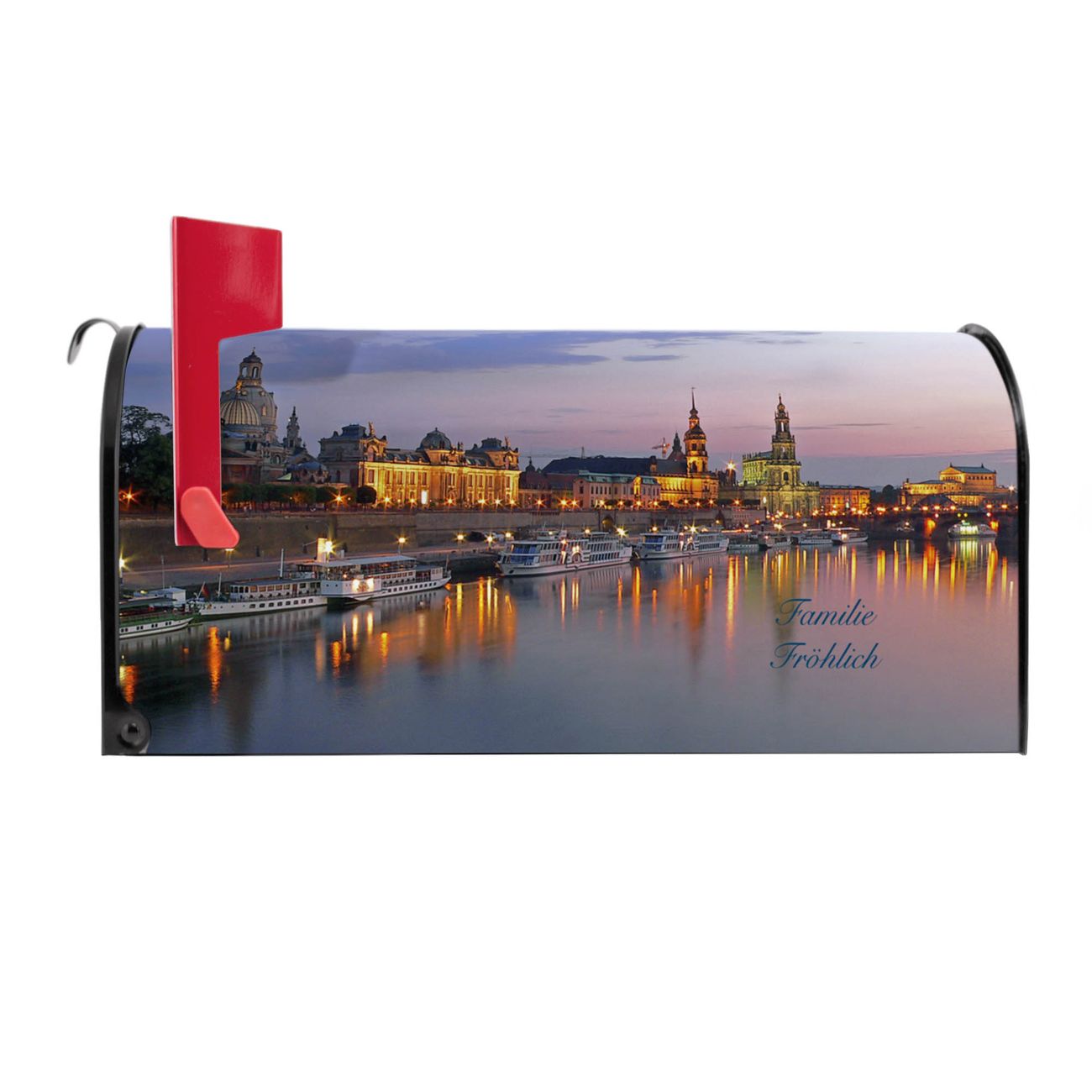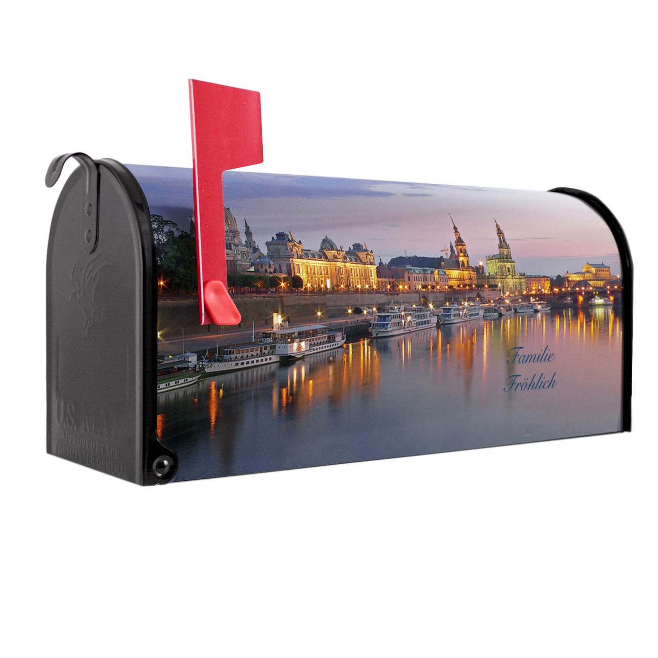 Unser amerikanischer Briefkasten mit dem Motiv Dresden hat ein sehr ansprechendes und ausgefallenes Design, ist in der Grundfarbe weiß, grün oder schwarz erhältlich. Damit entlocken Sie Ihren Nachbarn und dem Postboten immer wieder ein Lächeln. Die Mailbox ist ein Original Import aus Mississippi USA und wird von unserer kleinen Manufaktur in Sachsen von Hand veredelt. Die US-Mailbox bietet ausreichend Platz auch für große Sendungen, eine Fahne die Ihnen Post anzeigt, wetterfestes und äußerst stabiles Material - so macht Post empfangen Freude.