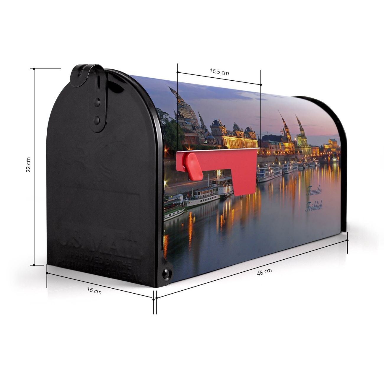 Der amerikanische Briefkasten von banjado mit Dresden Motiv bietet Ihnen ausreichend Fassungsvermögen, um große A4 Sendungen und Zeitschriften zu empfangen. Die typisch amerikanische rote Fahne zeigt Ihnen an, wenn Sie Post erhalten haben. Die US-Mailbox besteht aus verzinktem Stahlblech welches lackiert wurde und ist 48 x 22 x 16 CM (BxHxT) groß. Die Folie mit Motiv Dresden besteht aus einer wetter- und UV-resistenten Folie, die mit einem Schutzlaminat überzogen ist, sodass die US Mailbox zusätzlich vor Kratzern geschützt ist. An der Unterkante sind 4 Löcher je Seite um die Mailbox, typisch amerikanisch, an einem Holzpfahl oder einem Zaun zu befestigen. Auf Wunsch können Sie bei uns den passenden Standfuß oder die passende Wandhalterung kaufen um die US-Mailbox sicher zu befestigen. Wir bieten Ihnen ebenfalls Namensschilder, bereits beschriftet oder frei zu beschriften, und verschiedene selbst gestaltete Bitte-Keine-Werbung-Aufkleber.