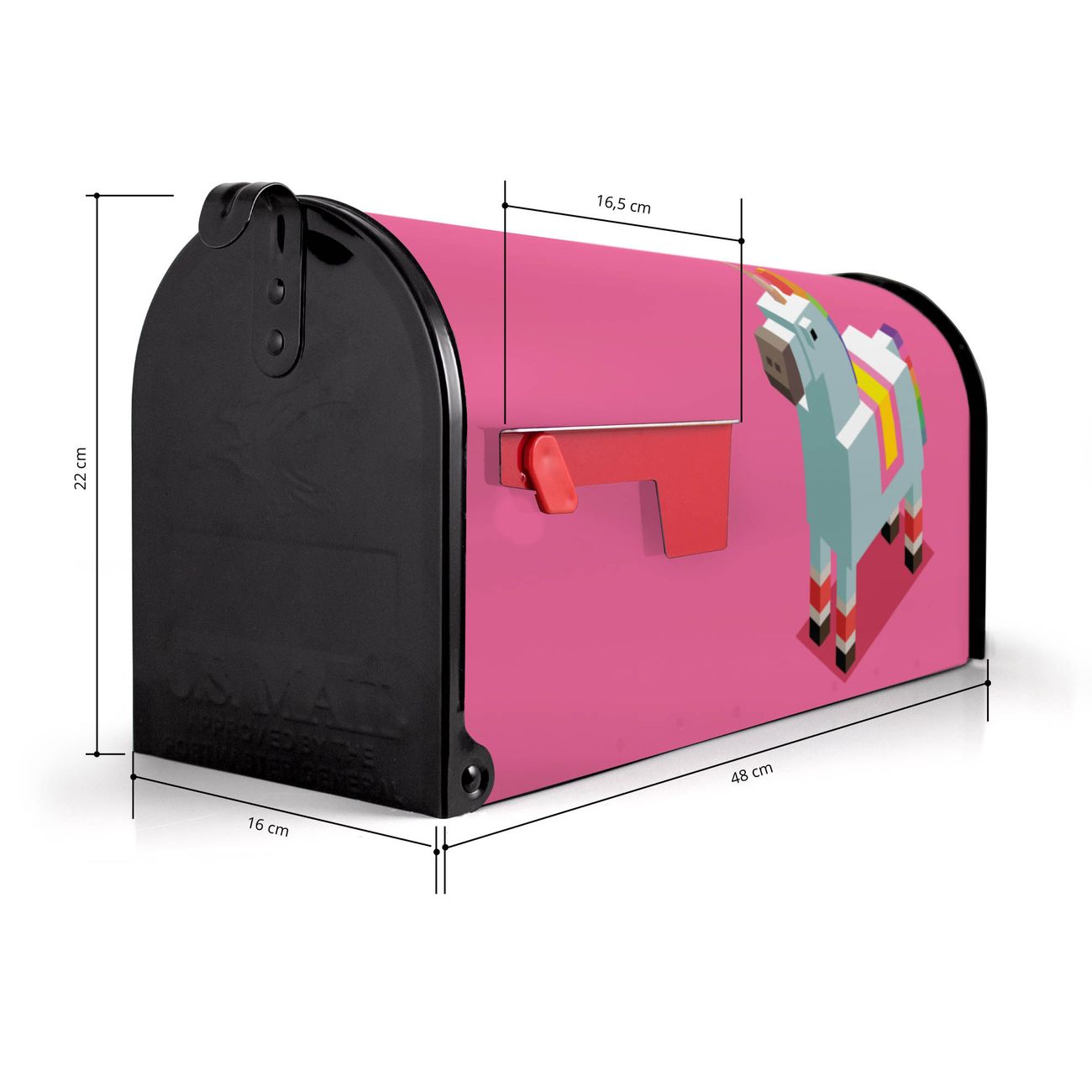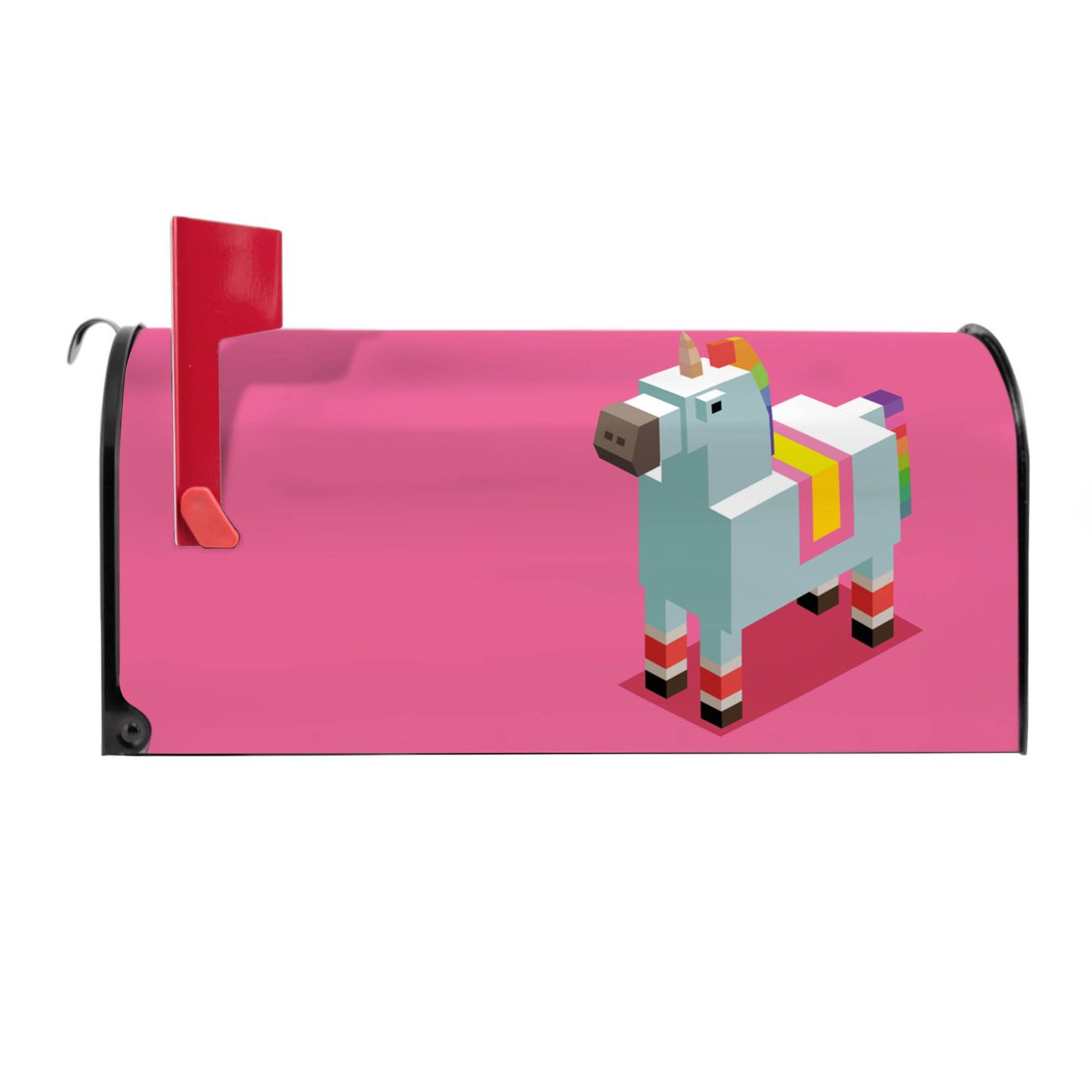 Der amerikanische Briefkasten von banjado mit Einhorn Block Motiv bietet Ihnen ausreichend Fassungsvermögen, um große A4 Sendungen und Zeitschriften zu empfangen. Die typisch amerikanische rote Fahne zeigt Ihnen an, wenn Sie Post erhalten haben. Die US-Mailbox besteht aus verzinktem Stahlblech welches lackiert wurde und ist 48 x 22 x 16 CM (BxHxT) groß. Die Folie mit Motiv Einhorn Block besteht aus einer wetter- und UV-resistenten Folie, die mit einem Schutzlaminat überzogen ist, sodass die US Mailbox zusätzlich vor Kratzern geschützt ist. An der Unterkante sind 4 Löcher je Seite um die Mailbox, typisch amerikanisch, an einem Holzpfahl oder einem Zaun zu befestigen. Auf Wunsch können Sie bei uns den passenden Standfuß oder die passende Wandhalterung kaufen um die US-Mailbox sicher zu befestigen. Wir bieten Ihnen ebenfalls Namensschilder, bereits beschriftet oder frei zu beschriften, und verschiedene selbst gestaltete Bitte-Keine-Werbung-Aufkleber.