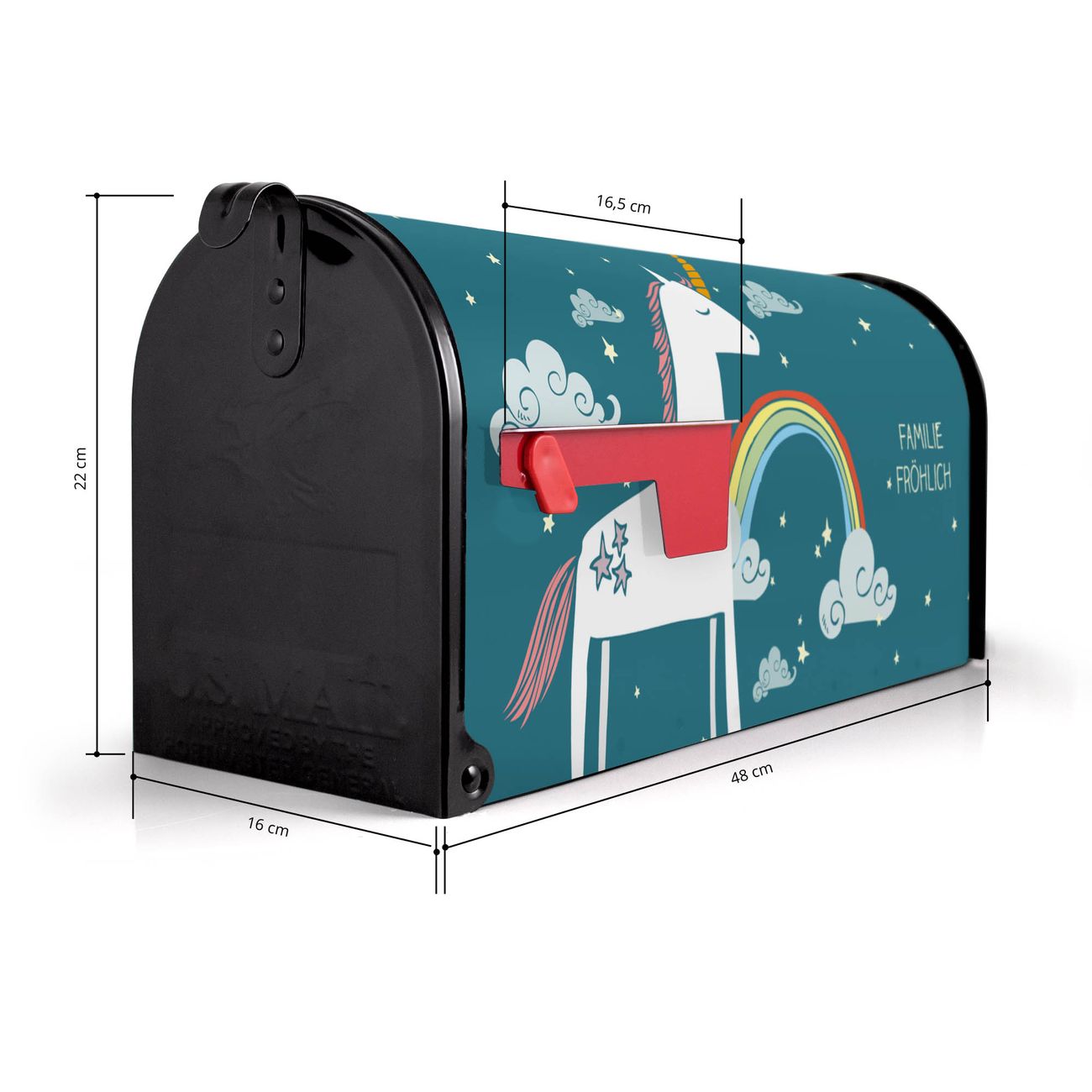 Der amerikanische Briefkasten von banjado mit Einhorn Motiv bietet Ihnen ausreichend Fassungsvermögen, um große A4 Sendungen und Zeitschriften zu empfangen. Die typisch amerikanische rote Fahne zeigt Ihnen an, wenn Sie Post erhalten haben. Die US-Mailbox besteht aus verzinktem Stahlblech welches lackiert wurde und ist 48 x 22 x 16 CM (BxHxT) groß. Die Folie mit Motiv Einhorn besteht aus einer wetter- und UV-resistenten Folie, die mit einem Schutzlaminat überzogen ist, sodass die US Mailbox zusätzlich vor Kratzern geschützt ist. An der Unterkante sind 4 Löcher je Seite um die Mailbox, typisch amerikanisch, an einem Holzpfahl oder einem Zaun zu befestigen. Auf Wunsch können Sie bei uns den passenden Standfuß oder die passende Wandhalterung kaufen um die US-Mailbox sicher zu befestigen. Wir bieten Ihnen ebenfalls Namensschilder, bereits beschriftet oder frei zu beschriften, und verschiedene selbst gestaltete Bitte-Keine-Werbung-Aufkleber.