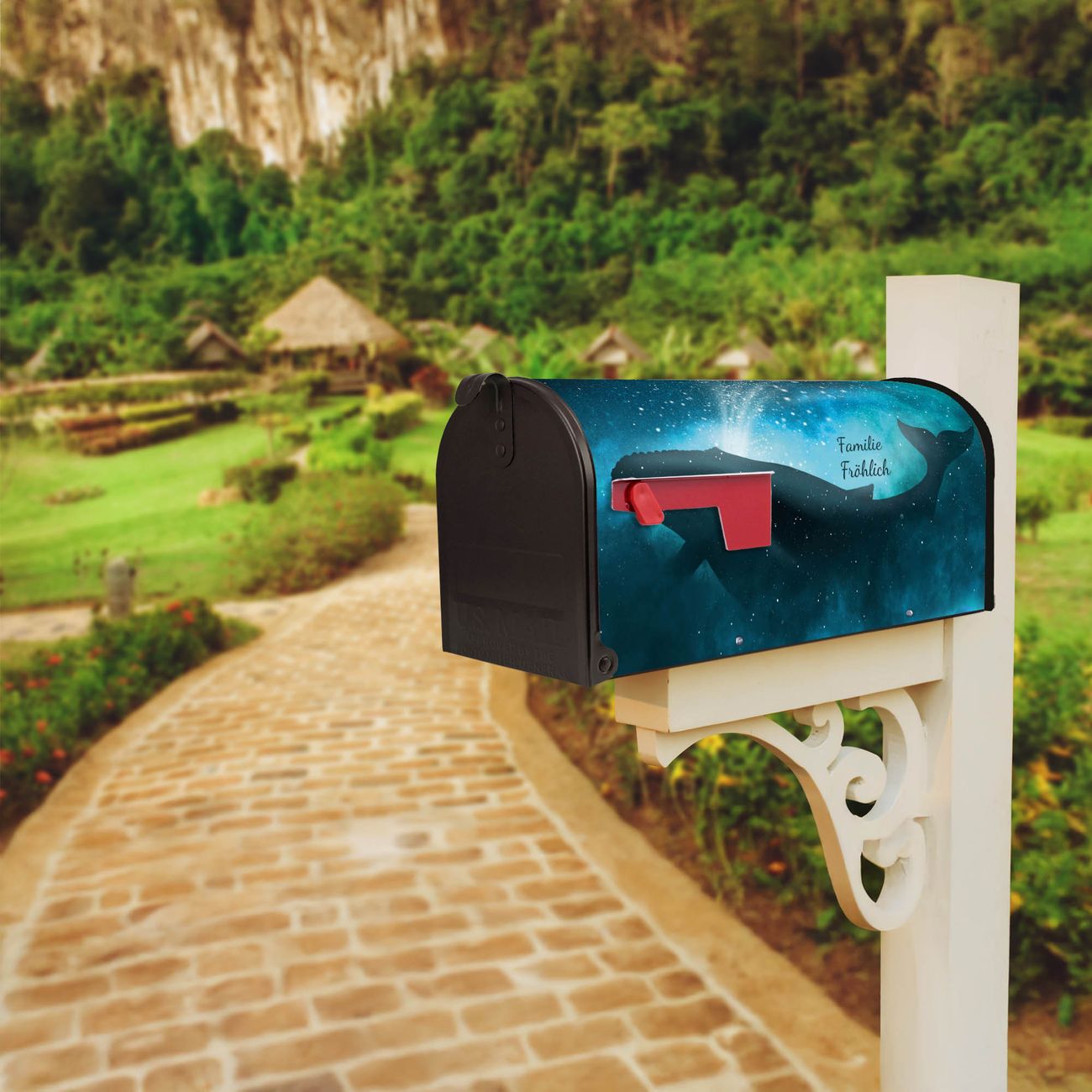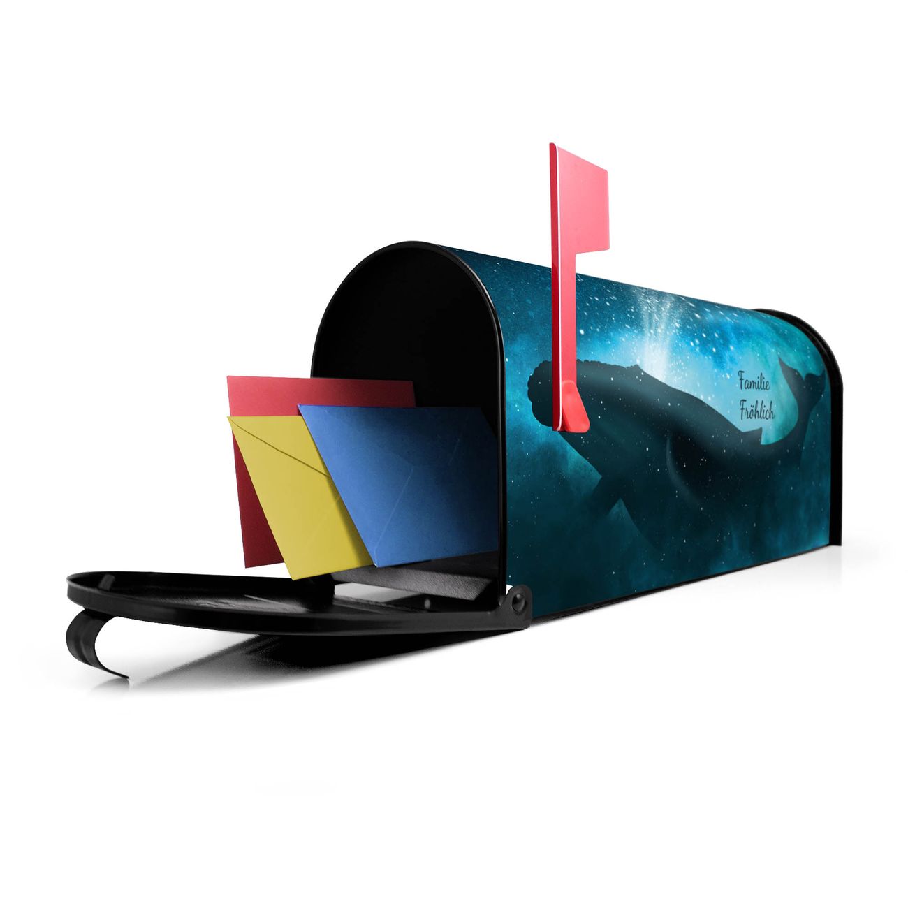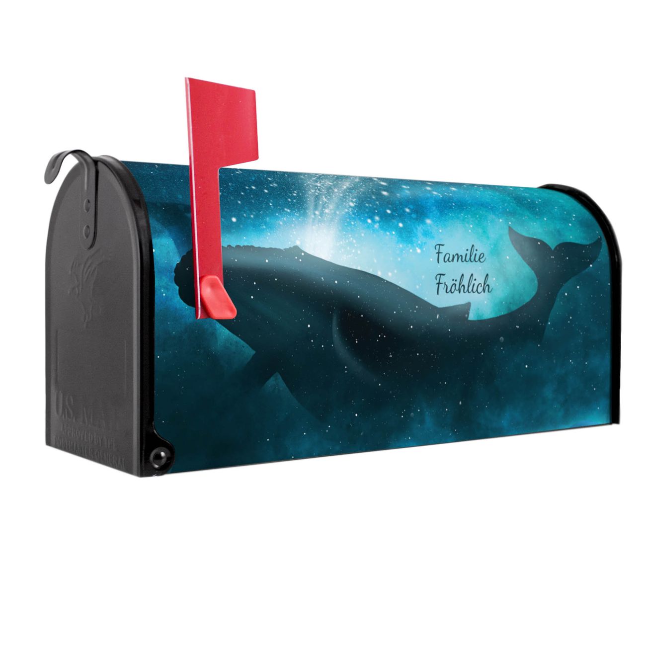 Unser amerikanischer Briefkasten mit dem Motiv fliegender Wal hat ein sehr ansprechendes und ausgefallenes Design, ist in der Grundfarbe weiß, grün oder schwarz erhältlich. Damit entlocken Sie Ihren Nachbarn und dem Postboten immer wieder ein Lächeln. Die Mailbox ist ein Original Import aus Mississippi USA und wird von unserer kleinen Manufaktur in Sachsen von Hand veredelt. Die US-Mailbox bietet ausreichend Platz auch für große Sendungen, eine Fahne die Ihnen Post anzeigt, wetterfestes und äußerst stabiles Material - so macht Post empfangen Freude.