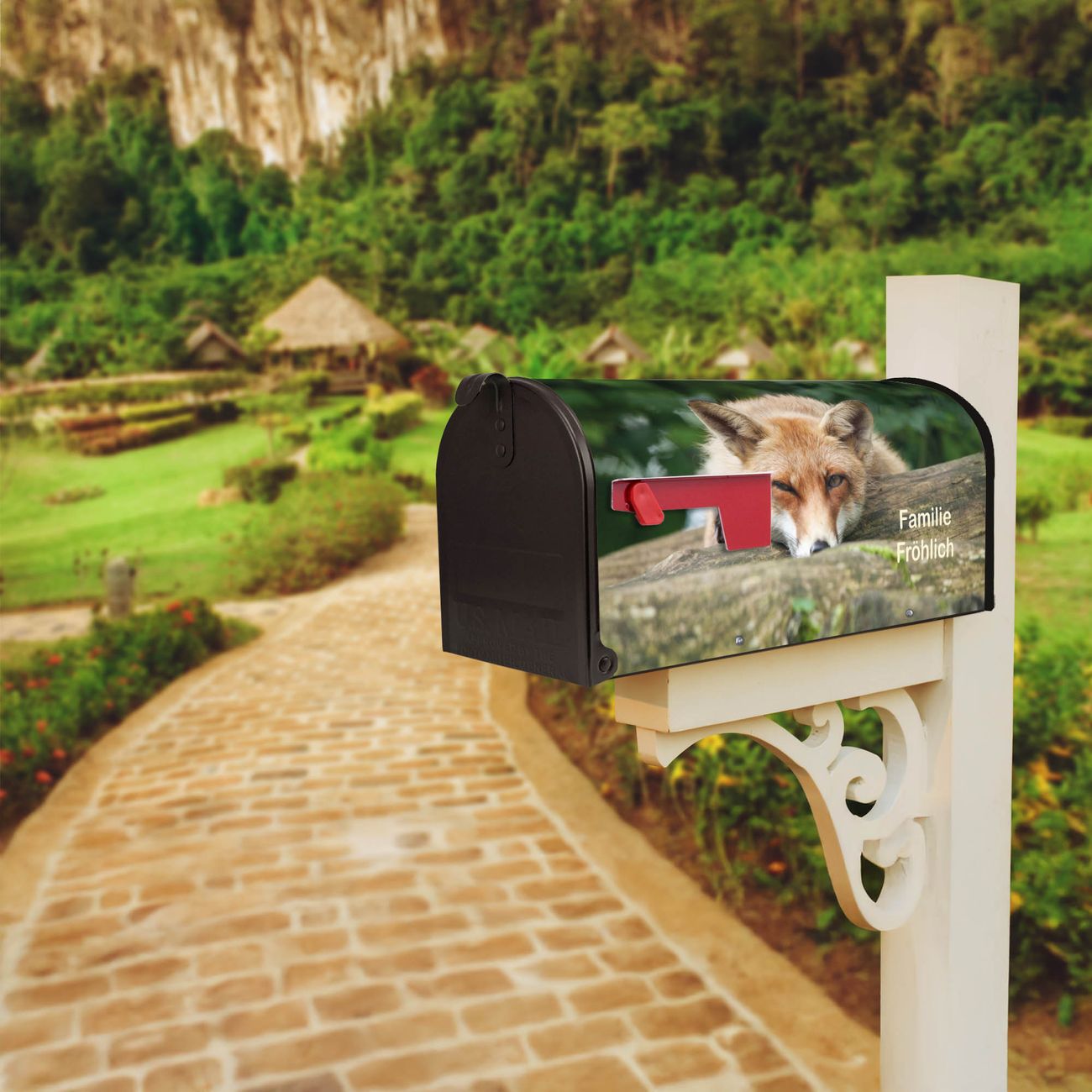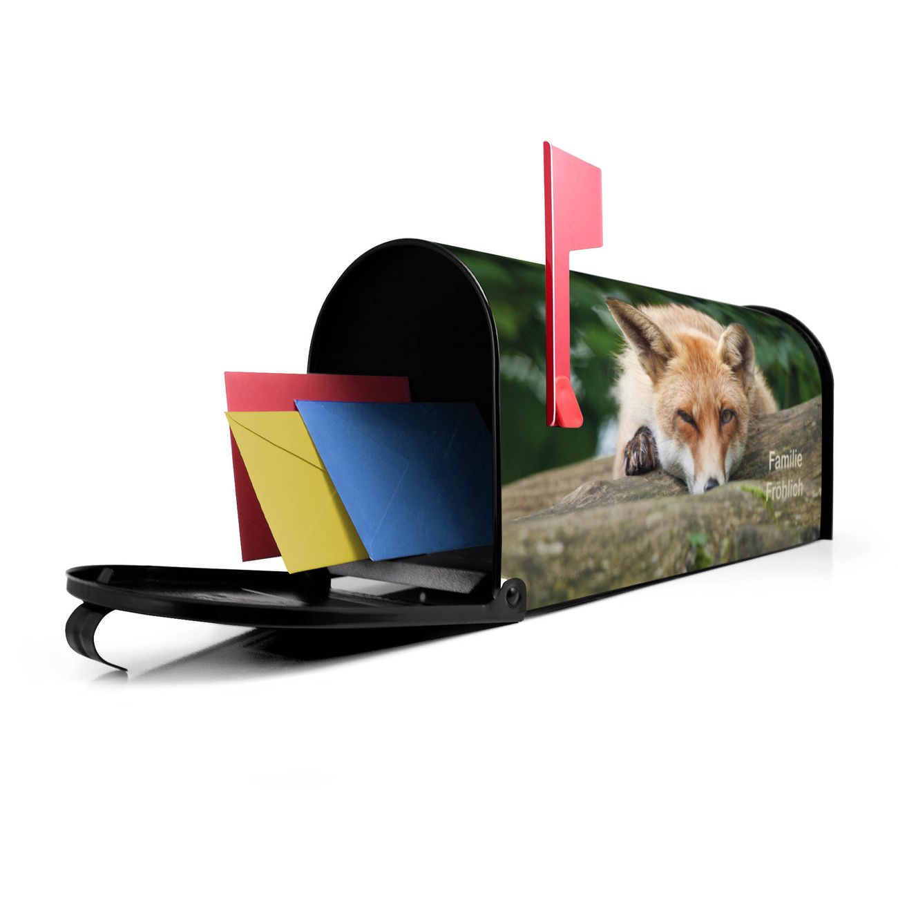 Der amerikanische Briefkasten von banjado mit Fuchs Relax Motiv bietet Ihnen ausreichend Fassungsvermögen, um große A4 Sendungen und Zeitschriften zu empfangen. Die typisch amerikanische rote Fahne zeigt Ihnen an, wenn Sie Post erhalten haben. Die US-Mailbox besteht aus verzinktem Stahlblech welches lackiert wurde und ist 48 x 22 x 16 CM (BxHxT) groß. Die Folie mit Motiv Fuchs Relax besteht aus einer wetter- und UV-resistenten Folie, die mit einem Schutzlaminat überzogen ist, sodass die US Mailbox zusätzlich vor Kratzern geschützt ist. An der Unterkante sind 4 Löcher je Seite um die Mailbox, typisch amerikanisch, an einem Holzpfahl oder einem Zaun zu befestigen. Auf Wunsch können Sie bei uns den passenden Standfuß oder die passende Wandhalterung kaufen um die US-Mailbox sicher zu befestigen. Wir bieten Ihnen ebenfalls Namensschilder, bereits beschriftet oder frei zu beschriften, und verschiedene selbst gestaltete Bitte-Keine-Werbung-Aufkleber.
