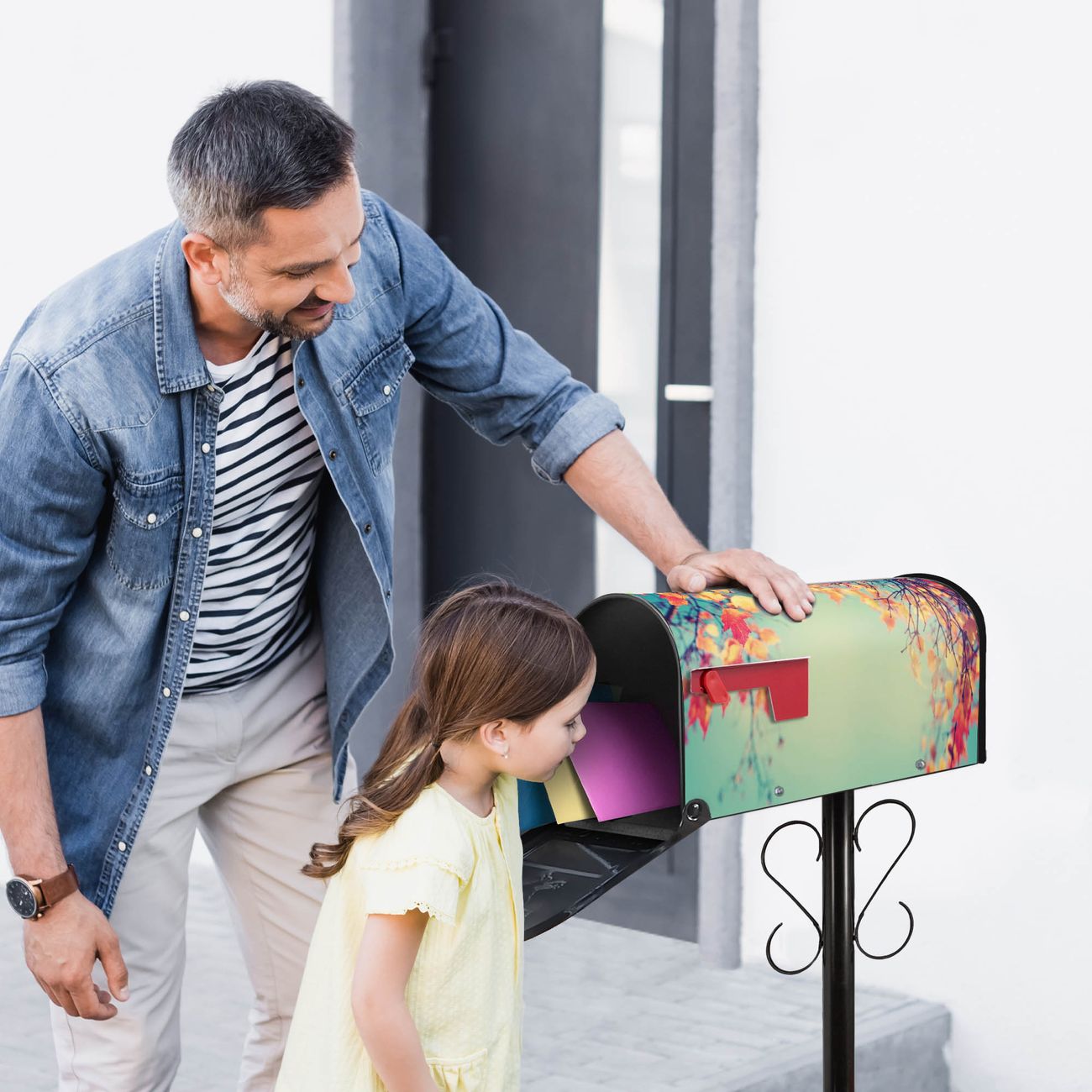 Der amerikanische Briefkasten von banjado mit Herbst Motiv bietet Ihnen ausreichend Fassungsvermögen, um große A4 Sendungen und Zeitschriften zu empfangen. Die typisch amerikanische rote Fahne zeigt Ihnen an, wenn Sie Post erhalten haben. Die US-Mailbox besteht aus verzinktem Stahlblech welches lackiert wurde und ist 48 x 22 x 16 CM (BxHxT) groß. Die Folie mit Motiv Herbst besteht aus einer wetter- und UV-resistenten Folie, die mit einem Schutzlaminat überzogen ist, sodass die US Mailbox zusätzlich vor Kratzern geschützt ist. An der Unterkante sind 4 Löcher je Seite um die Mailbox, typisch amerikanisch, an einem Holzpfahl oder einem Zaun zu befestigen. Auf Wunsch können Sie bei uns den passenden Standfuß oder die passende Wandhalterung kaufen um die US-Mailbox sicher zu befestigen. Wir bieten Ihnen ebenfalls Namensschilder, bereits beschriftet oder frei zu beschriften, und verschiedene selbst gestaltete Bitte-Keine-Werbung-Aufkleber.