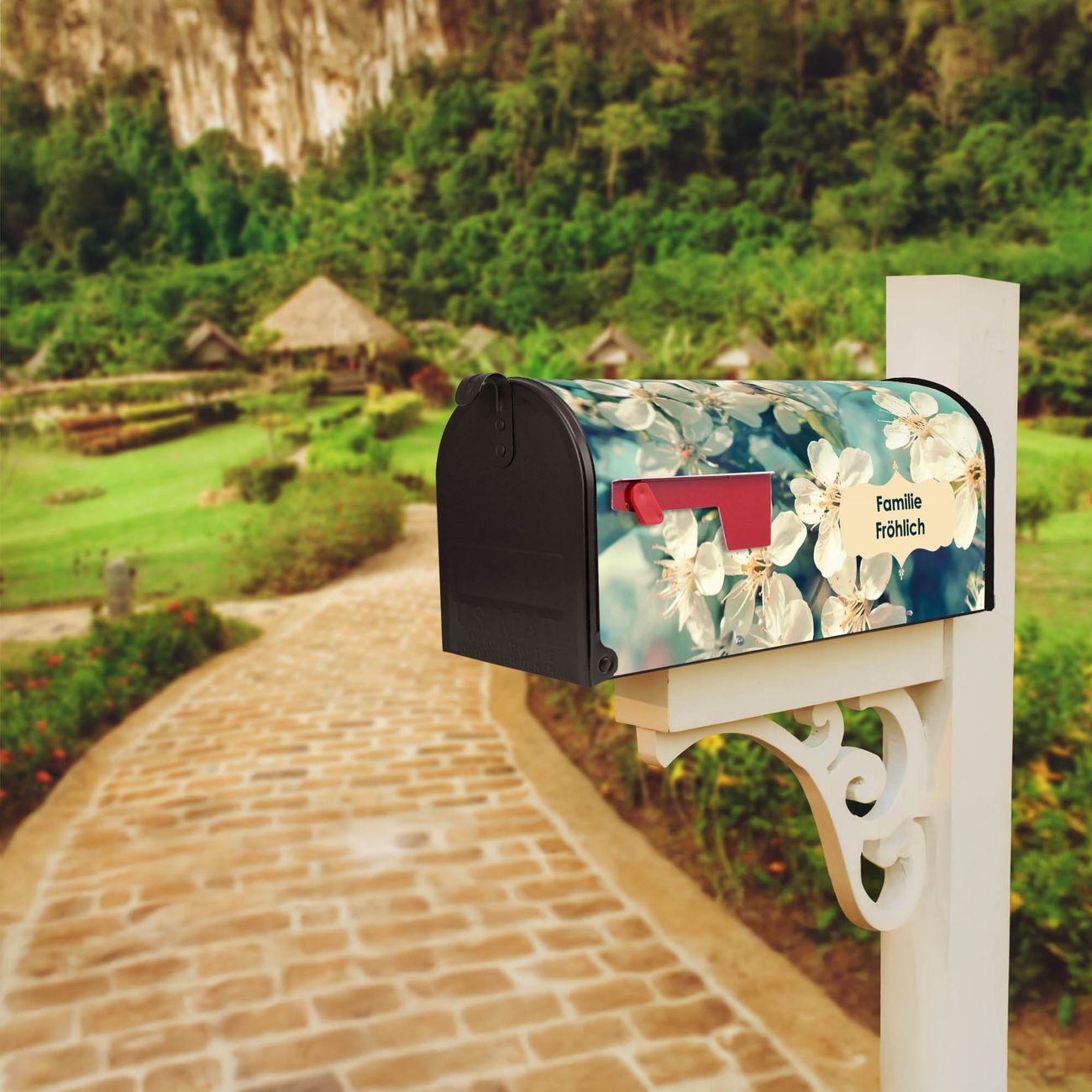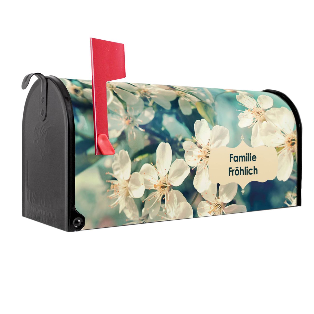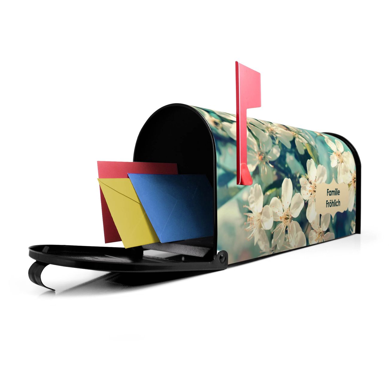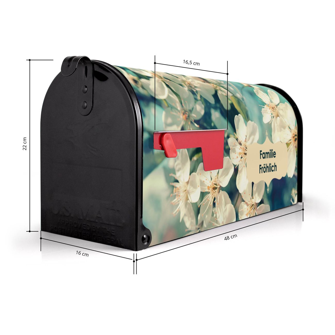 Der amerikanische Briefkasten von banjado mit Kirschblüten 2 Motiv bietet Ihnen ausreichend Fassungsvermögen, um große A4 Sendungen und Zeitschriften zu empfangen. Die typisch amerikanische rote Fahne zeigt Ihnen an, wenn Sie Post erhalten haben. Die US-Mailbox besteht aus verzinktem Stahlblech welches lackiert wurde und ist 48 x 22 x 16 CM (BxHxT) groß. Die Folie mit Motiv Kirschblüten 2 besteht aus einer wetter- und UV-resistenten Folie, die mit einem Schutzlaminat überzogen ist, sodass die US Mailbox zusätzlich vor Kratzern geschützt ist. An der Unterkante sind 4 Löcher je Seite um die Mailbox, typisch amerikanisch, an einem Holzpfahl oder einem Zaun zu befestigen. Auf Wunsch können Sie bei uns den passenden Standfuß oder die passende Wandhalterung kaufen um die US-Mailbox sicher zu befestigen. Wir bieten Ihnen ebenfalls Namensschilder, bereits beschriftet oder frei zu beschriften, und verschiedene selbst gestaltete Bitte-Keine-Werbung-Aufkleber.
