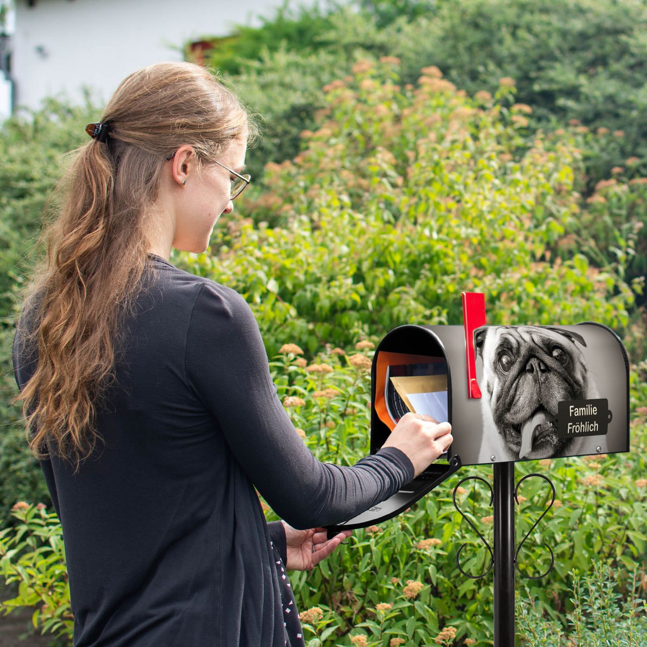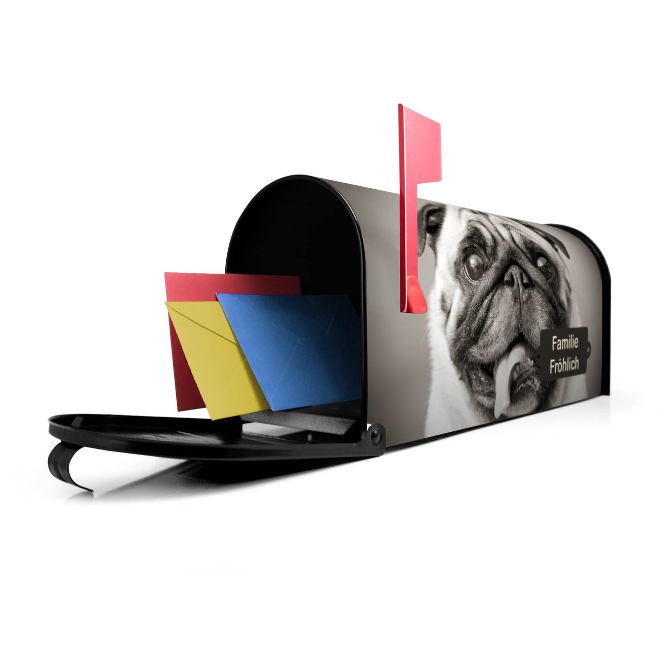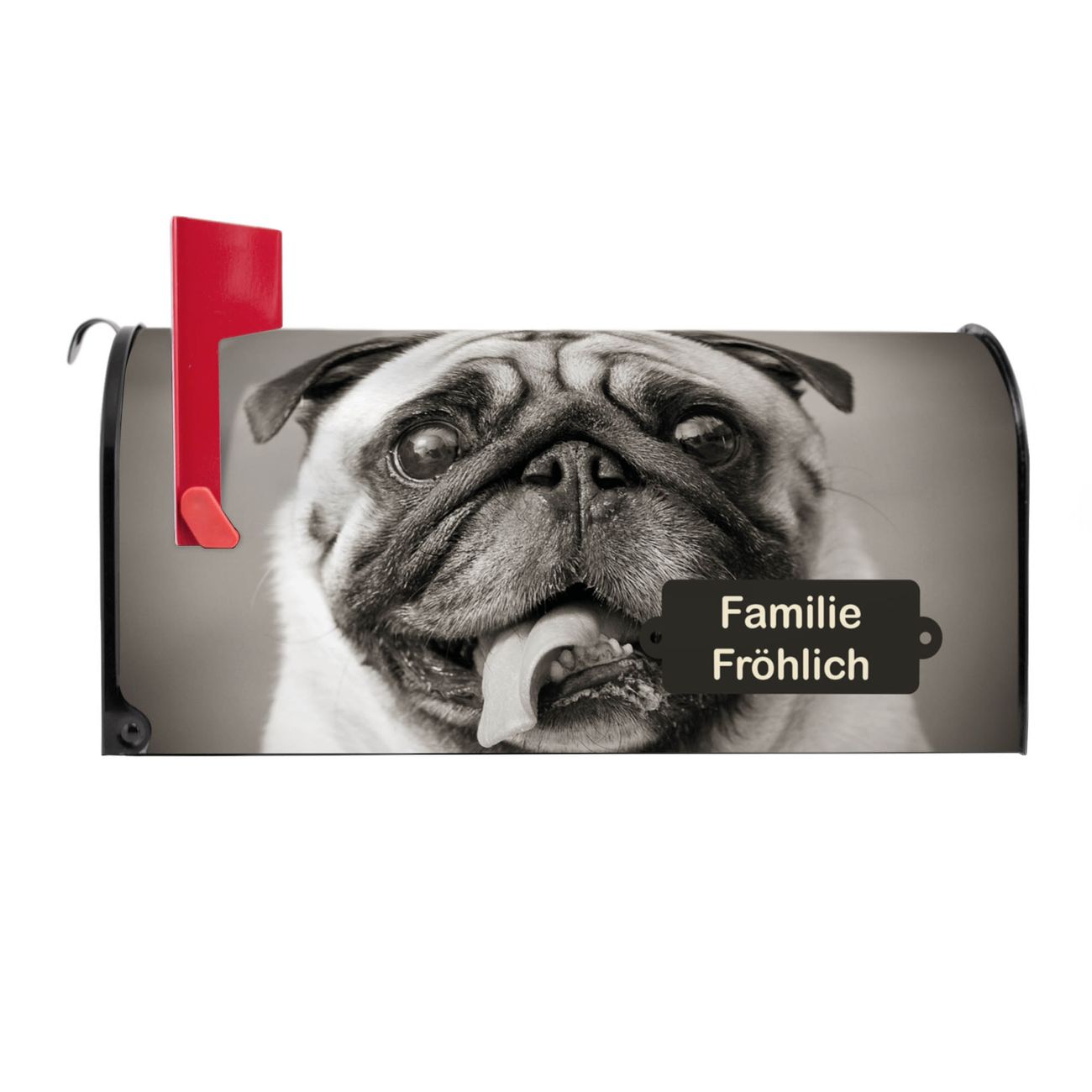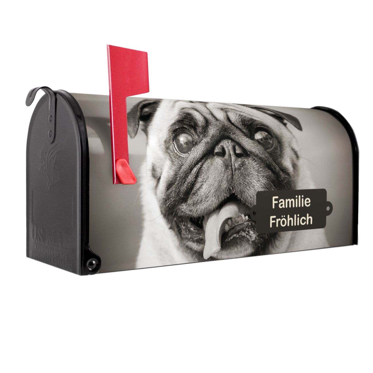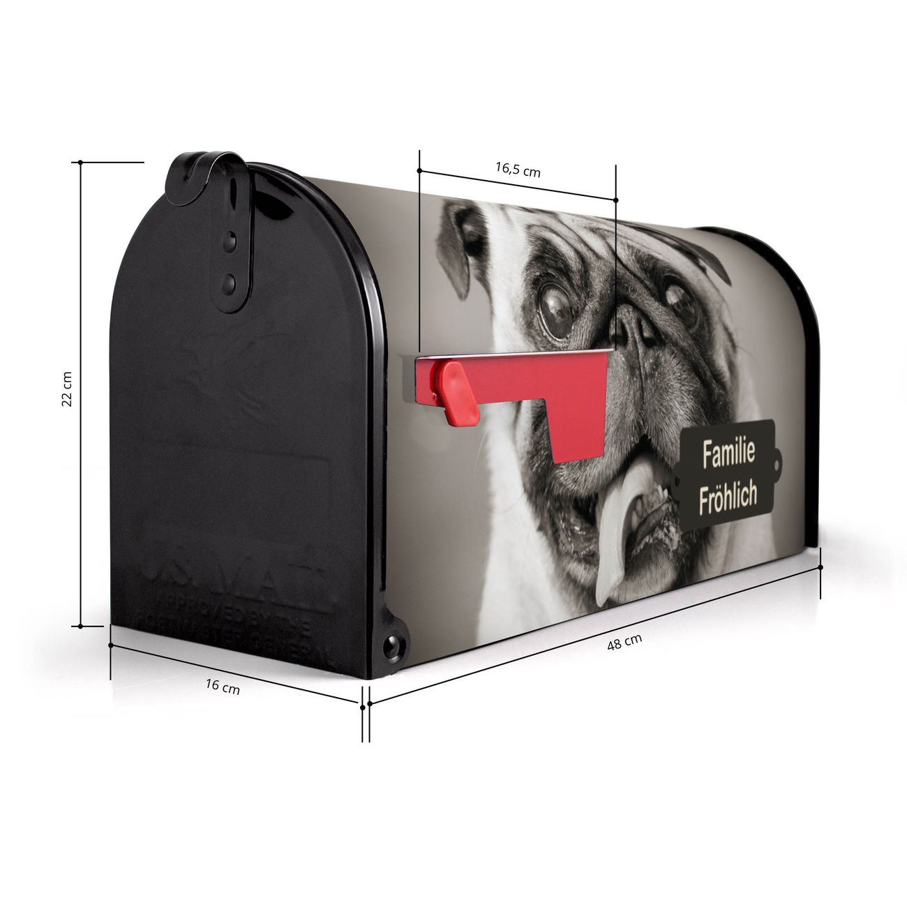 Der amerikanische Briefkasten von banjado mit Mops Porträt Motiv bietet Ihnen ausreichend Fassungsvermögen, um große A4 Sendungen und Zeitschriften zu empfangen. Die typisch amerikanische rote Fahne zeigt Ihnen an, wenn Sie Post erhalten haben. Die US-Mailbox besteht aus verzinktem Stahlblech welches lackiert wurde und ist 48 x 22 x 16 CM (BxHxT) groß. Die Folie mit Motiv Mops Porträt besteht aus einer wetter- und UV-resistenten Folie, die mit einem Schutzlaminat überzogen ist, sodass die US Mailbox zusätzlich vor Kratzern geschützt ist. An der Unterkante sind 4 Löcher je Seite um die Mailbox, typisch amerikanisch, an einem Holzpfahl oder einem Zaun zu befestigen. Auf Wunsch können Sie bei uns den passenden Standfuß oder die passende Wandhalterung kaufen um die US-Mailbox sicher zu befestigen. Wir bieten Ihnen ebenfalls Namensschilder, bereits beschriftet oder frei zu beschriften, und verschiedene selbst gestaltete Bitte-Keine-Werbung-Aufkleber.