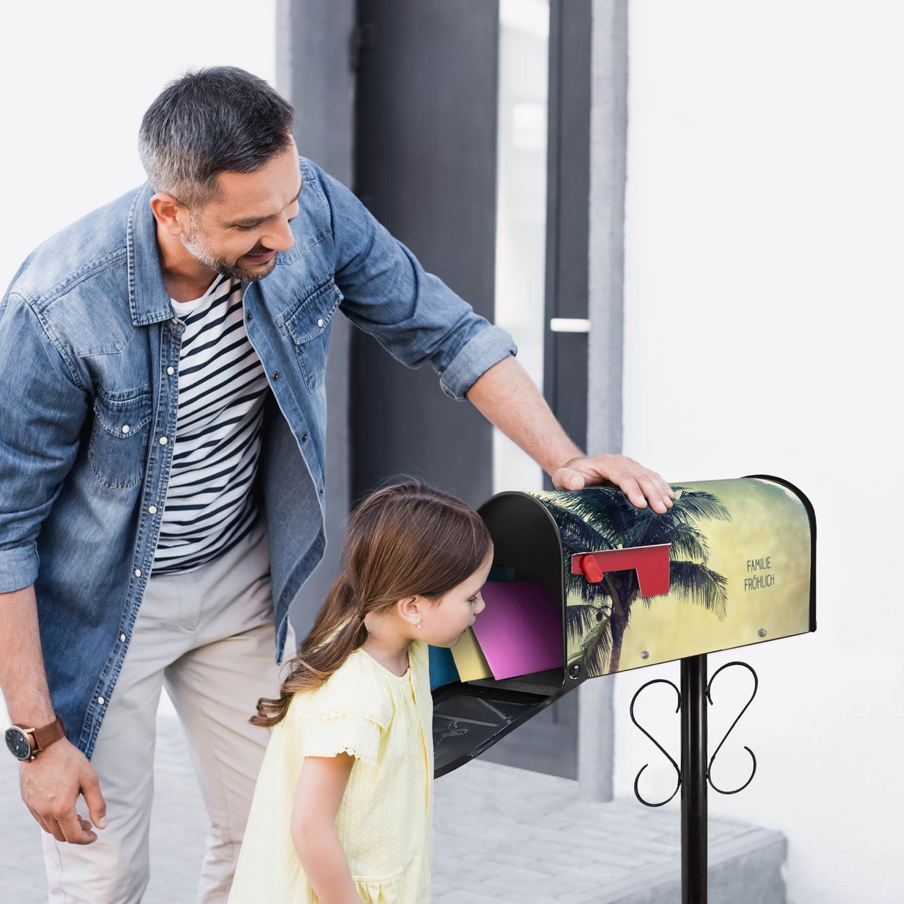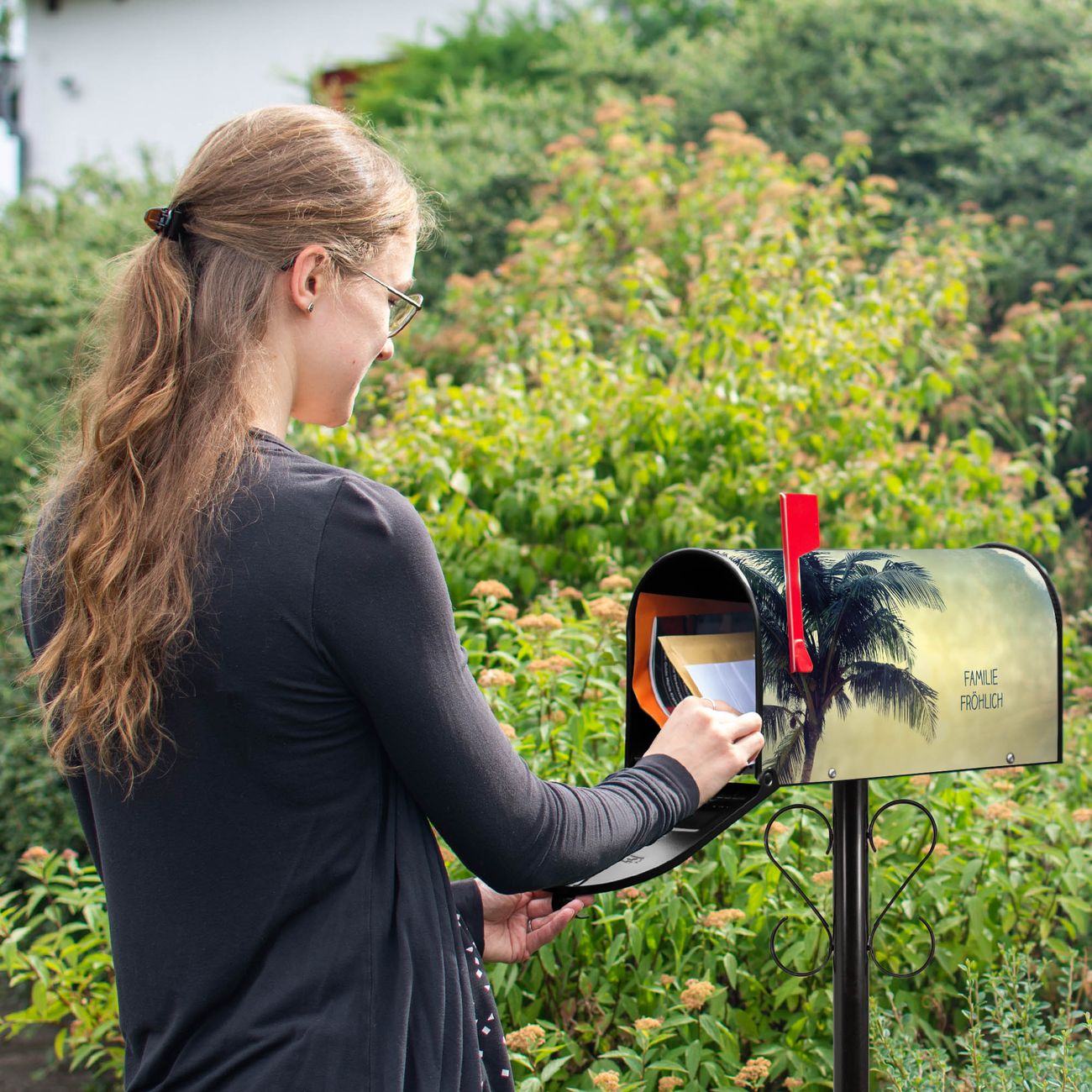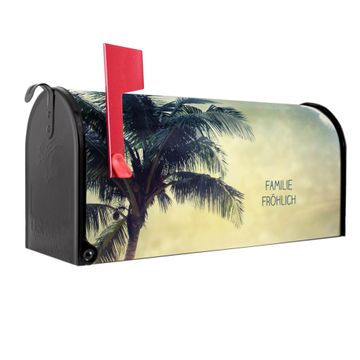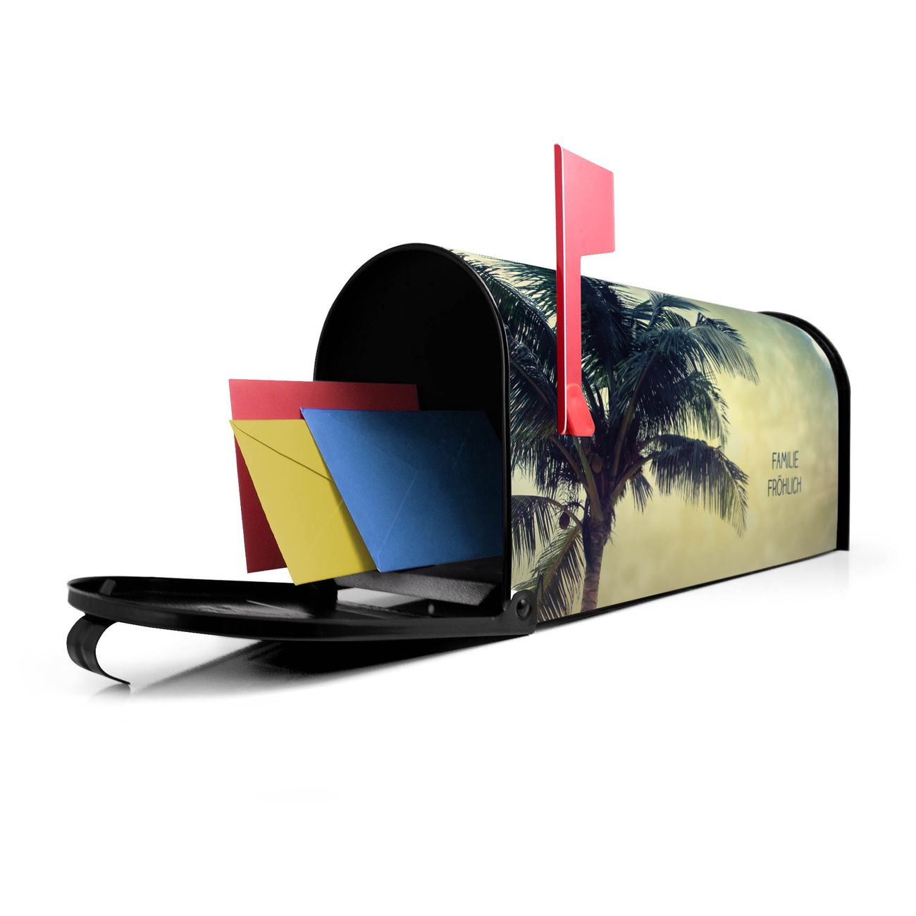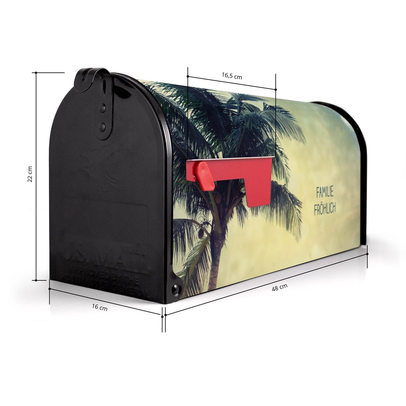 Der amerikanische Briefkasten von banjado mit Palme am Strand Motiv bietet Ihnen ausreichend Fassungsvermögen, um große A4 Sendungen und Zeitschriften zu empfangen. Die typisch amerikanische rote Fahne zeigt Ihnen an, wenn Sie Post erhalten haben. Die US-Mailbox besteht aus verzinktem Stahlblech welches lackiert wurde und ist 48 x 22 x 16 CM (BxHxT) groß. Die Folie mit Motiv Palme am Strand besteht aus einer wetter- und UV-resistenten Folie, die mit einem Schutzlaminat überzogen ist, sodass die US Mailbox zusätzlich vor Kratzern geschützt ist. An der Unterkante sind 4 Löcher je Seite um die Mailbox, typisch amerikanisch, an einem Holzpfahl oder einem Zaun zu befestigen. Auf Wunsch können Sie bei uns den passenden Standfuß oder die passende Wandhalterung kaufen um die US-Mailbox sicher zu befestigen. Wir bieten Ihnen ebenfalls Namensschilder, bereits beschriftet oder frei zu beschriften, und verschiedene selbst gestaltete Bitte-Keine-Werbung-Aufkleber.