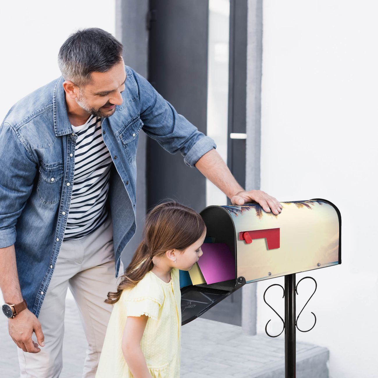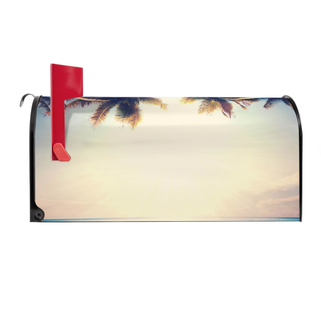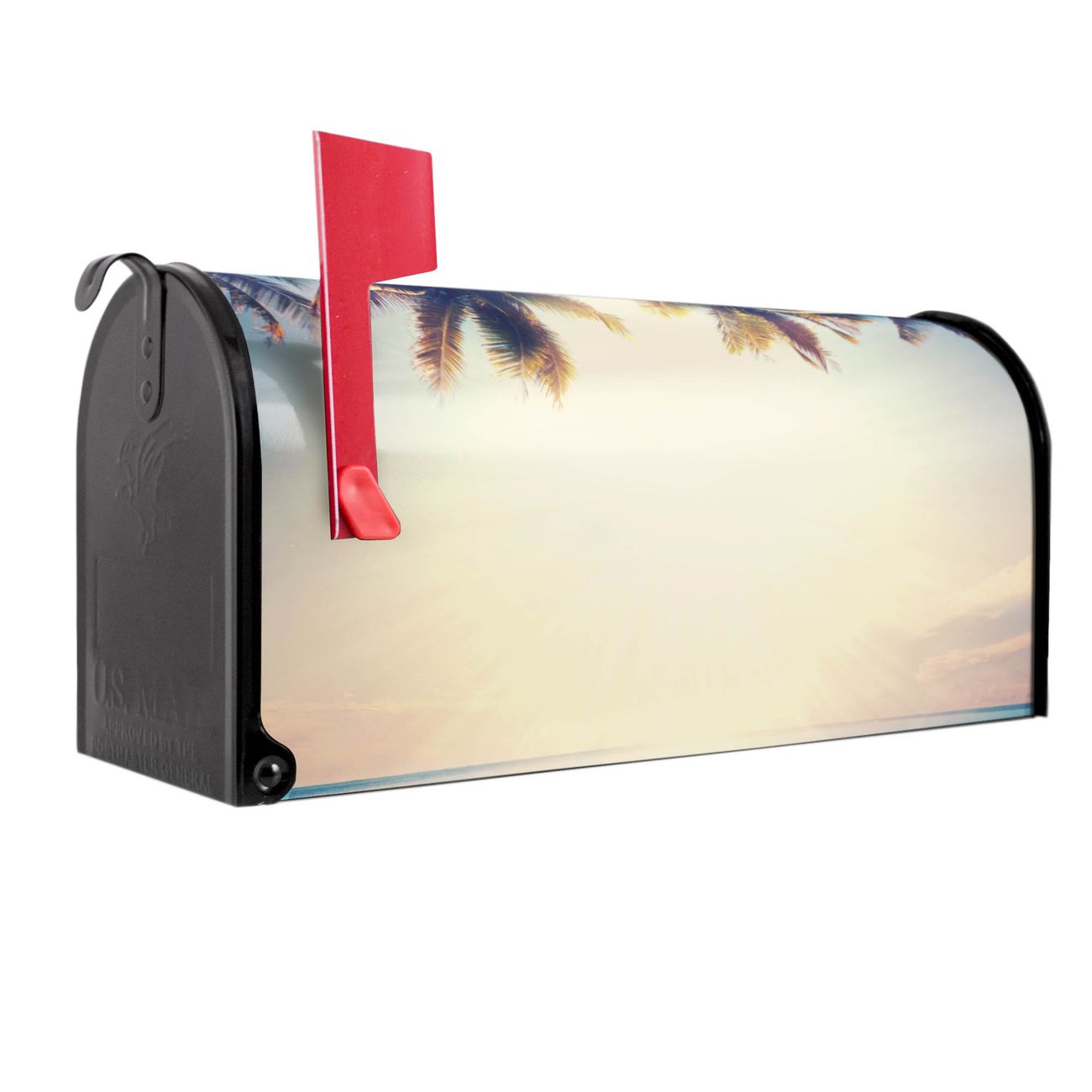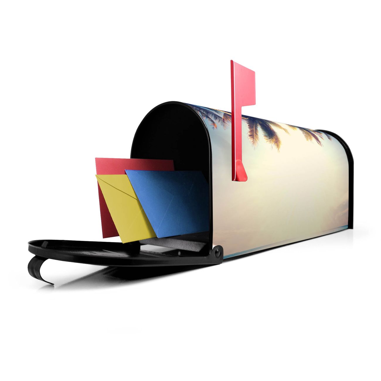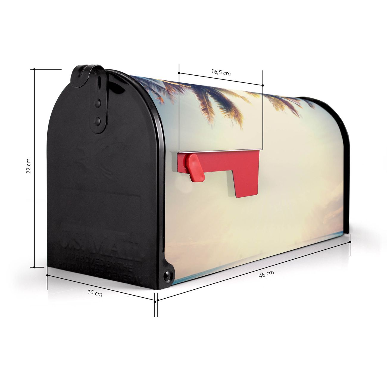 Der amerikanische Briefkasten von banjado mit Paradis Motiv bietet Ihnen ausreichend Fassungsvermögen, um große A4 Sendungen und Zeitschriften zu empfangen. Die typisch amerikanische rote Fahne zeigt Ihnen an, wenn Sie Post erhalten haben. Die US-Mailbox besteht aus verzinktem Stahlblech welches lackiert wurde und ist 48 x 22 x 16 CM (BxHxT) groß. Die Folie mit Motiv Paradis besteht aus einer wetter- und UV-resistenten Folie, die mit einem Schutzlaminat überzogen ist, sodass die US Mailbox zusätzlich vor Kratzern geschützt ist. An der Unterkante sind 4 Löcher je Seite um die Mailbox, typisch amerikanisch, an einem Holzpfahl oder einem Zaun zu befestigen. Auf Wunsch können Sie bei uns den passenden Standfuß oder die passende Wandhalterung kaufen um die US-Mailbox sicher zu befestigen. Wir bieten Ihnen ebenfalls Namensschilder, bereits beschriftet oder frei zu beschriften, und verschiedene selbst gestaltete Bitte-Keine-Werbung-Aufkleber.