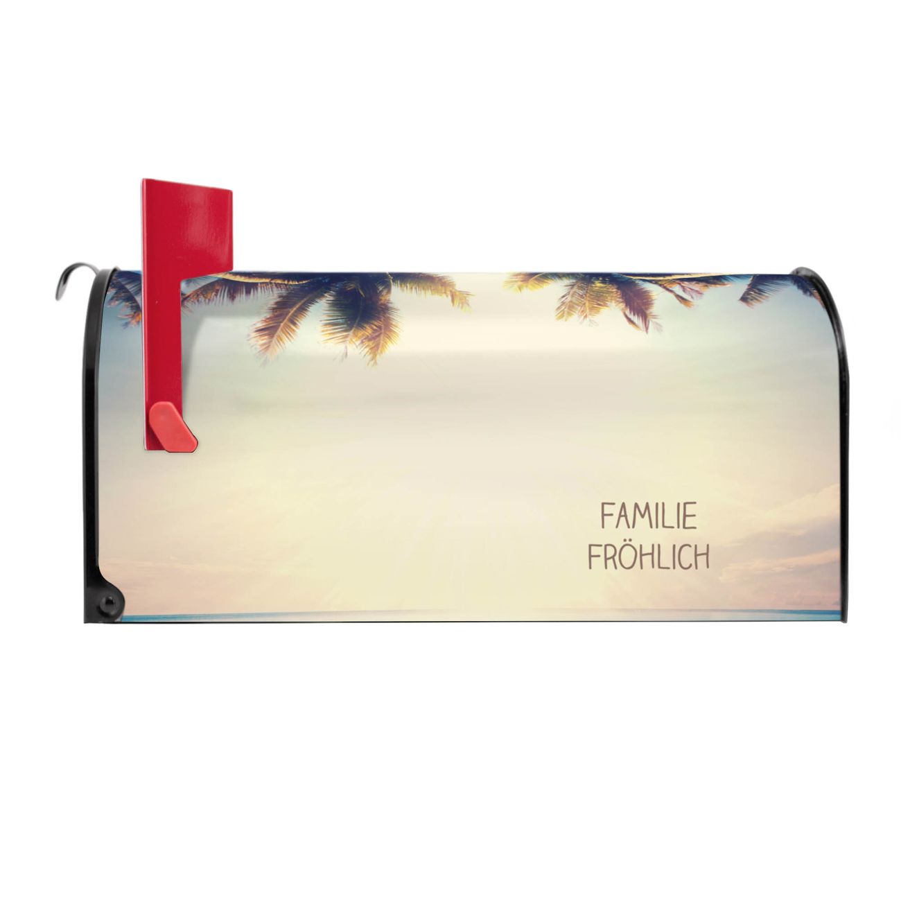 Der amerikanische Briefkasten von banjado mit Paradis Motiv bietet Ihnen ausreichend Fassungsvermögen, um große A4 Sendungen und Zeitschriften zu empfangen. Die typisch amerikanische rote Fahne zeigt Ihnen an, wenn Sie Post erhalten haben. Die US-Mailbox besteht aus verzinktem Stahlblech welches lackiert wurde und ist 48 x 22 x 16 CM (BxHxT) groß. Die Folie mit Motiv Paradis besteht aus einer wetter- und UV-resistenten Folie, die mit einem Schutzlaminat überzogen ist, sodass die US Mailbox zusätzlich vor Kratzern geschützt ist. An der Unterkante sind 4 Löcher je Seite um die Mailbox, typisch amerikanisch, an einem Holzpfahl oder einem Zaun zu befestigen. Auf Wunsch können Sie bei uns den passenden Standfuß oder die passende Wandhalterung kaufen um die US-Mailbox sicher zu befestigen. Wir bieten Ihnen ebenfalls Namensschilder, bereits beschriftet oder frei zu beschriften, und verschiedene selbst gestaltete Bitte-Keine-Werbung-Aufkleber.