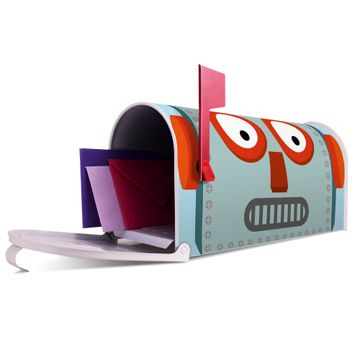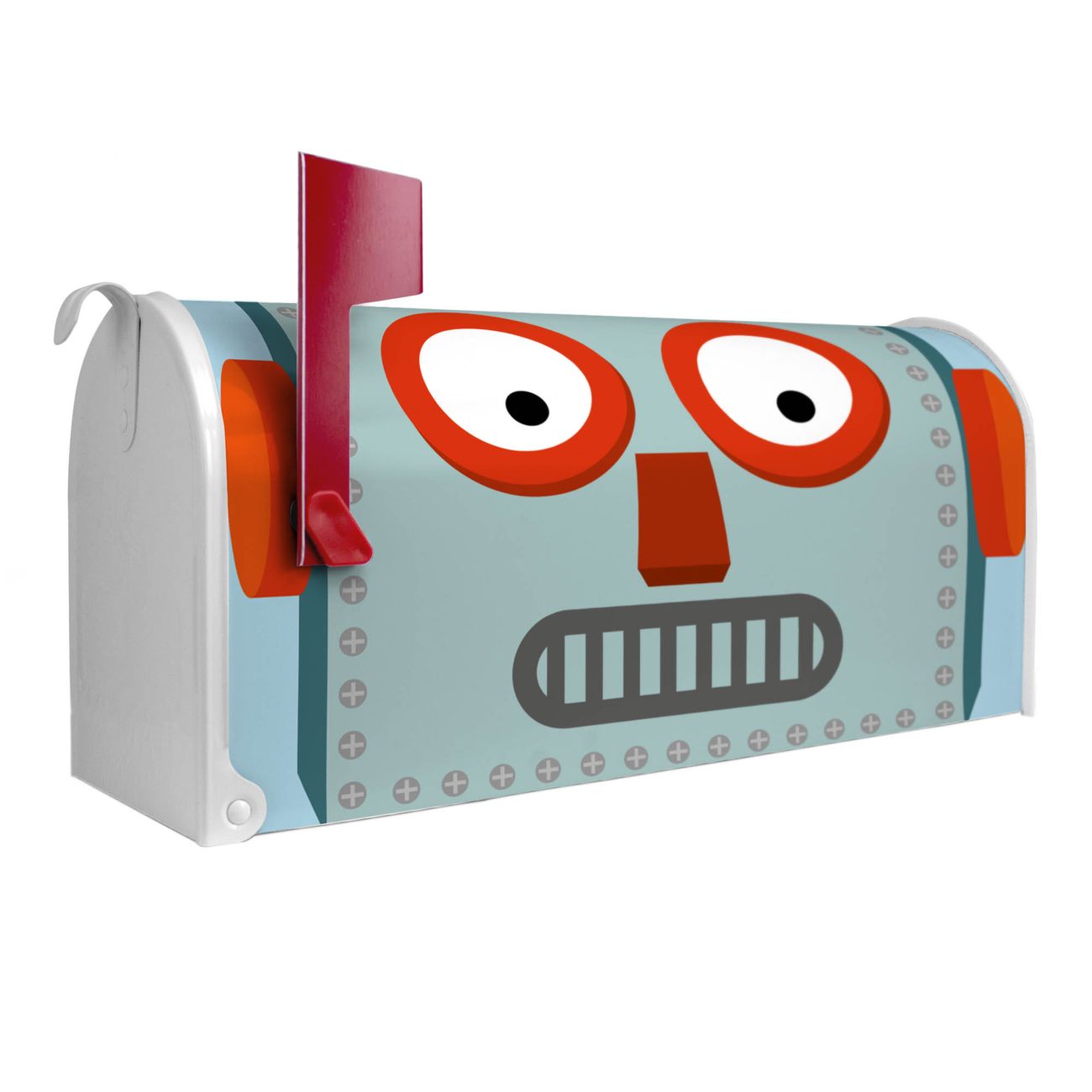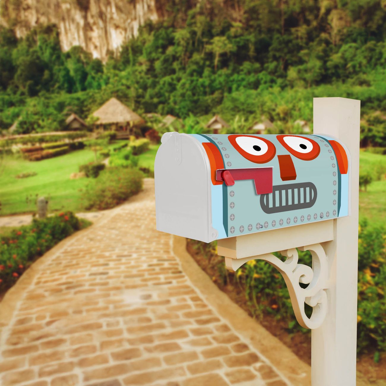 Der amerikanische Briefkasten von banjado mit Shocked Robot Motiv bietet Ihnen ausreichend Fassungsvermögen, um große A4 Sendungen und Zeitschriften zu empfangen. Die typisch amerikanische rote Fahne zeigt Ihnen an, wenn Sie Post erhalten haben. Die US-Mailbox besteht aus verzinktem Stahlblech welches lackiert wurde und ist 48 x 22 x 16 CM (BxHxT) groß. Die Folie mit Motiv Shocked Robot besteht aus einer wetter- und UV-resistenten Folie, die mit einem Schutzlaminat überzogen ist, sodass die US Mailbox zusätzlich vor Kratzern geschützt ist. An der Unterkante sind 4 Löcher je Seite um die Mailbox, typisch amerikanisch, an einem Holzpfahl oder einem Zaun zu befestigen. Auf Wunsch können Sie bei uns den passenden Standfuß oder die passende Wandhalterung kaufen um die US-Mailbox sicher zu befestigen. Wir bieten Ihnen ebenfalls Namensschilder, bereits beschriftet oder frei zu beschriften, und verschiedene selbst gestaltete Bitte-Keine-Werbung-Aufkleber.