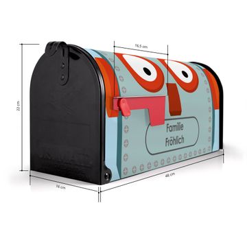 Der amerikanische Briefkasten von banjado mit Shocked Robot Motiv bietet Ihnen ausreichend Fassungsvermögen, um große A4 Sendungen und Zeitschriften zu empfangen. Die typisch amerikanische rote Fahne zeigt Ihnen an, wenn Sie Post erhalten haben. Die US-Mailbox besteht aus verzinktem Stahlblech welches lackiert wurde und ist 48 x 22 x 16 CM (BxHxT) groß. Die Folie mit Motiv Shocked Robot besteht aus einer wetter- und UV-resistenten Folie, die mit einem Schutzlaminat überzogen ist, sodass die US Mailbox zusätzlich vor Kratzern geschützt ist. An der Unterkante sind 4 Löcher je Seite um die Mailbox, typisch amerikanisch, an einem Holzpfahl oder einem Zaun zu befestigen. Auf Wunsch können Sie bei uns den passenden Standfuß oder die passende Wandhalterung kaufen um die US-Mailbox sicher zu befestigen. Wir bieten Ihnen ebenfalls Namensschilder, bereits beschriftet oder frei zu beschriften, und verschiedene selbst gestaltete Bitte-Keine-Werbung-Aufkleber.