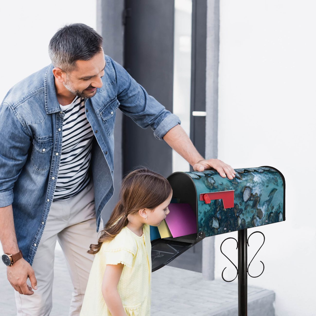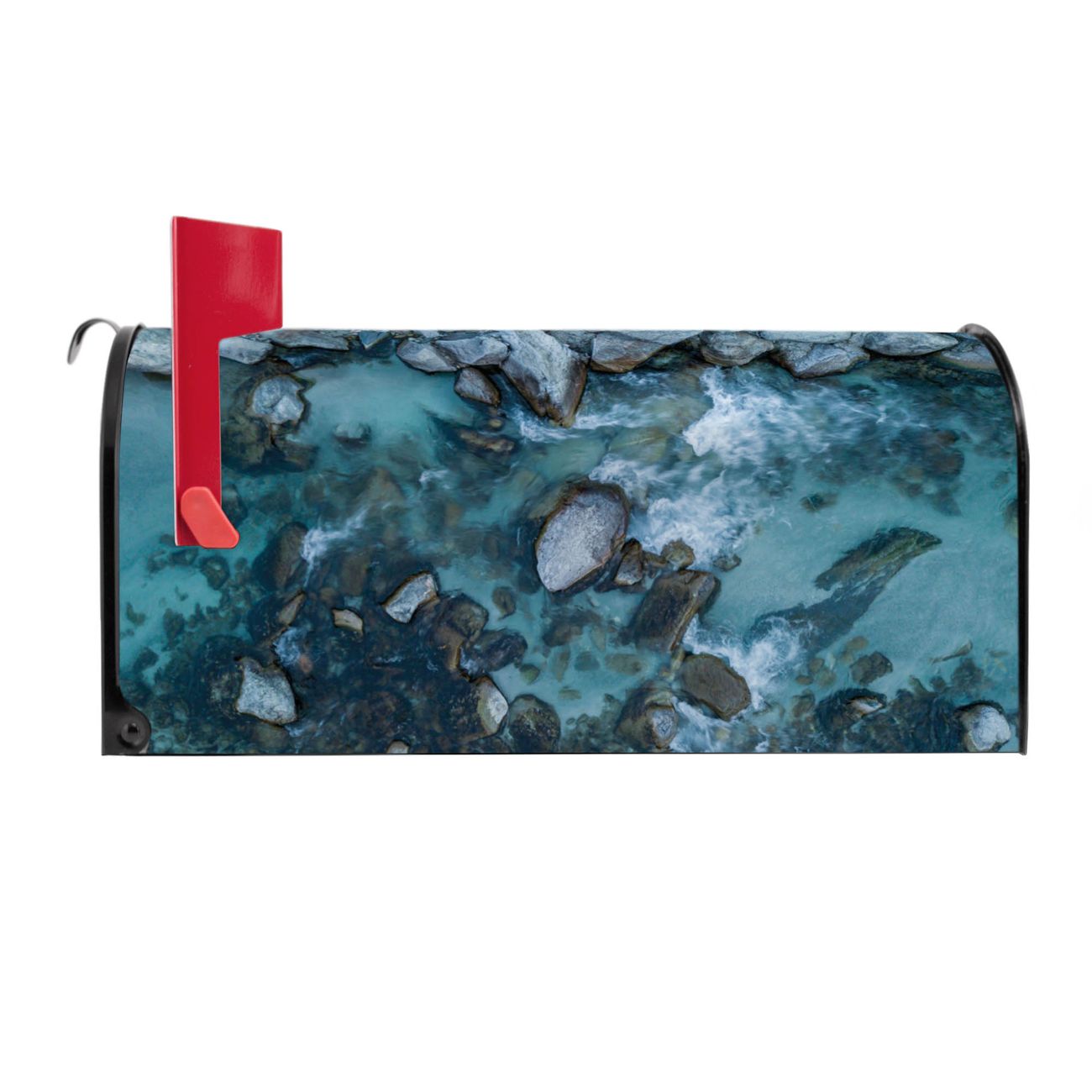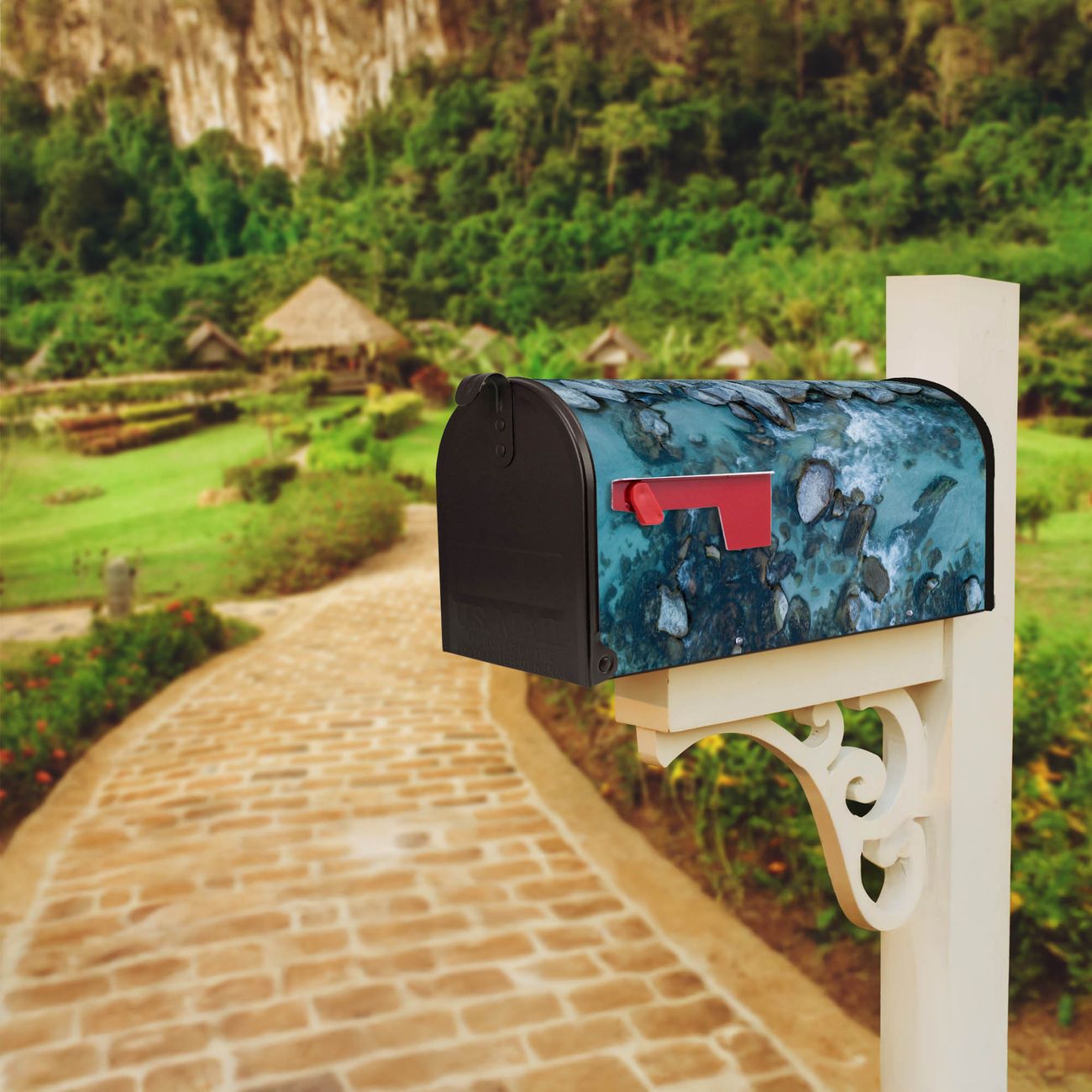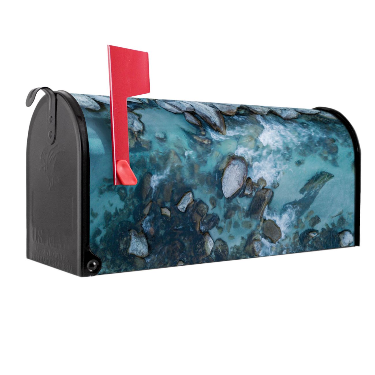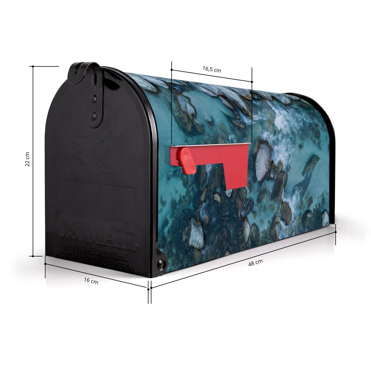 Der amerikanische Briefkasten von banjado mit Steinbucht 2 Motiv bietet Ihnen ausreichend Fassungsvermögen, um große A4 Sendungen und Zeitschriften zu empfangen. Die typisch amerikanische rote Fahne zeigt Ihnen an, wenn Sie Post erhalten haben. Die US-Mailbox besteht aus verzinktem Stahlblech welches lackiert wurde und ist 48 x 22 x 16 CM (BxHxT) groß. Die Folie mit Motiv Steinbucht 2 besteht aus einer wetter- und UV-resistenten Folie, die mit einem Schutzlaminat überzogen ist, sodass die US Mailbox zusätzlich vor Kratzern geschützt ist. An der Unterkante sind 4 Löcher je Seite um die Mailbox, typisch amerikanisch, an einem Holzpfahl oder einem Zaun zu befestigen. Auf Wunsch können Sie bei uns den passenden Standfuß oder die passende Wandhalterung kaufen um die US-Mailbox sicher zu befestigen. Wir bieten Ihnen ebenfalls Namensschilder, bereits beschriftet oder frei zu beschriften, und verschiedene selbst gestaltete Bitte-Keine-Werbung-Aufkleber.