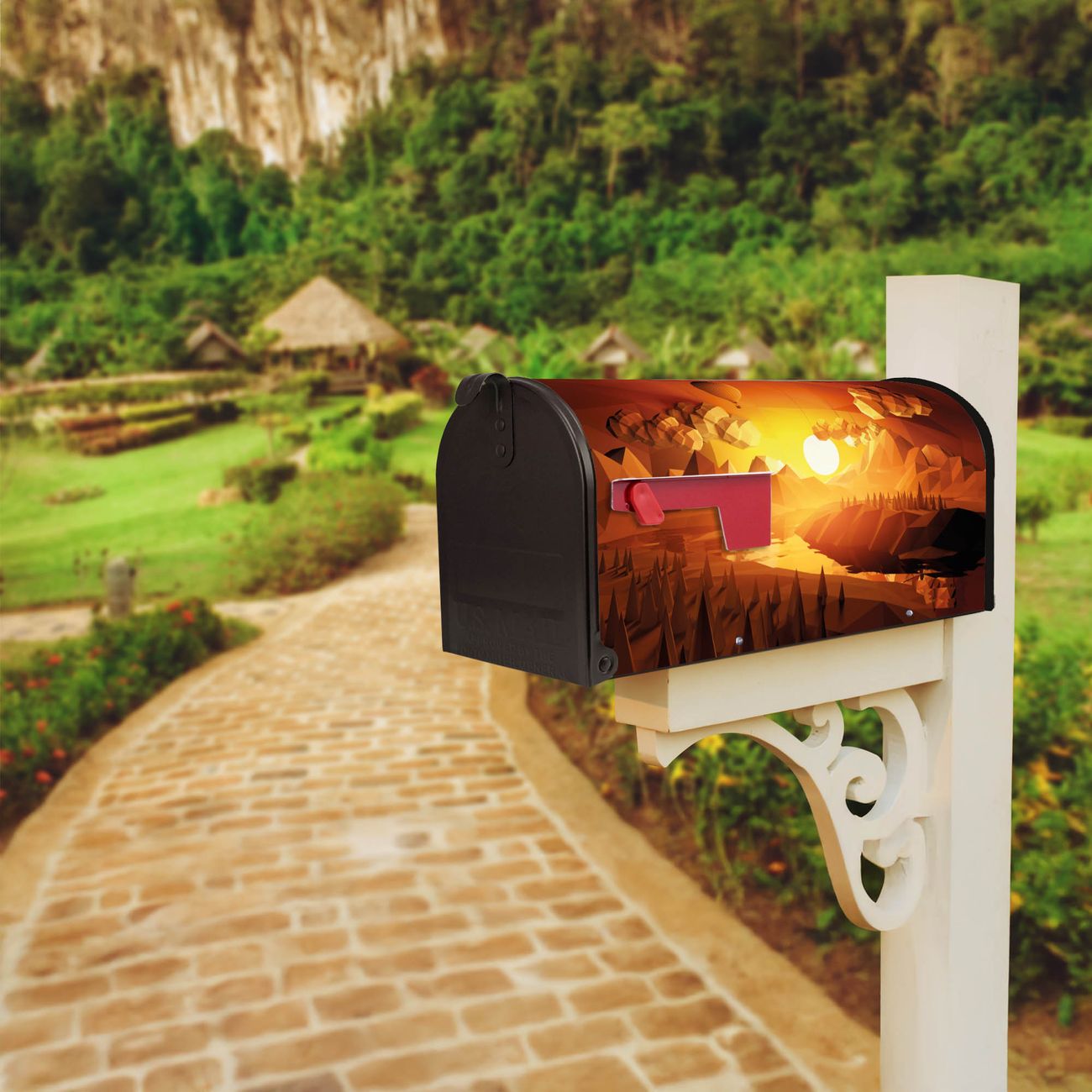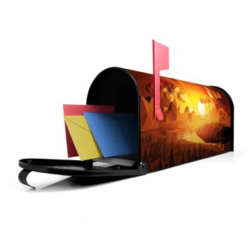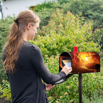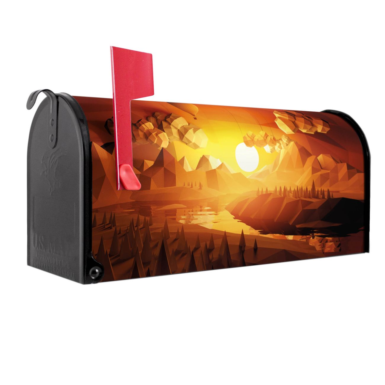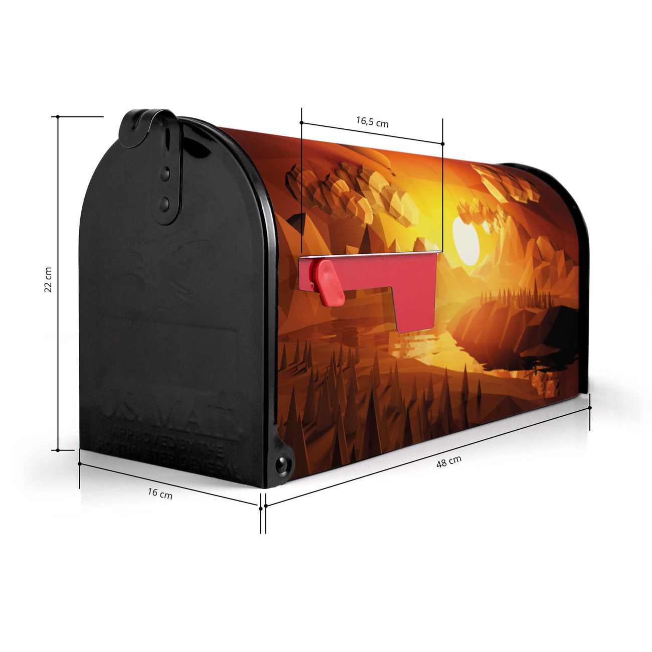 Der amerikanische Briefkasten von banjado mit Sunset Motiv bietet Ihnen ausreichend Fassungsvermögen, um große A4 Sendungen und Zeitschriften zu empfangen. Die typisch amerikanische rote Fahne zeigt Ihnen an, wenn Sie Post erhalten haben. Die US-Mailbox besteht aus verzinktem Stahlblech welches lackiert wurde und ist 48 x 22 x 16 CM (BxHxT) groß. Die Folie mit Motiv Sunset besteht aus einer wetter- und UV-resistenten Folie, die mit einem Schutzlaminat überzogen ist, sodass die US Mailbox zusätzlich vor Kratzern geschützt ist. An der Unterkante sind 4 Löcher je Seite um die Mailbox, typisch amerikanisch, an einem Holzpfahl oder einem Zaun zu befestigen. Auf Wunsch können Sie bei uns den passenden Standfuß oder die passende Wandhalterung kaufen um die US-Mailbox sicher zu befestigen. Wir bieten Ihnen ebenfalls Namensschilder, bereits beschriftet oder frei zu beschriften, und verschiedene selbst gestaltete Bitte-Keine-Werbung-Aufkleber.