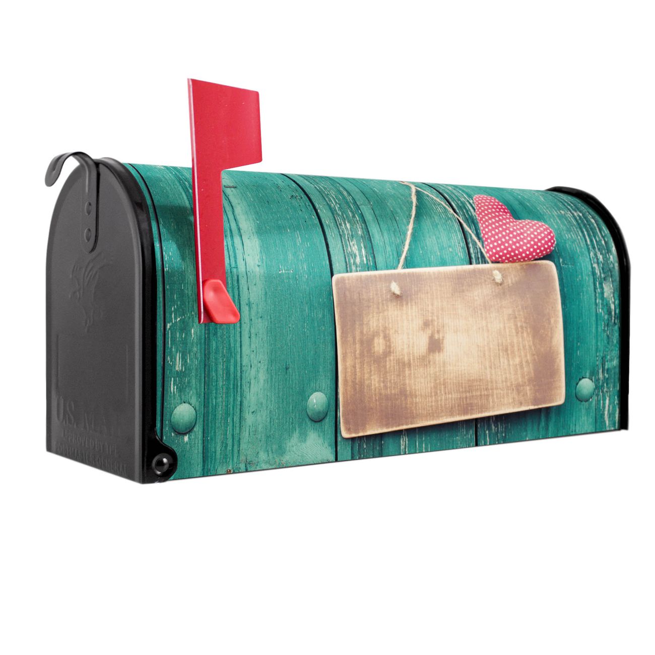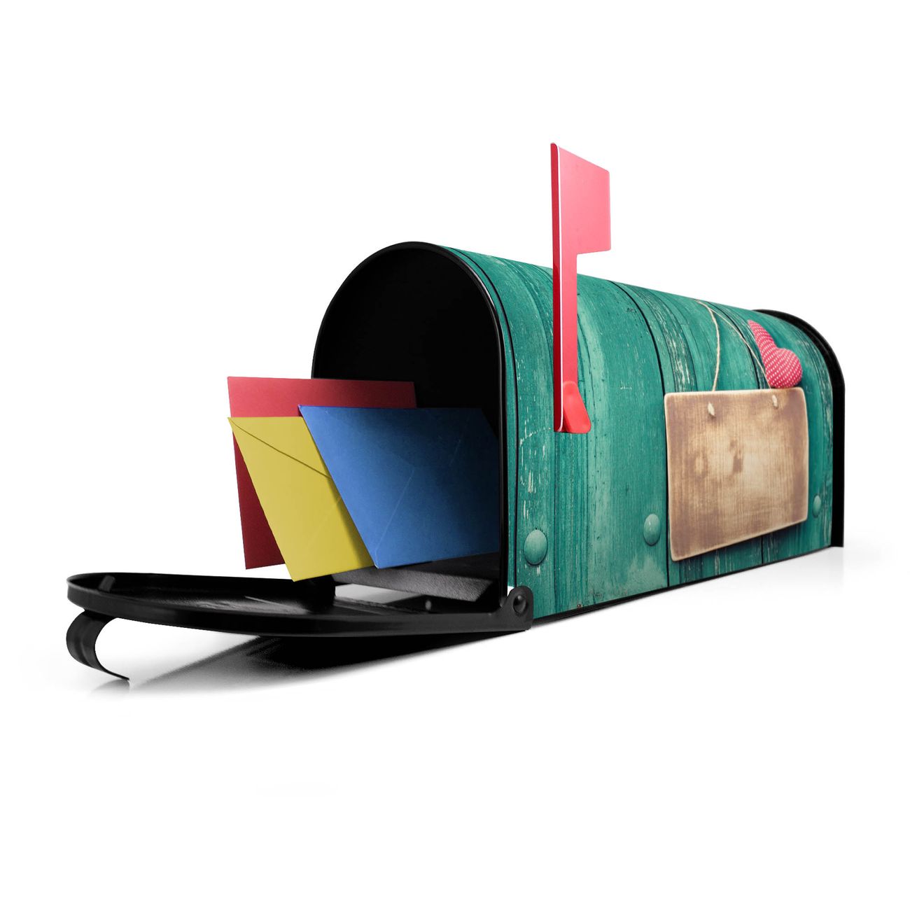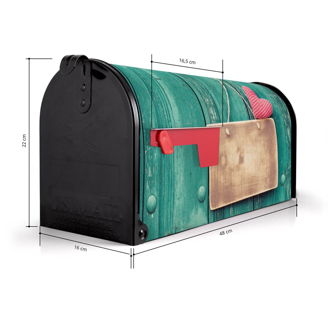 Der amerikanische Briefkasten von banjado mit Tür mit Herz Motiv bietet Ihnen ausreichend Fassungsvermögen, um große A4 Sendungen und Zeitschriften zu empfangen. Die typisch amerikanische rote Fahne zeigt Ihnen an, wenn Sie Post erhalten haben. Die US-Mailbox besteht aus verzinktem Stahlblech welches lackiert wurde und ist 48 x 22 x 16 CM (BxHxT) groß. Die Folie mit Motiv Tür mit Herz besteht aus einer wetter- und UV-resistenten Folie, die mit einem Schutzlaminat überzogen ist, sodass die US Mailbox zusätzlich vor Kratzern geschützt ist. An der Unterkante sind 4 Löcher je Seite um die Mailbox, typisch amerikanisch, an einem Holzpfahl oder einem Zaun zu befestigen. Auf Wunsch können Sie bei uns den passenden Standfuß oder die passende Wandhalterung kaufen um die US-Mailbox sicher zu befestigen. Wir bieten Ihnen ebenfalls Namensschilder, bereits beschriftet oder frei zu beschriften, und verschiedene selbst gestaltete Bitte-Keine-Werbung-Aufkleber.