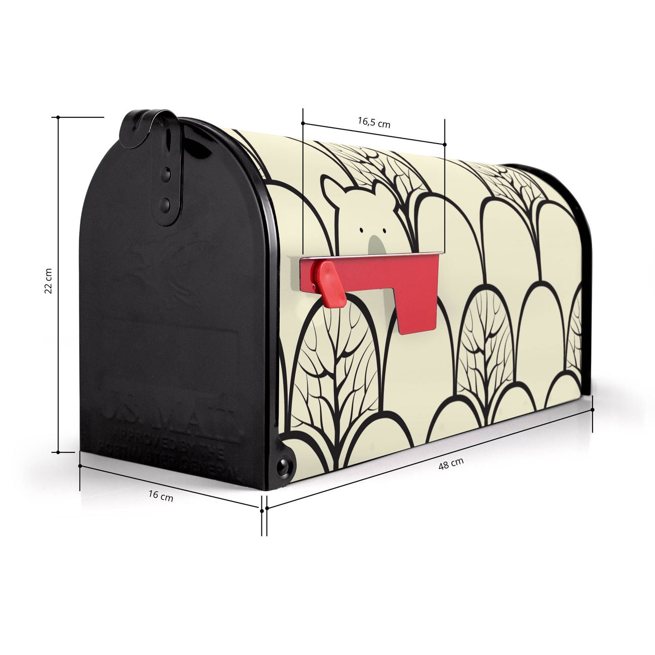 Der amerikanische Briefkasten von banjado mit Waldbeeren Motiv bietet Ihnen ausreichend Fassungsvermögen, um große A4 Sendungen und Zeitschriften zu empfangen. Die typisch amerikanische rote Fahne zeigt Ihnen an, wenn Sie Post erhalten haben. Die US-Mailbox besteht aus verzinktem Stahlblech welches lackiert wurde und ist 48 x 22 x 16 CM (BxHxT) groß. Die Folie mit Motiv Waldbeeren besteht aus einer wetter- und UV-resistenten Folie, die mit einem Schutzlaminat überzogen ist, sodass die US Mailbox zusätzlich vor Kratzern geschützt ist. An der Unterkante sind 4 Löcher je Seite um die Mailbox, typisch amerikanisch, an einem Holzpfahl oder einem Zaun zu befestigen. Auf Wunsch können Sie bei uns den passenden Standfuß oder die passende Wandhalterung kaufen um die US-Mailbox sicher zu befestigen. Wir bieten Ihnen ebenfalls Namensschilder, bereits beschriftet oder frei zu beschriften, und verschiedene selbst gestaltete Bitte-Keine-Werbung-Aufkleber.