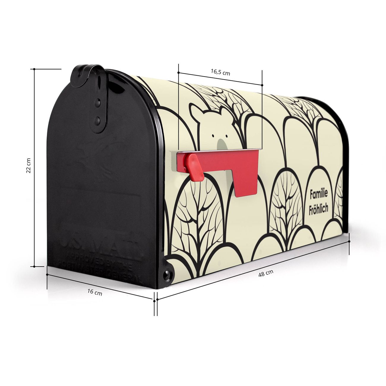 Der amerikanische Briefkasten von banjado mit Waldbeeren Motiv bietet Ihnen ausreichend Fassungsvermögen, um große A4 Sendungen und Zeitschriften zu empfangen. Die typisch amerikanische rote Fahne zeigt Ihnen an, wenn Sie Post erhalten haben. Die US-Mailbox besteht aus verzinktem Stahlblech welches lackiert wurde und ist 48 x 22 x 16 CM (BxHxT) groß. Die Folie mit Motiv Waldbeeren besteht aus einer wetter- und UV-resistenten Folie, die mit einem Schutzlaminat überzogen ist, sodass die US Mailbox zusätzlich vor Kratzern geschützt ist. An der Unterkante sind 4 Löcher je Seite um die Mailbox, typisch amerikanisch, an einem Holzpfahl oder einem Zaun zu befestigen. Auf Wunsch können Sie bei uns den passenden Standfuß oder die passende Wandhalterung kaufen um die US-Mailbox sicher zu befestigen. Wir bieten Ihnen ebenfalls Namensschilder, bereits beschriftet oder frei zu beschriften, und verschiedene selbst gestaltete Bitte-Keine-Werbung-Aufkleber.
