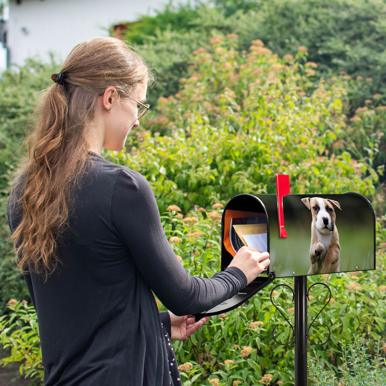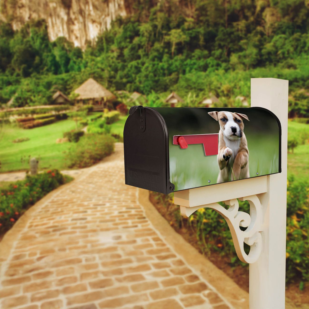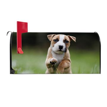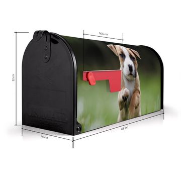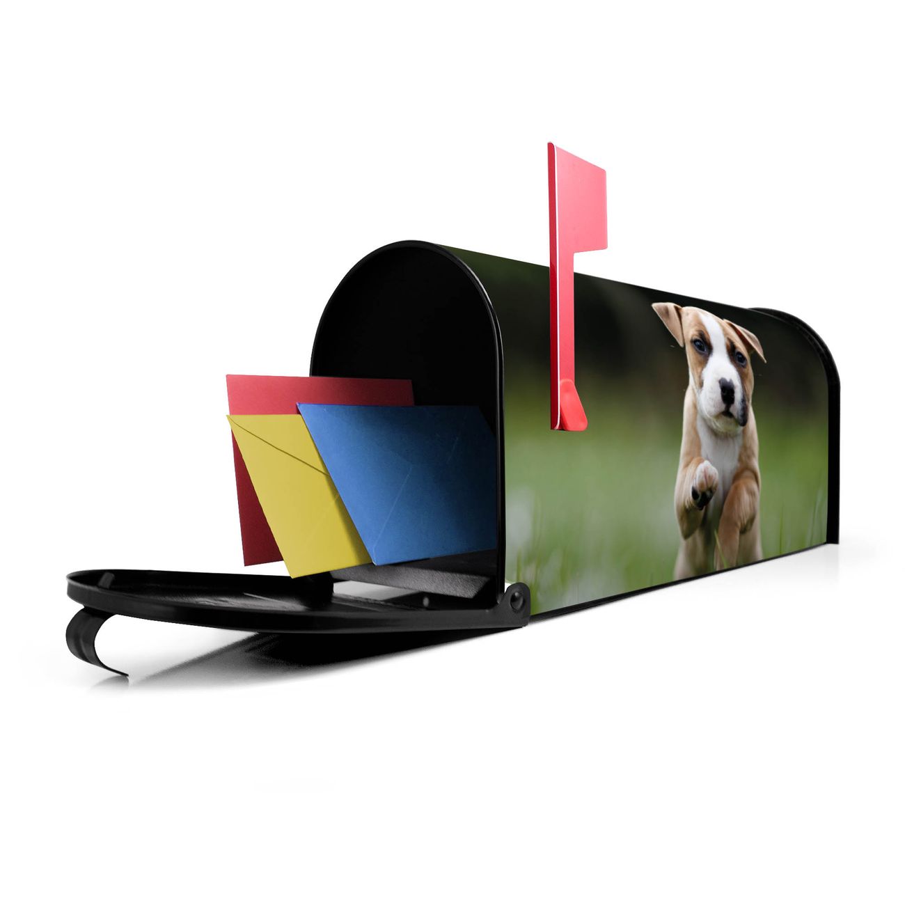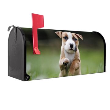 Der amerikanische Briefkasten von banjado mit Welpe im Gras Motiv bietet Ihnen ausreichend Fassungsvermögen, um große A4 Sendungen und Zeitschriften zu empfangen. Die typisch amerikanische rote Fahne zeigt Ihnen an, wenn Sie Post erhalten haben. Die US-Mailbox besteht aus verzinktem Stahlblech welches lackiert wurde und ist 48 x 22 x 16 CM (BxHxT) groß. Die Folie mit Motiv Welpe im Gras besteht aus einer wetter- und UV-resistenten Folie, die mit einem Schutzlaminat überzogen ist, sodass die US Mailbox zusätzlich vor Kratzern geschützt ist. An der Unterkante sind 4 Löcher je Seite um die Mailbox, typisch amerikanisch, an einem Holzpfahl oder einem Zaun zu befestigen. Auf Wunsch können Sie bei uns den passenden Standfuß oder die passende Wandhalterung kaufen um die US-Mailbox sicher zu befestigen. Wir bieten Ihnen ebenfalls Namensschilder, bereits beschriftet oder frei zu beschriften, und verschiedene selbst gestaltete Bitte-Keine-Werbung-Aufkleber.
