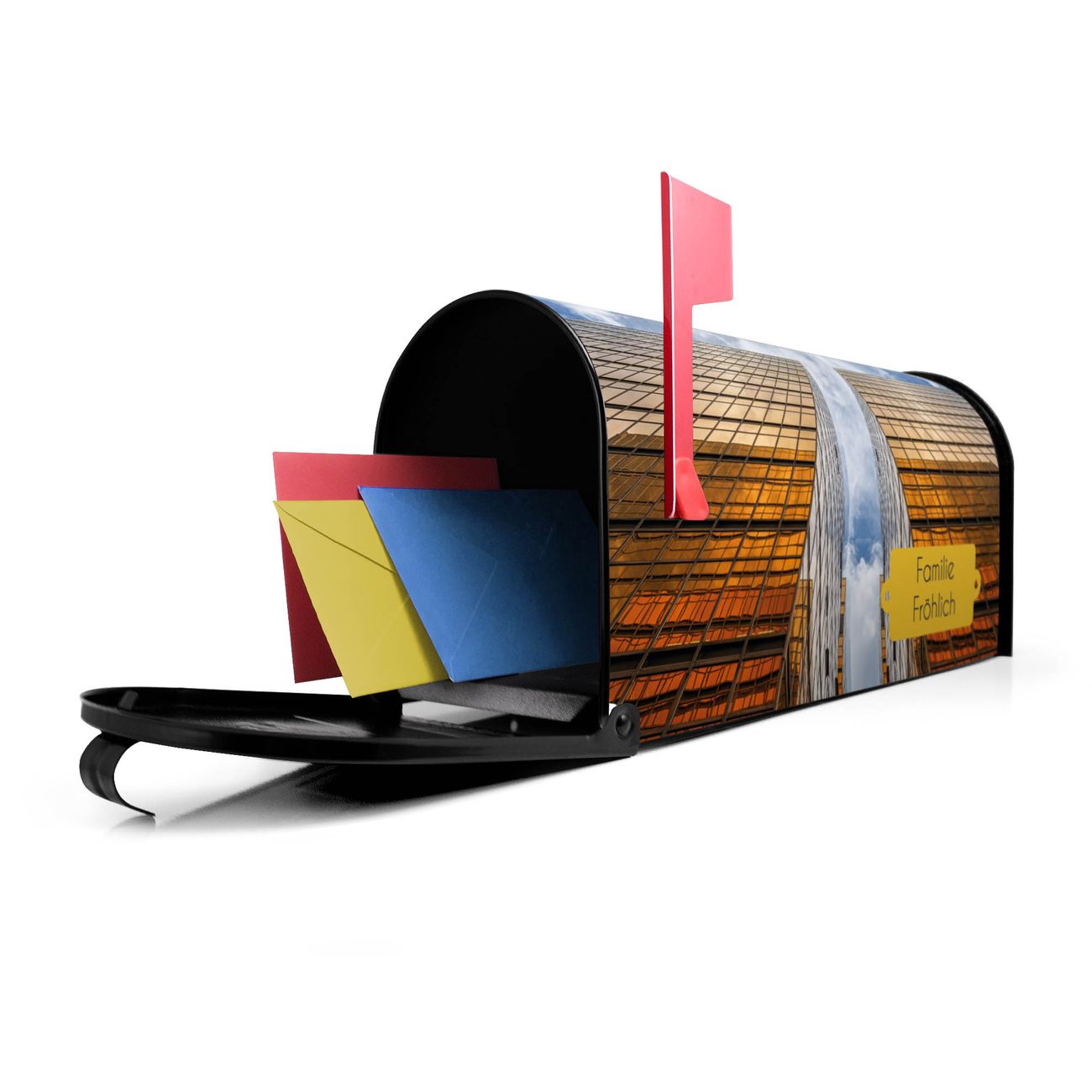 Der amerikanische Briefkasten von banjado mit Wolkenkratzer 2 Motiv bietet Ihnen ausreichend Fassungsvermögen, um große A4 Sendungen und Zeitschriften zu empfangen. Die typisch amerikanische rote Fahne zeigt Ihnen an, wenn Sie Post erhalten haben. Die US-Mailbox besteht aus verzinktem Stahlblech welches lackiert wurde und ist 48 x 22 x 16 CM (BxHxT) groß. Die Folie mit Motiv Wolkenkratzer 2 besteht aus einer wetter- und UV-resistenten Folie, die mit einem Schutzlaminat überzogen ist, sodass die US Mailbox zusätzlich vor Kratzern geschützt ist. An der Unterkante sind 4 Löcher je Seite um die Mailbox, typisch amerikanisch, an einem Holzpfahl oder einem Zaun zu befestigen. Auf Wunsch können Sie bei uns den passenden Standfuß oder die passende Wandhalterung kaufen um die US-Mailbox sicher zu befestigen. Wir bieten Ihnen ebenfalls Namensschilder, bereits beschriftet oder frei zu beschriften, und verschiedene selbst gestaltete Bitte-Keine-Werbung-Aufkleber.