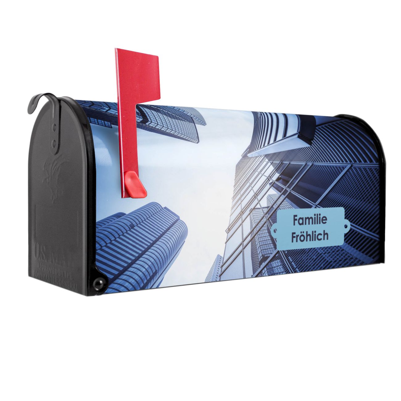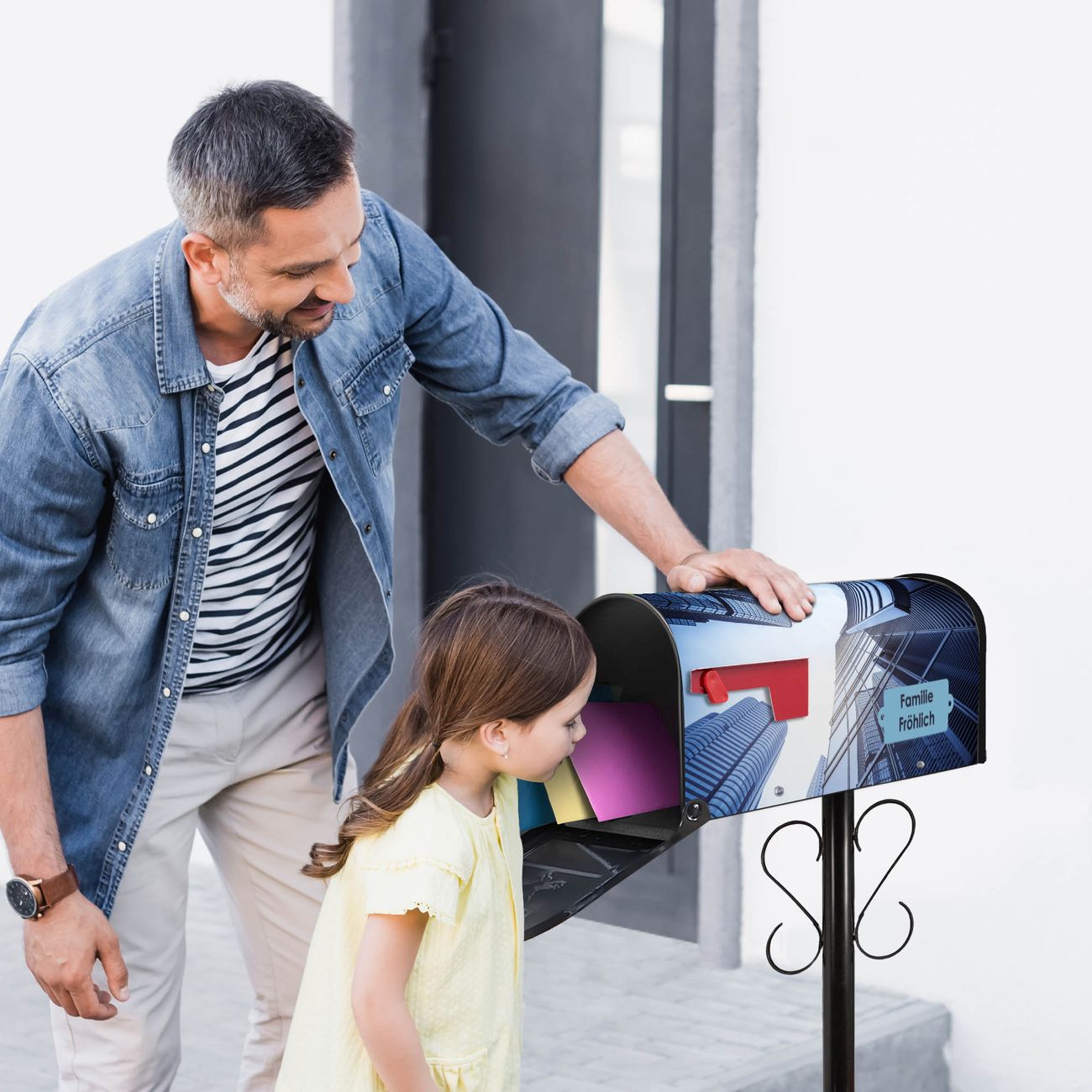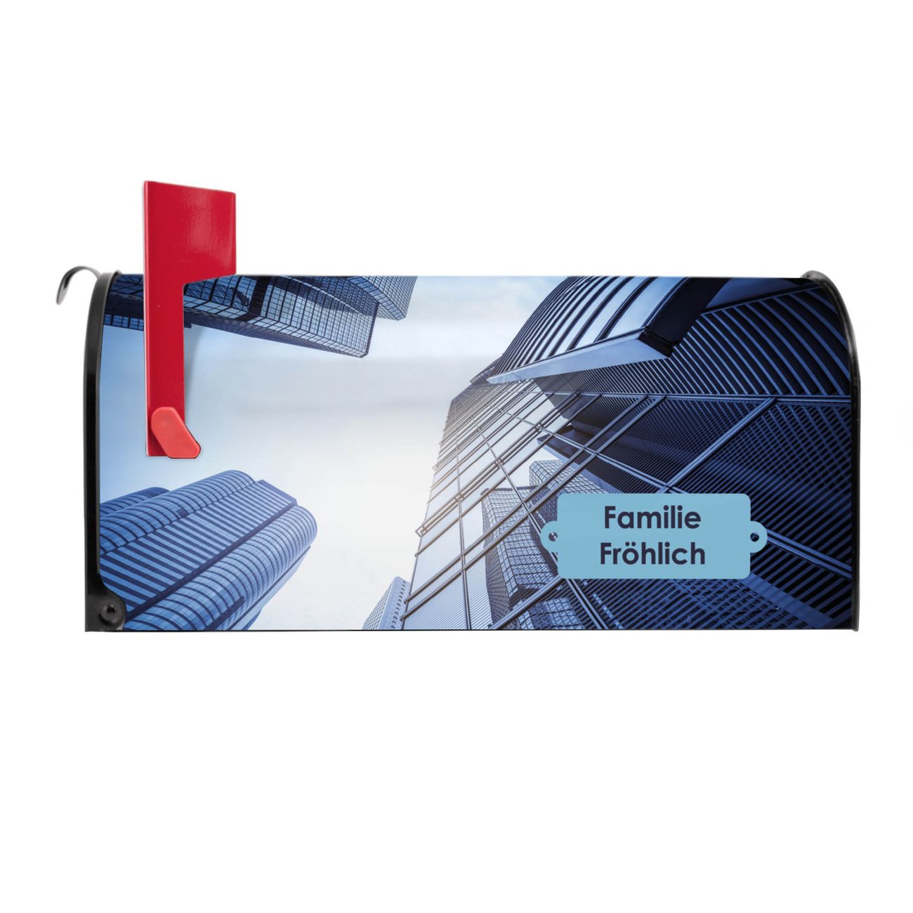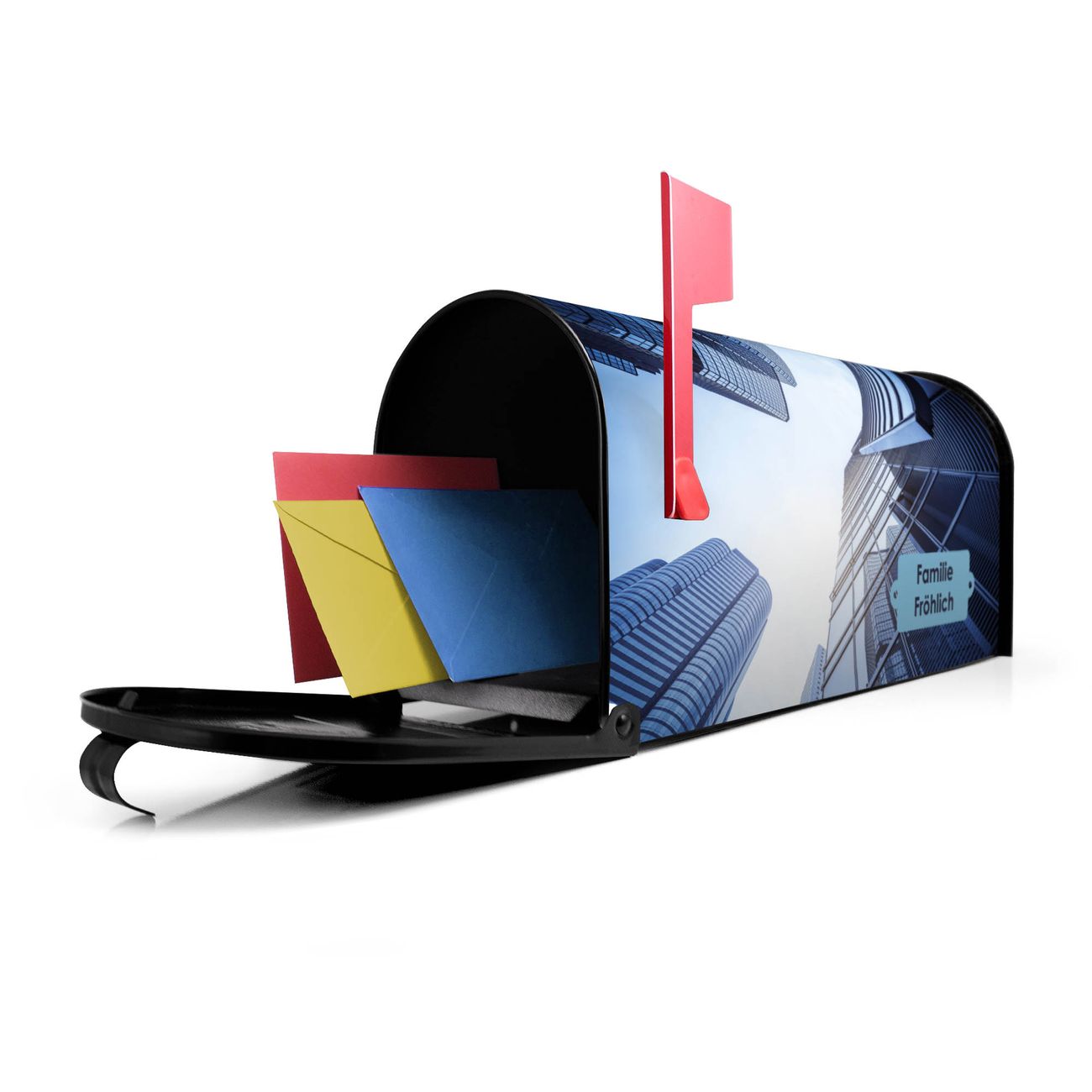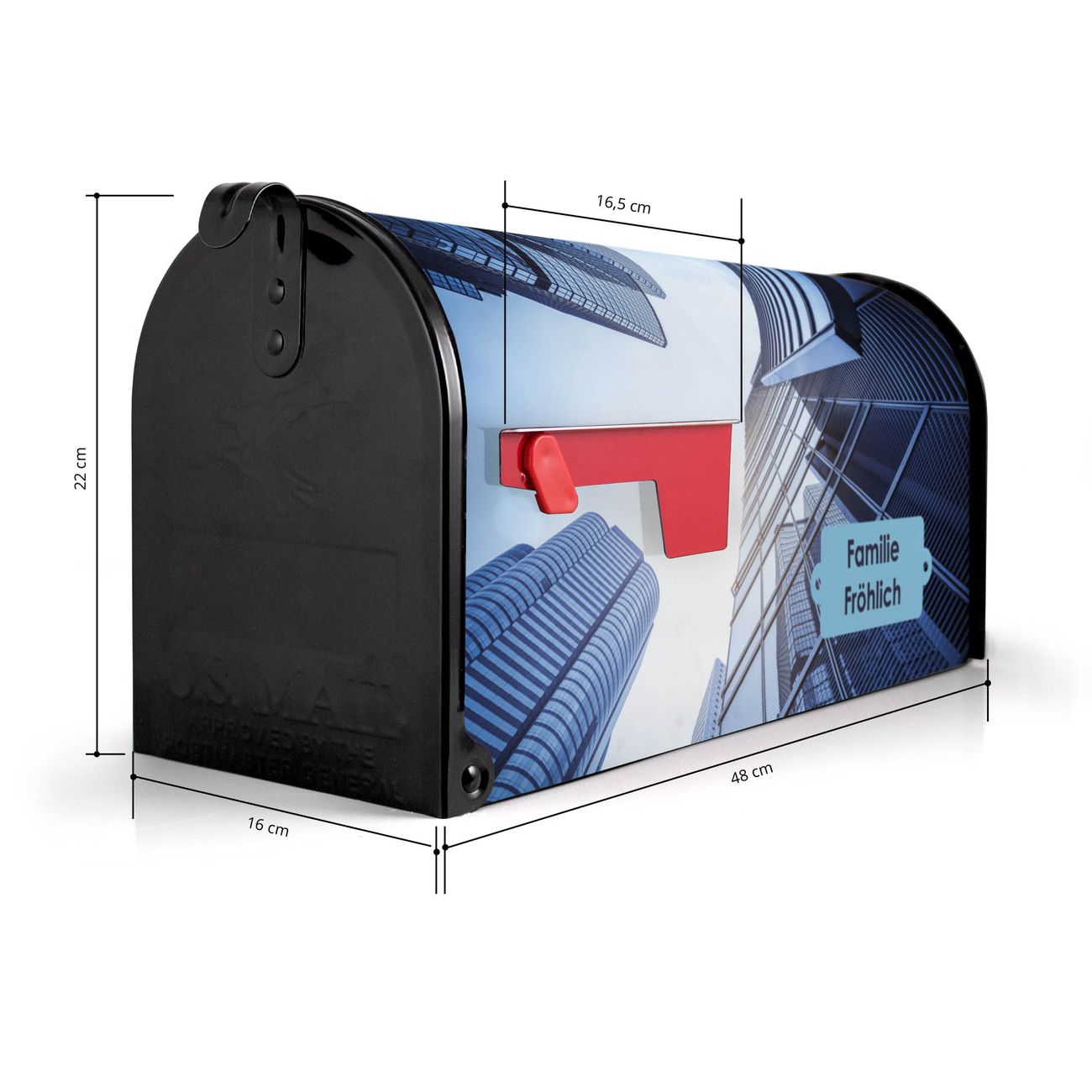 Der amerikanische Briefkasten von banjado mit Wolkenkratzer Motiv bietet Ihnen ausreichend Fassungsvermögen, um große A4 Sendungen und Zeitschriften zu empfangen. Die typisch amerikanische rote Fahne zeigt Ihnen an, wenn Sie Post erhalten haben. Die US-Mailbox besteht aus verzinktem Stahlblech welches lackiert wurde und ist 48 x 22 x 16 CM (BxHxT) groß. Die Folie mit Motiv Wolkenkratzer besteht aus einer wetter- und UV-resistenten Folie, die mit einem Schutzlaminat überzogen ist, sodass die US Mailbox zusätzlich vor Kratzern geschützt ist. An der Unterkante sind 4 Löcher je Seite um die Mailbox, typisch amerikanisch, an einem Holzpfahl oder einem Zaun zu befestigen. Auf Wunsch können Sie bei uns den passenden Standfuß oder die passende Wandhalterung kaufen um die US-Mailbox sicher zu befestigen. Wir bieten Ihnen ebenfalls Namensschilder, bereits beschriftet oder frei zu beschriften, und verschiedene selbst gestaltete Bitte-Keine-Werbung-Aufkleber.