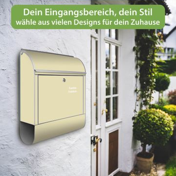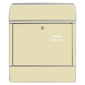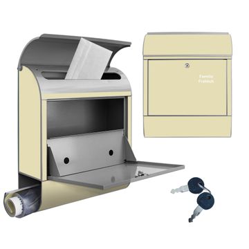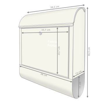 Farbe Beige Nr. 0022 Material: silber-grau pulverbeschichtetes Stahlblech Dekorfolie: UV-beständig, wetterfest Gesamtgröße: 38x46x12,5cm BxHxT Briefschlitz: 33x3,5cm BxH Gewicht: ca. 3,4 kg Zubehör: Montagezubehör, 2 Schlüssel, Bohrschablone