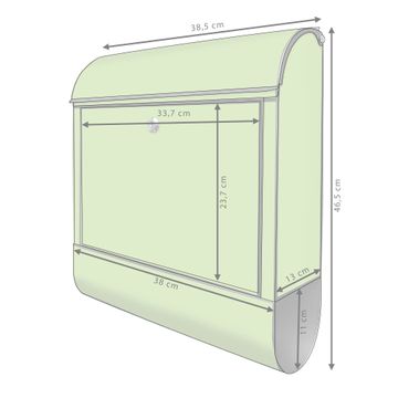 DESIGN: Der Postkasten mit Motiv Farbe Limettengrün hat ein sehr ansprechendes und ausgefallenes Design, damit entlocken Sie Ihren Nachbarn und dem Postboten ein Lächeln. Heben Sie Sich von der tristen grauen Masse ab, ohne auf Funktionalität zu verzichten. DETAILS: Der Postkasten besteht aus pulverbeschichtetem Stahl. Er ist 38x46x12,5cm groß. Das Motiv besteht aus einer wetter- und UV-resistenten Folie, die mit einem Schutzlaminat überzogen ist, sodass der Briefkasten zusätzlich vor Kratzern geschützt ist. Der Briefkasten wird mit Montagematerial, zusätzlich zwei Schlüssel sowie einer Bohrschablone geliefert. NUTZEN: Sie können diesen Briefkasten sowohl als Wandbriefkasten montieren oder einen passenden Ständer kaufen und als Standbriefkasten einbetonieren. Die Größe bietet genügend Platz für Sendungen aller Art, der Einwurf fasst auch größere A4 Sendungen. BANJADO: Ihr Briefkasten wird in Sachsen in einer kleinen Manufaktur von Hand veredelt. Die Motivfolie ist lösungsmittelfrei und schutzlaminiert für einen langen Halt. Wir legen großen Wert auf die Verbindung von Funktionalität und Design. Sie erhalten Handarbeit aus Sachsen.