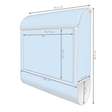 DESIGN: Der Postkasten mit Motiv Farbe Pastellblau hat ein sehr ansprechendes und ausgefallenes Design, damit entlocken Sie Ihren Nachbarn und dem Postboten ein Lächeln. Heben Sie Sich von der tristen grauen Masse ab, ohne auf Funktionalität zu verzichten. DETAILS: Der Postkasten besteht aus pulverbeschichtetem Stahl. Er ist 38x46x12,5cm groß. Das Motiv besteht aus einer wetter- und UV-resistenten Folie, die mit einem Schutzlaminat überzogen ist, sodass der Briefkasten zusätzlich vor Kratzern geschützt ist. Der Briefkasten wird mit Montagematerial, zusätzlich zwei Schlüssel sowie einer Bohrschablone geliefert. NUTZEN: Sie können diesen Briefkasten sowohl als Wandbriefkasten montieren oder einen passenden Ständer kaufen und als Standbriefkasten einbetonieren. Die Größe bietet genügend Platz für Sendungen aller Art, der Einwurf fasst auch größere A4 Sendungen. BANJADO: Ihr Briefkasten wird in Sachsen in einer kleinen Manufaktur von Hand veredelt. Die Motivfolie ist lösungsmittelfrei und schutzlaminiert für einen langen Halt. Wir legen großen Wert auf die Verbindung von Funktionalität und Design. Sie erhalten Handarbeit aus Sachsen.