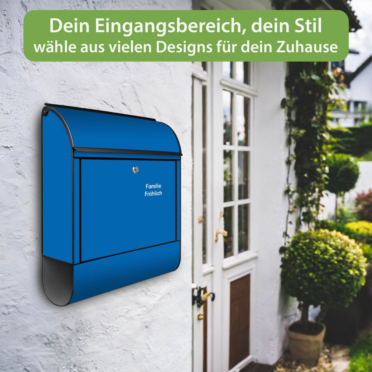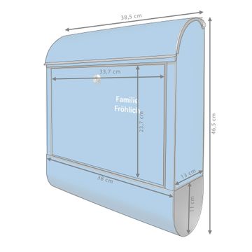 DESIGN: Der Postkasten mit Motiv Farbe Signalblau hat ein sehr ansprechendes und ausgefallenes Design, damit entlocken Sie Ihren Nachbarn und dem Postboten ein Lächeln. Heben Sie Sich von der tristen grauen Masse ab, ohne auf Funktionalität zu verzichten. DETAILS: Der Postkasten besteht aus pulverbeschichtetem Stahl. Er ist 38x46x12,5cm groß. Das Motiv besteht aus einer wetter- und UV-resistenten Folie, die mit einem Schutzlaminat überzogen ist, sodass der Briefkasten zusätzlich vor Kratzern geschützt ist. Der Briefkasten wird mit Montagematerial, zusätzlich zwei Schlüssel sowie einer Bohrschablone geliefert. NUTZEN: Sie können diesen Briefkasten sowohl als Wandbriefkasten montieren oder einen passenden Ständer kaufen und als Standbriefkasten einbetonieren. Die Größe bietet genügend Platz für Sendungen aller Art, der Einwurf fasst auch größere A4 Sendungen. BANJADO: Ihr Briefkasten wird in Sachsen in einer kleinen Manufaktur von Hand veredelt. Die Motivfolie ist lösungsmittelfrei und schutzlaminiert für einen langen Halt. Wir legen großen Wert auf die Verbindung von Funktionalität und Design. Sie erhalten Handarbeit aus Sachsen.