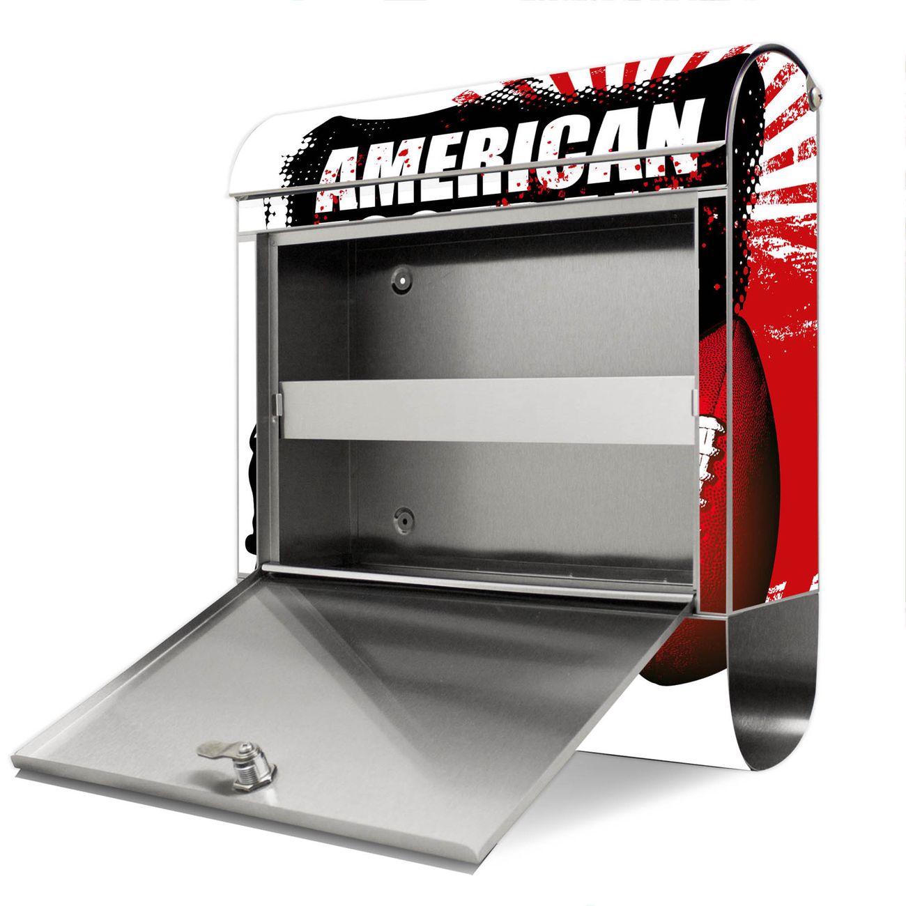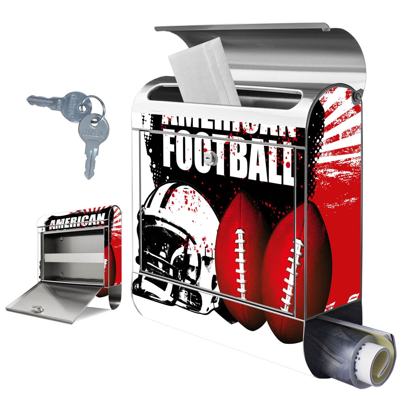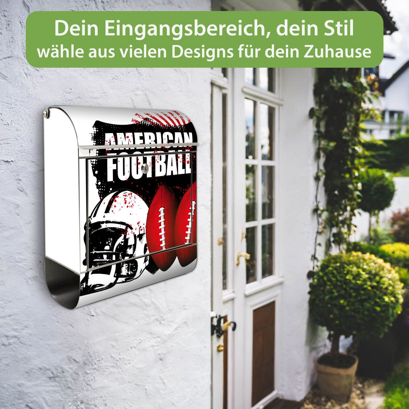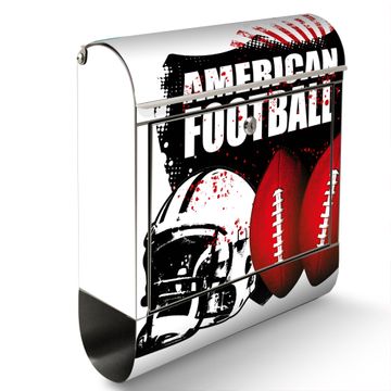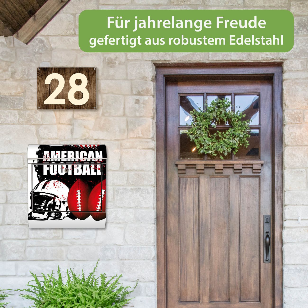 FUNKTION: Der banjado Edelstahl Briefkasten mit Motiv Motiv American Football bietet Ihnen mit seinem Fassungsvermögen genügend Platz auch für große A4 Sendungen. Das integrierte Zeitungsfach eignet sich hervorragend um unkompliziert die Tageszeitung zu fassen. Auf Wunsch können Sie bei uns den passenden Ständer kaufen und so aus dem Wandbriefkasten einen Standbriefkasten machen. DESIGN: Der Motivbriefkasten hat ein sehr ansprechendes und ausgefallenes Design, damit entlocken Sie Ihren Nachbarn und dem Postboten ein Lächeln. Heben Sie Sich ab von der tristen grauen Masse ohne auf Funktionalität zu verzichten. DETAILS: Der Design Briefkasten mit Motiv Motiv American Football besteht aus hochwertigem 18/0 Edelstahl. Das Motiv besteht aus einer wetter- und UV-resistenten Folie, die mit einem Schutzlaminat überzogen ist. Der Briefkasten wird mit Montagematerial und zwei Schlüsseln geliefert. NUTZEN: Sie können diesen Briefkasten sowohl als Wandbriefkasten montieren oder einen passenden Ständer auswählen und als Standbriefkasten einbetonieren. Die Größe bietet genügend Platz für Sendungen aller Art, das hochwertige Edelstahl ist rostfrei und die Motivfolie absolut wetterfest. SCHUTZ: Um Ihre Post optimal vor Witterungseinflüssen wie Starkregen zu schützen, empfehlen wir, den Briefkasten geschützt anzubringen. BANJADO: Ihr Briefkasten wird in Sachsen in einer kleinen Manufaktur von Hand veredelt. Die Motivfolie ist lösungsmittelfrei und schutzlaminiert, dies sorgt für einen langen Halt. Wir legen großen Wert auf die Verbindung von Funktionalität und Design. Sie erhalten Handarbeit aus Sachsen.