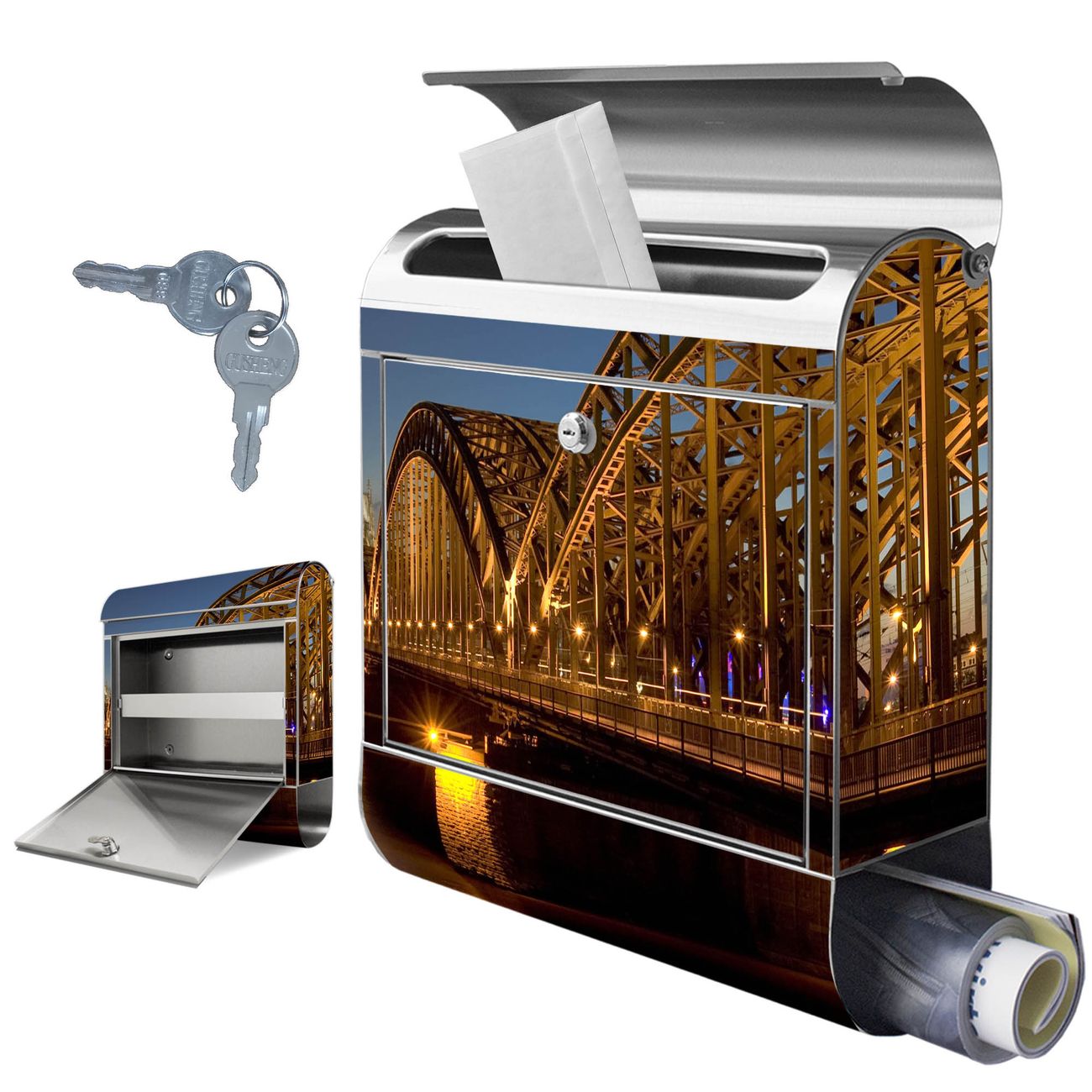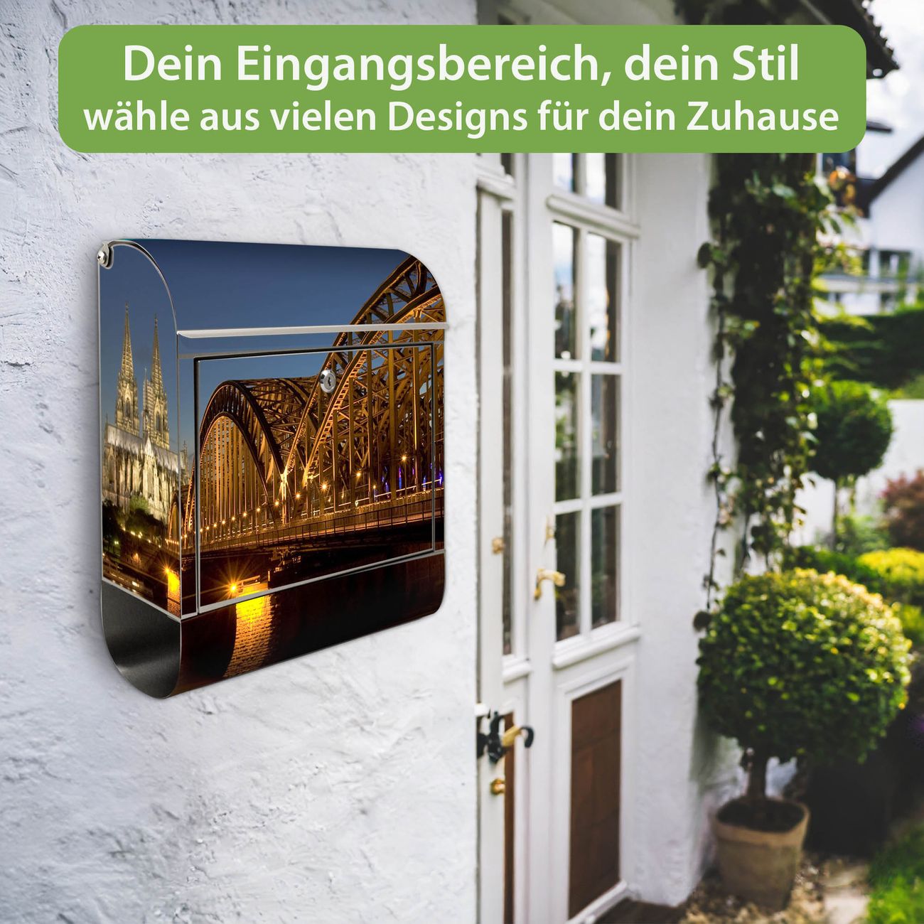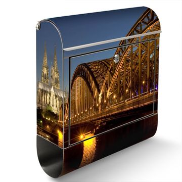 FUNKTION: Der banjado Edelstahl Briefkasten mit Motiv Motiv Köln bietet Ihnen mit seinem Fassungsvermögen genügend Platz auch für große A4 Sendungen. Das integrierte Zeitungsfach eignet sich hervorragend um unkompliziert die Tageszeitung zu fassen. Auf Wunsch können Sie bei uns den passenden Ständer kaufen und so aus dem Wandbriefkasten einen Standbriefkasten machen. DESIGN: Der Motivbriefkasten hat ein sehr ansprechendes und ausgefallenes Design, damit entlocken Sie Ihren Nachbarn und dem Postboten ein Lächeln. Heben Sie Sich ab von der tristen grauen Masse ohne auf Funktionalität zu verzichten. DETAILS: Der Design Briefkasten mit Motiv Motiv Köln besteht aus hochwertigem 18/0 Edelstahl. Das Motiv besteht aus einer wetter- und UV-resistenten Folie, die mit einem Schutzlaminat überzogen ist. Der Briefkasten wird mit Montagematerial und zwei Schlüsseln geliefert. NUTZEN: Sie können diesen Briefkasten sowohl als Wandbriefkasten montieren oder einen passenden Ständer auswählen und als Standbriefkasten einbetonieren. Die Größe bietet genügend Platz für Sendungen aller Art, das hochwertige Edelstahl ist rostfrei und die Motivfolie absolut wetterfest. SCHUTZ: Um Ihre Post optimal vor Witterungseinflüssen wie Starkregen zu schützen, empfehlen wir, den Briefkasten geschützt anzubringen. BANJADO: Ihr Briefkasten wird in Sachsen in einer kleinen Manufaktur von Hand veredelt. Die Motivfolie ist lösungsmittelfrei und schutzlaminiert, dies sorgt für einen langen Halt. Wir legen großen Wert auf die Verbindung von Funktionalität und Design. Sie erhalten Handarbeit aus Sachsen.