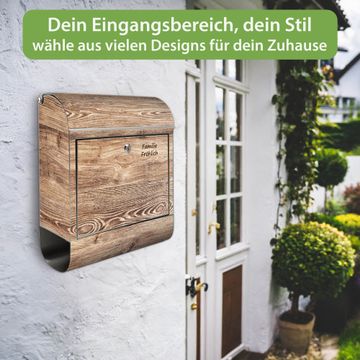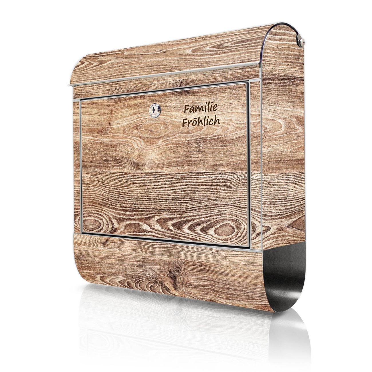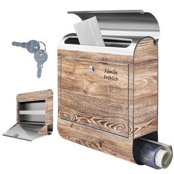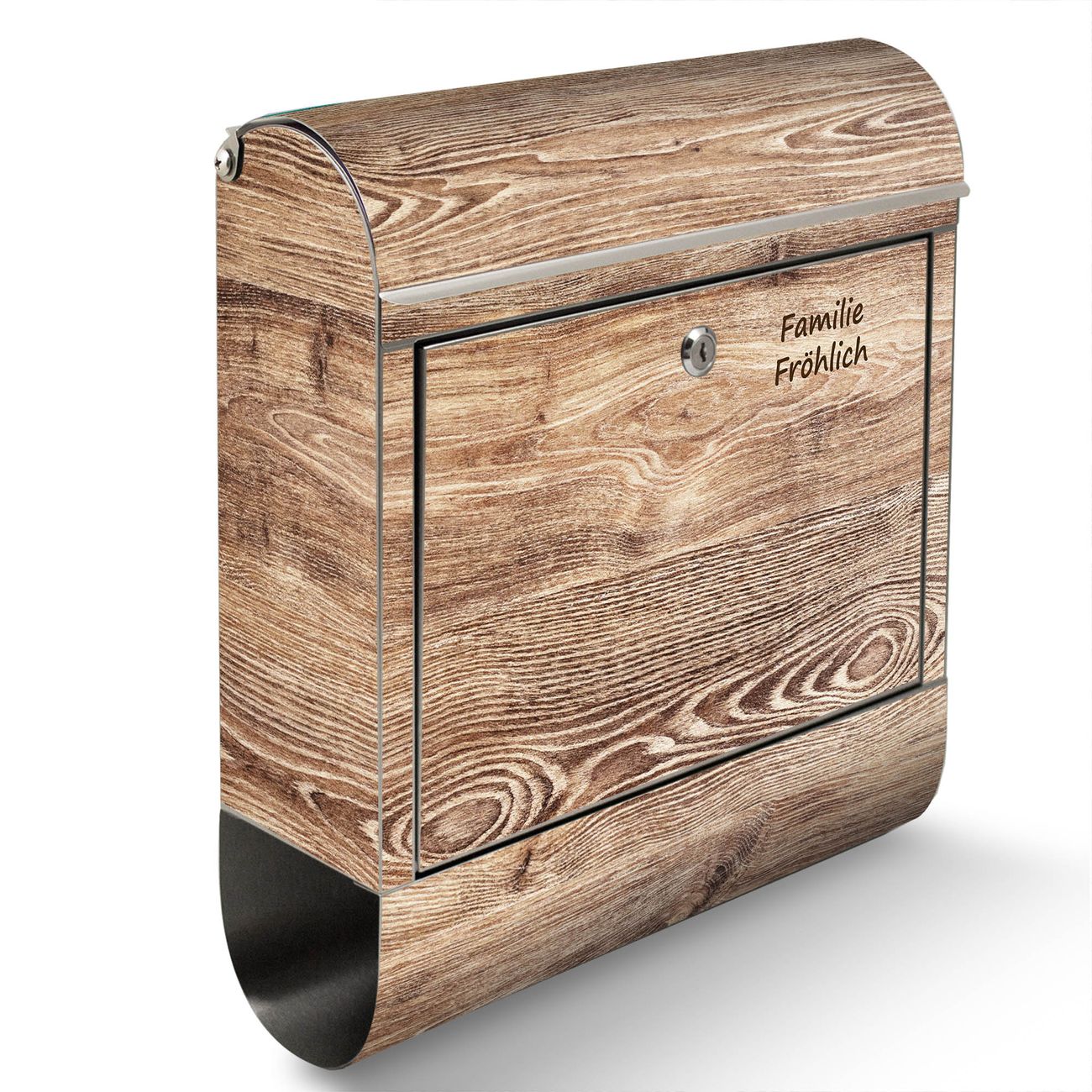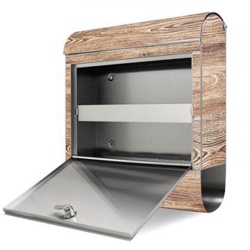 FUNKTION: Der banjado Edelstahl Briefkasten mit Motiv Motiv Maserung bietet Ihnen mit seinem Fassungsvermögen genügend Platz auch für große A4 Sendungen. Das integrierte Zeitungsfach eignet sich hervorragend um unkompliziert die Tageszeitung zu fassen. Auf Wunsch können Sie bei uns den passenden Ständer kaufen und so aus dem Wandbriefkasten einen Standbriefkasten machen. DESIGN: Der Motivbriefkasten hat ein sehr ansprechendes und ausgefallenes Design, damit entlocken Sie Ihren Nachbarn und dem Postboten ein Lächeln. Heben Sie Sich ab von der tristen grauen Masse ohne auf Funktionalität zu verzichten. DETAILS: Der Design Briefkasten mit Motiv Motiv Maserung besteht aus hochwertigem 18/0 Edelstahl. Das Motiv besteht aus einer wetter- und UV-resistenten Folie, die mit einem Schutzlaminat überzogen ist. Der Briefkasten wird mit Montagematerial und zwei Schlüsseln geliefert. NUTZEN: Sie können diesen Briefkasten sowohl als Wandbriefkasten montieren oder einen passenden Ständer auswählen und als Standbriefkasten einbetonieren. Die Größe bietet genügend Platz für Sendungen aller Art, das hochwertige Edelstahl ist rostfrei und die Motivfolie absolut wetterfest. SCHUTZ: Um Ihre Post optimal vor Witterungseinflüssen wie Starkregen zu schützen, empfehlen wir, den Briefkasten geschützt anzubringen. BANJADO: Ihr Briefkasten wird in Sachsen in einer kleinen Manufaktur von Hand veredelt. Die Motivfolie ist lösungsmittelfrei und schutzlaminiert, dies sorgt für einen langen Halt. Wir legen großen Wert auf die Verbindung von Funktionalität und Design. Sie erhalten Handarbeit aus Sachsen.