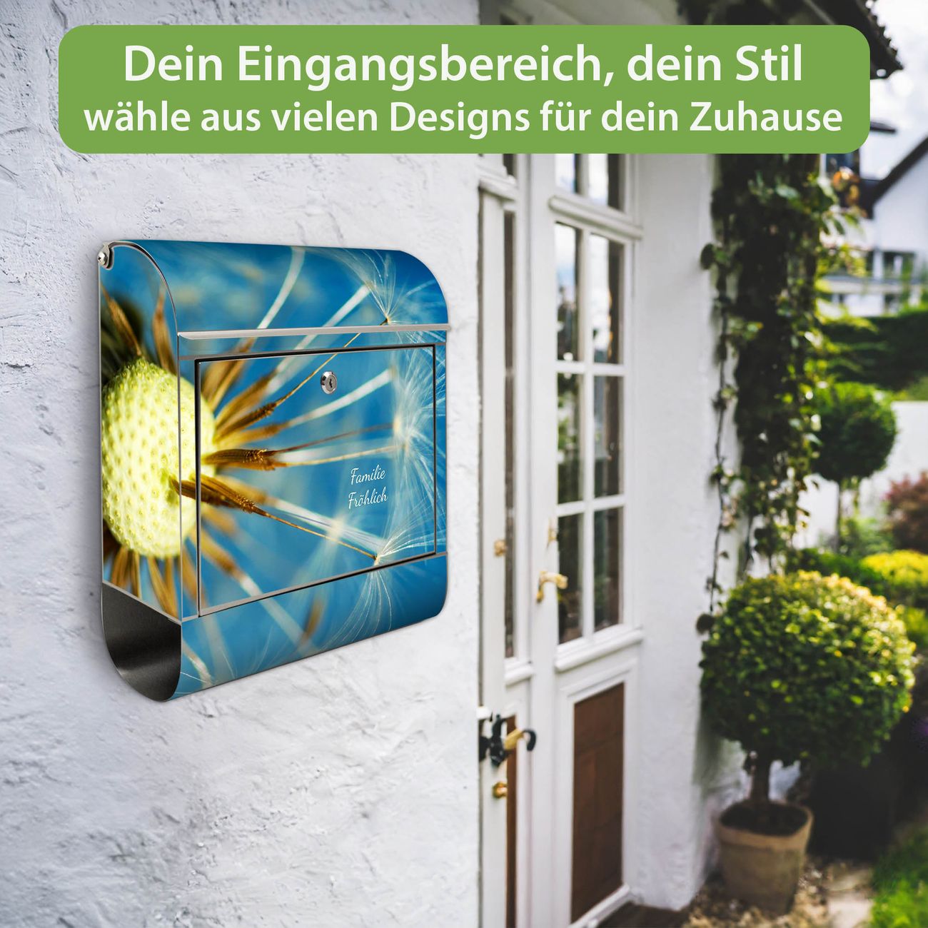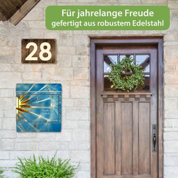 FUNKTION: Der banjado Edelstahl Briefkasten mit Motiv Motiv Pusteblume Detail bietet Ihnen mit seinem Fassungsvermögen genügend Platz auch für große A4 Sendungen. Das integrierte Zeitungsfach eignet sich hervorragend um unkompliziert die Tageszeitung zu fassen. Auf Wunsch können Sie bei uns den passenden Ständer kaufen und so aus dem Wandbriefkasten einen Standbriefkasten machen. DESIGN: Der Motivbriefkasten hat ein sehr ansprechendes und ausgefallenes Design, damit entlocken Sie Ihren Nachbarn und dem Postboten ein Lächeln. Heben Sie Sich ab von der tristen grauen Masse ohne auf Funktionalität zu verzichten. DETAILS: Der Design Briefkasten mit Motiv Motiv Pusteblume Detail besteht aus hochwertigem 18/0 Edelstahl. Das Motiv besteht aus einer wetter- und UV-resistenten Folie, die mit einem Schutzlaminat überzogen ist. Der Briefkasten wird mit Montagematerial und zwei Schlüsseln geliefert. NUTZEN: Sie können diesen Briefkasten sowohl als Wandbriefkasten montieren oder einen passenden Ständer auswählen und als Standbriefkasten einbetonieren. Die Größe bietet genügend Platz für Sendungen aller Art, das hochwertige Edelstahl ist rostfrei und die Motivfolie absolut wetterfest. SCHUTZ: Um Ihre Post optimal vor Witterungseinflüssen wie Starkregen zu schützen, empfehlen wir, den Briefkasten geschützt anzubringen. BANJADO: Ihr Briefkasten wird in Sachsen in einer kleinen Manufaktur von Hand veredelt. Die Motivfolie ist lösungsmittelfrei und schutzlaminiert, dies sorgt für einen langen Halt. Wir legen großen Wert auf die Verbindung von Funktionalität und Design. Sie erhalten Handarbeit aus Sachsen.
