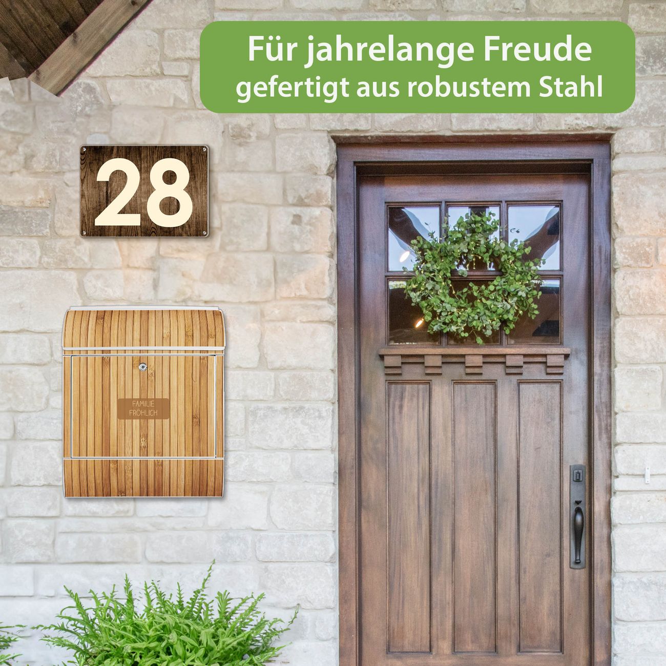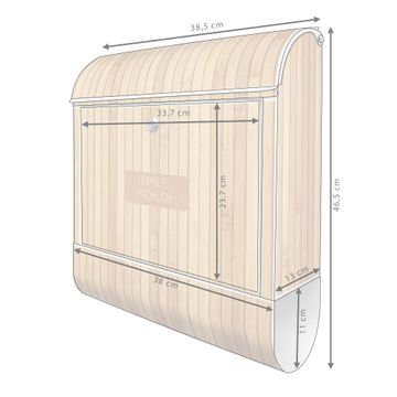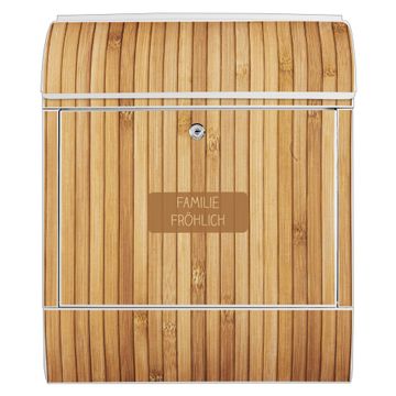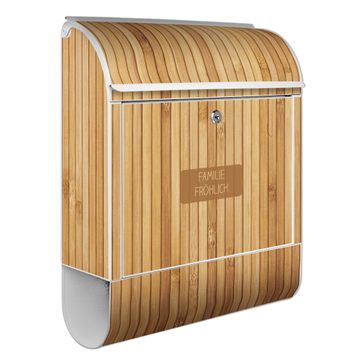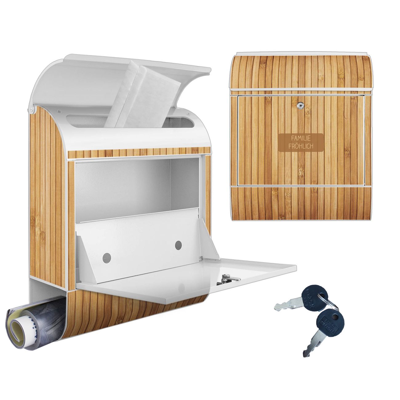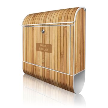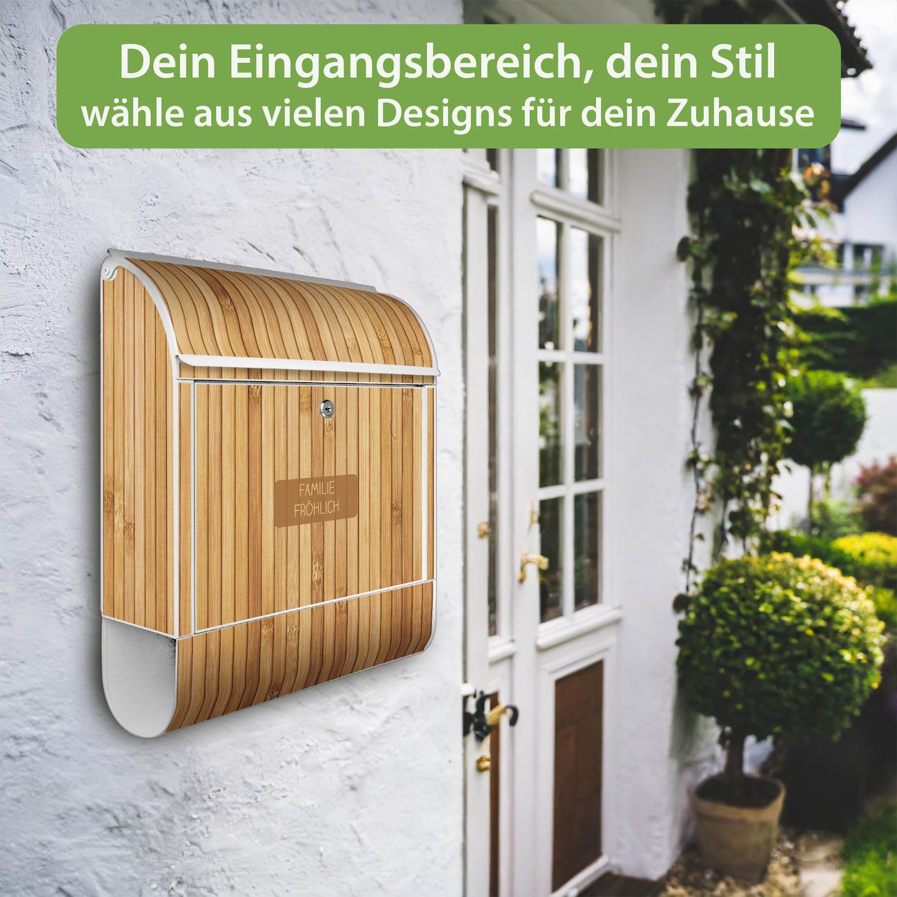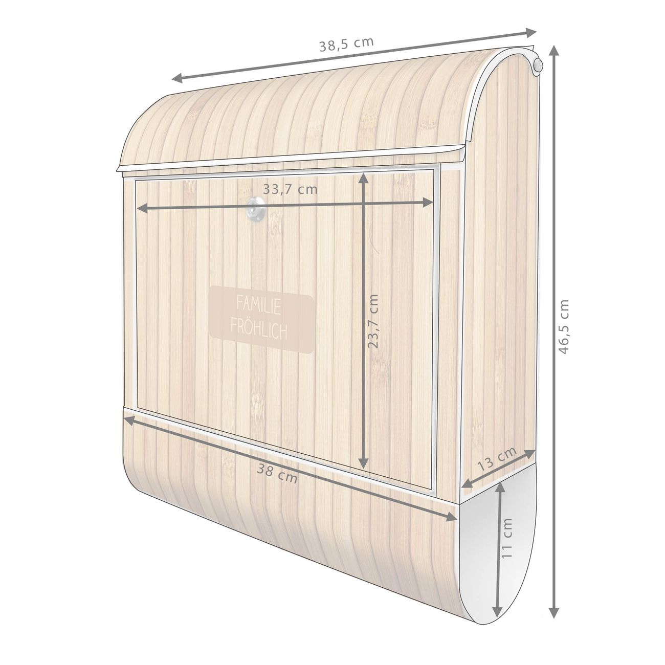 DESIGN: Der Postkasten mit Motiv Motiv Bambusholz hat ein sehr ansprechendes und ausgefallenes Design, damit entlocken Sie Ihren Nachbarn und dem Postboten ein Lächeln. Heben Sie Sich von der tristen grauen Masse ab, ohne auf Funktionalität zu verzichten. DETAILS: Der Postkasten besteht aus pulverbeschichtetem Stahl. Er ist 38x46x12,5cm groß. Das Motiv besteht aus einer wetter- und UV-resistenten Folie, die mit einem Schutzlaminat überzogen ist, sodass der Briefkasten zusätzlich vor Kratzern geschützt ist. Der Briefkasten wird mit Montagematerial, zusätzlich zwei Schlüssel sowie einer Bohrschablone geliefert. NUTZEN: Sie können diesen Briefkasten sowohl als Wandbriefkasten montieren oder einen passenden Ständer kaufen und als Standbriefkasten einbetonieren. Die Größe bietet genügend Platz für Sendungen aller Art, der Einwurf fasst auch größere A4 Sendungen. BANJADO: Ihr Briefkasten wird in Sachsen in einer kleinen Manufaktur von Hand veredelt. Die Motivfolie ist lösungsmittelfrei und schutzlaminiert für einen langen Halt. Wir legen großen Wert auf die Verbindung von Funktionalität und Design. Sie erhalten Handarbeit aus Sachsen.