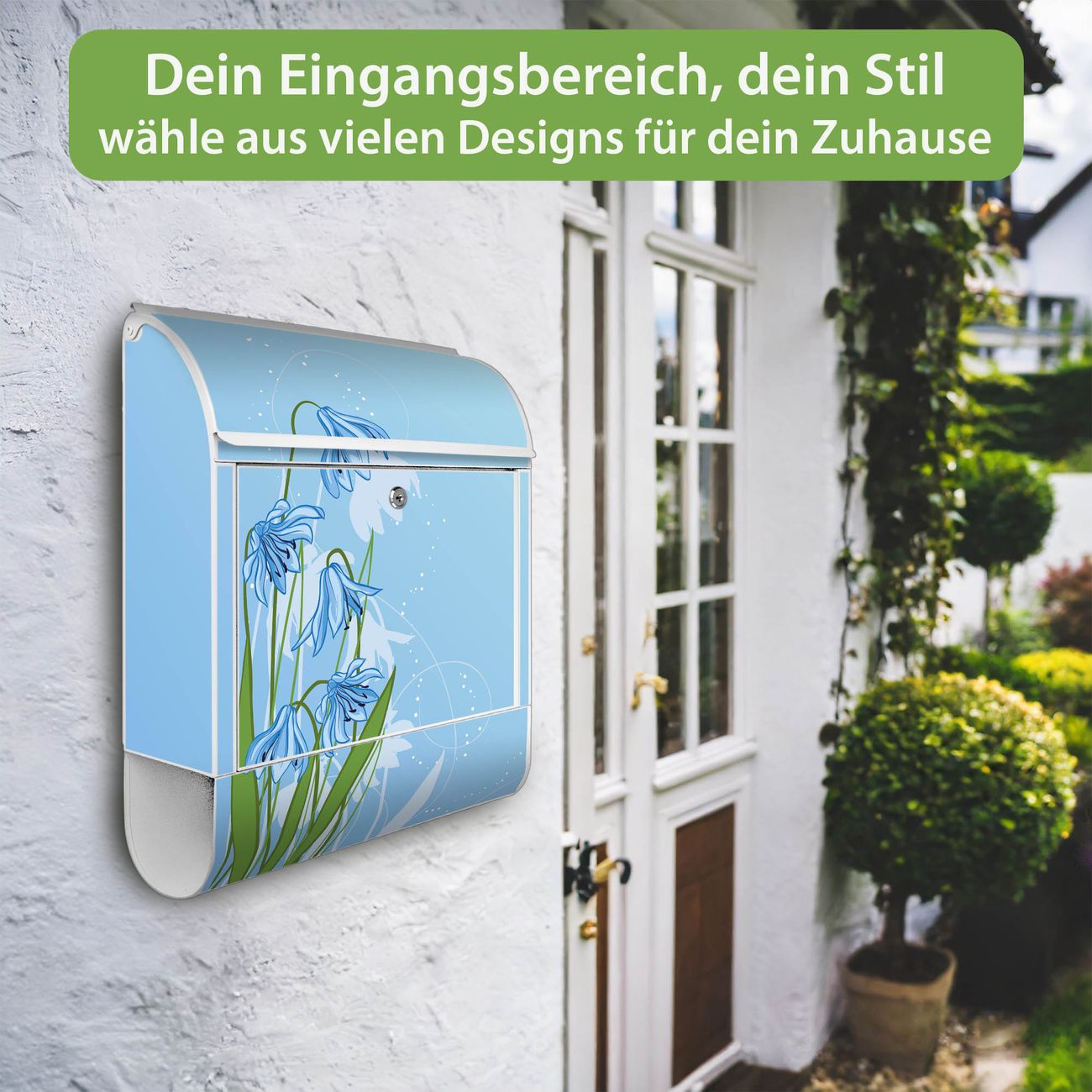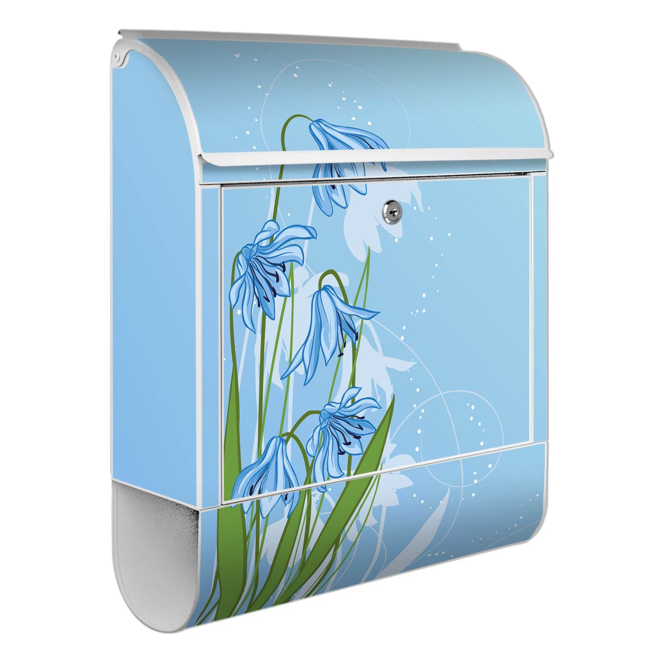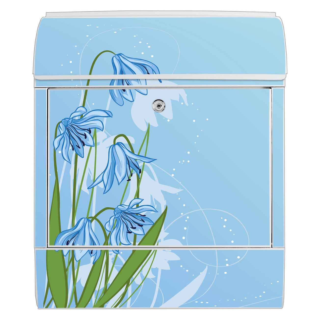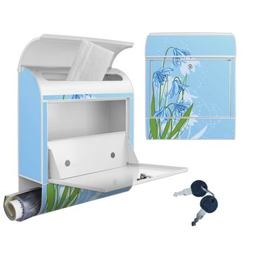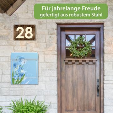 DESIGN: Der Postkasten mit Motiv Motiv Bergblaulilie hat ein sehr ansprechendes und ausgefallenes Design, damit entlocken Sie Ihren Nachbarn und dem Postboten ein Lächeln. Heben Sie Sich von der tristen grauen Masse ab, ohne auf Funktionalität zu verzichten.